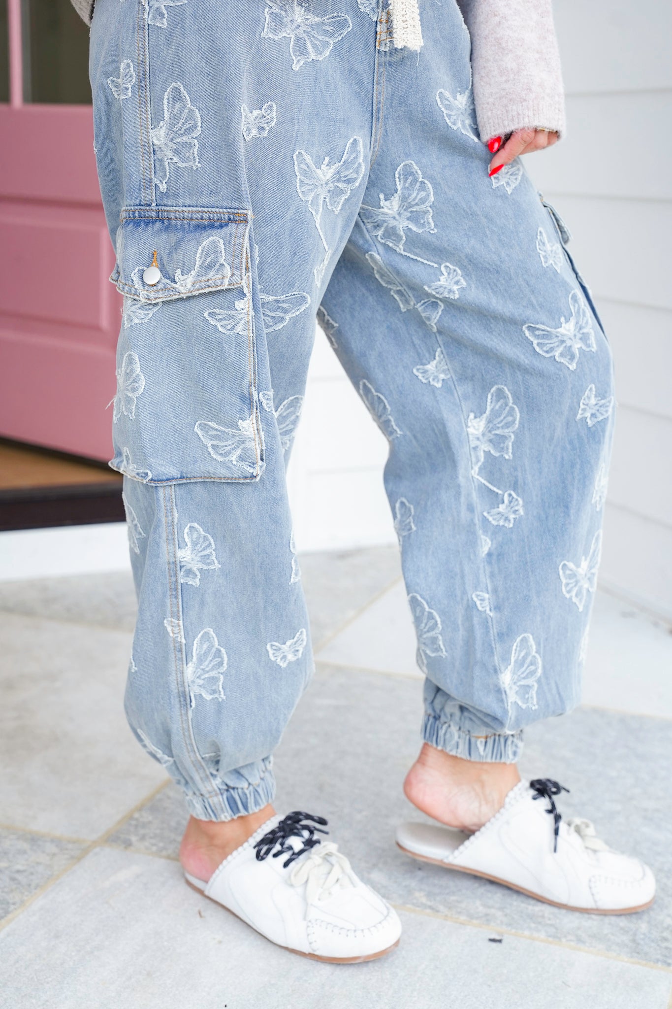 Butterflies are always in style, and these POL denim jogger pants prove it! With their relaxed jogger fit and whimsical embroidered butterfly print, these pants bring playful charm to your everyday look.