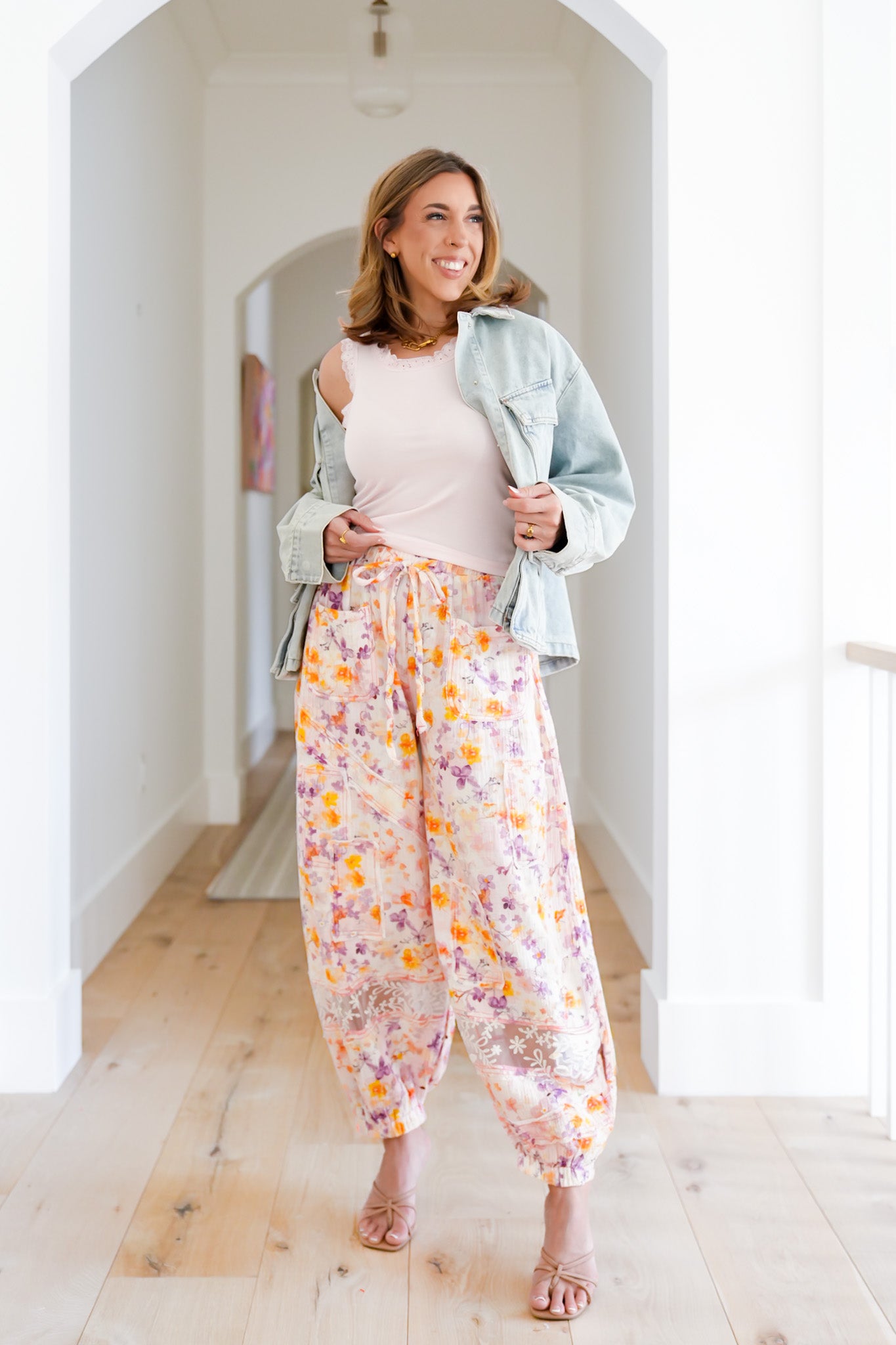 These POL jogger pants are full of movement and personality, mixing a floaty floral gauze with delicate lace details that feel playful and eye-catching. They’re lightweight and easygoing, perfect for warm days when you want something that feels light but still looks styled. The relaxed jogger silhouette keeps things casual, while the lace panel adds that extra little moment that makes them stand out.