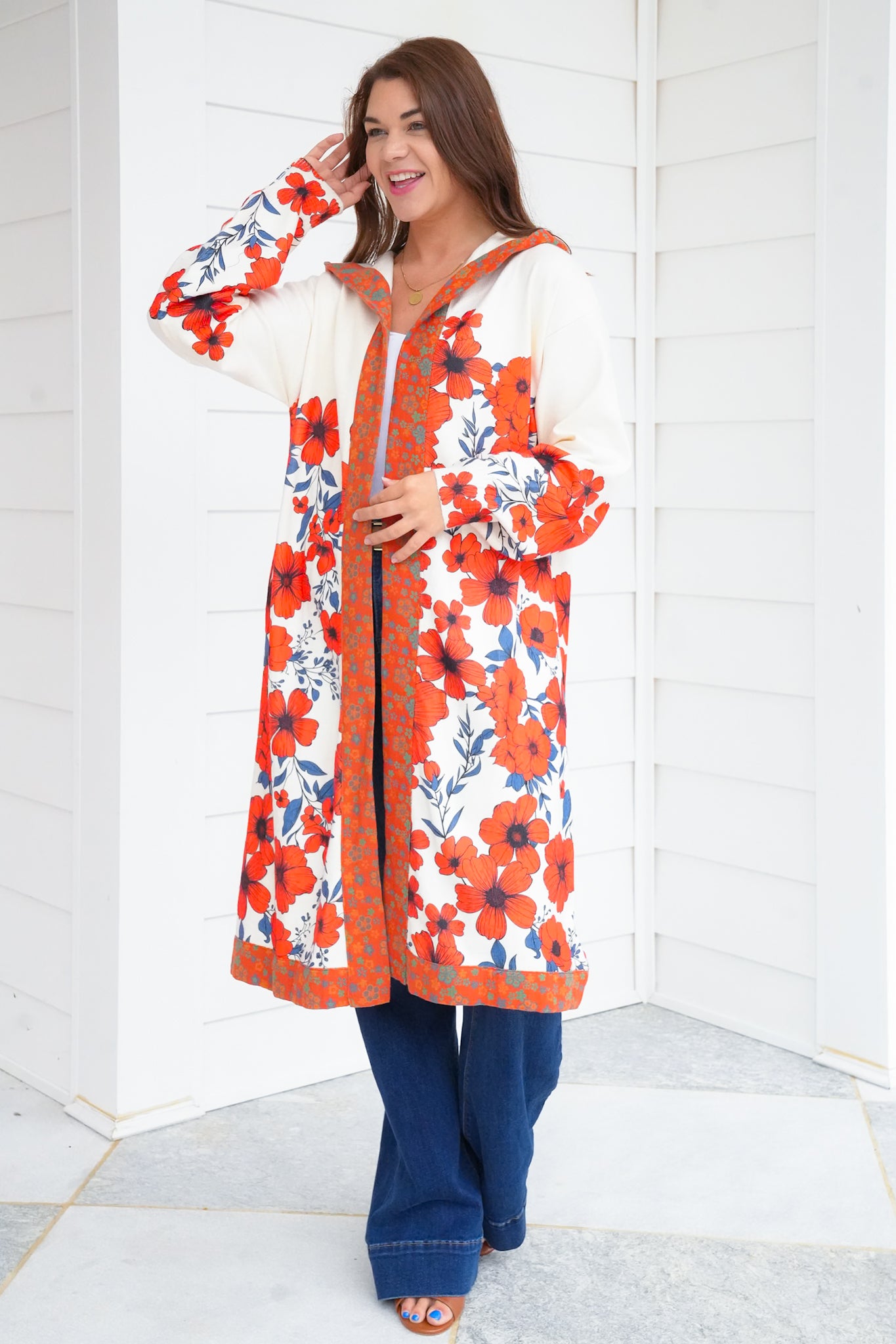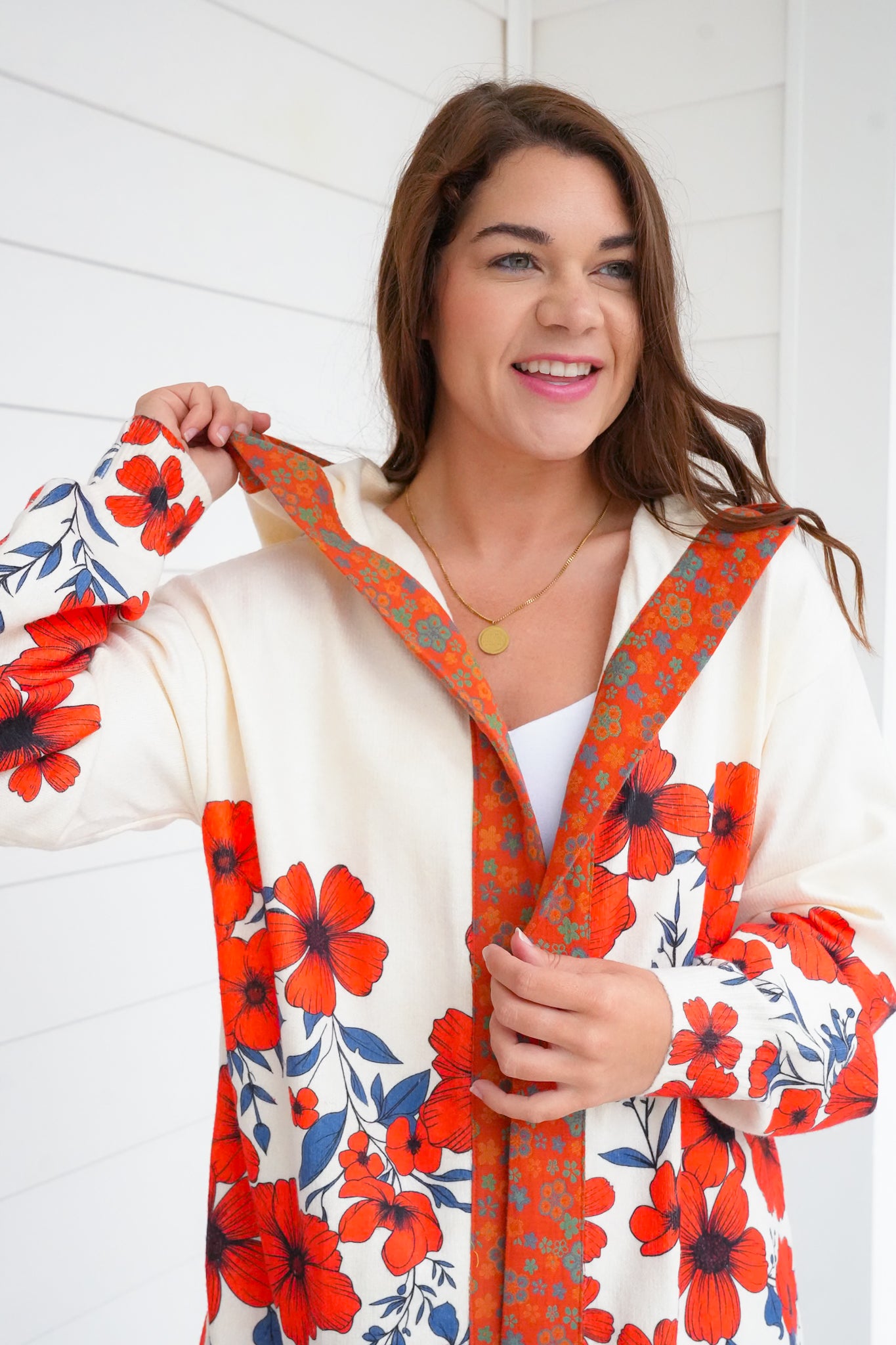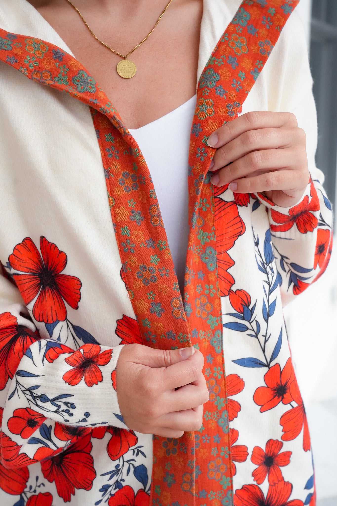 This cardigan is a true statement piece. The eye-catching floral print brings color and personality to even the simplest jeans-and-tee combo, while the hoodie detail keeps the look playful and fresh. Lightweight enough to wear year-round yet cozy for cooler days, it’s the cardigan you’ll reach for to add instant charm to your everyday style.