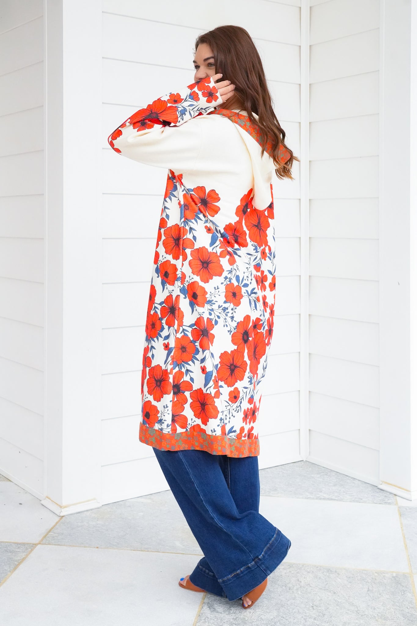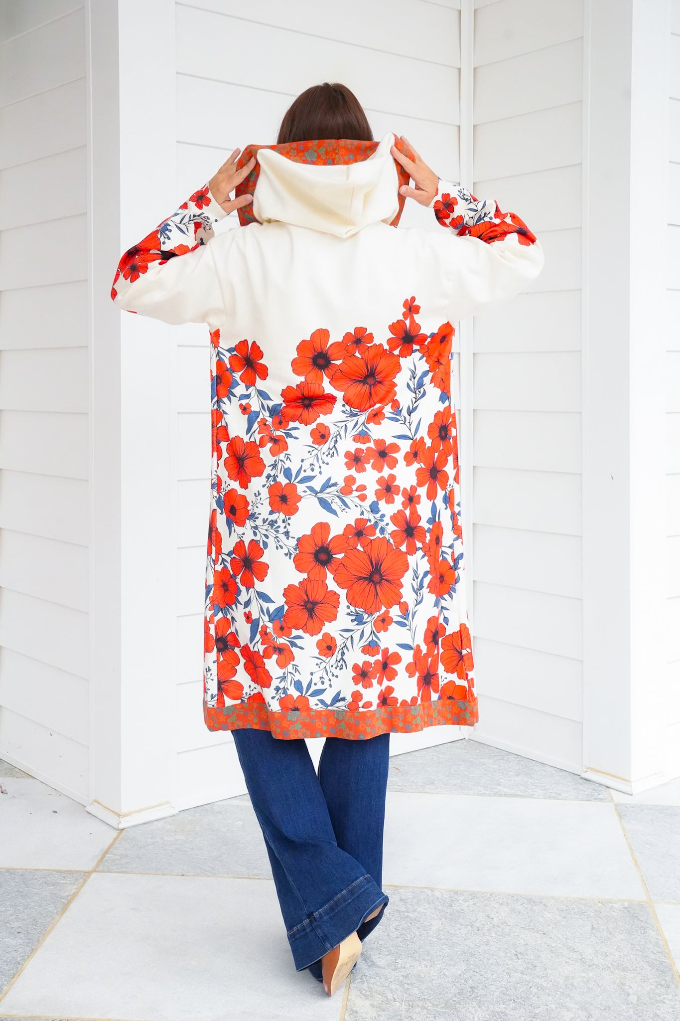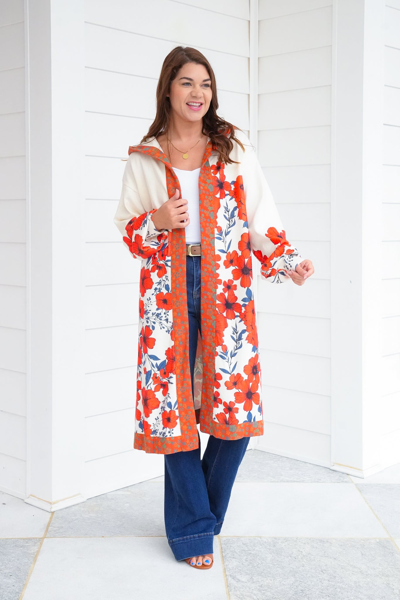 This cardigan is a true statement piece. The eye-catching floral print brings color and personality to even the simplest jeans-and-tee combo, while the hoodie detail keeps the look playful and fresh. Lightweight enough to wear year-round yet cozy for cooler days, it’s the cardigan you’ll reach for to add instant charm to your everyday style.