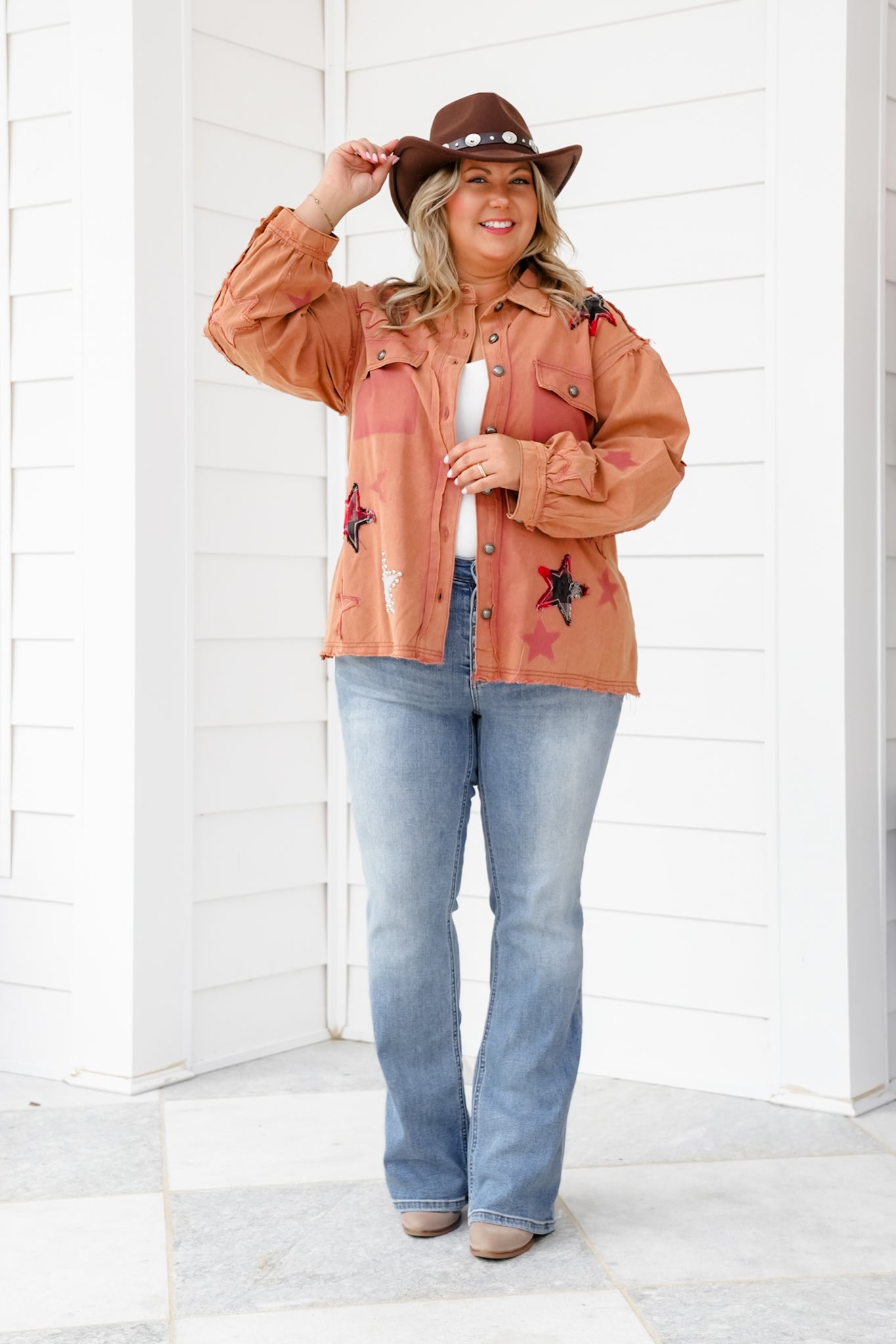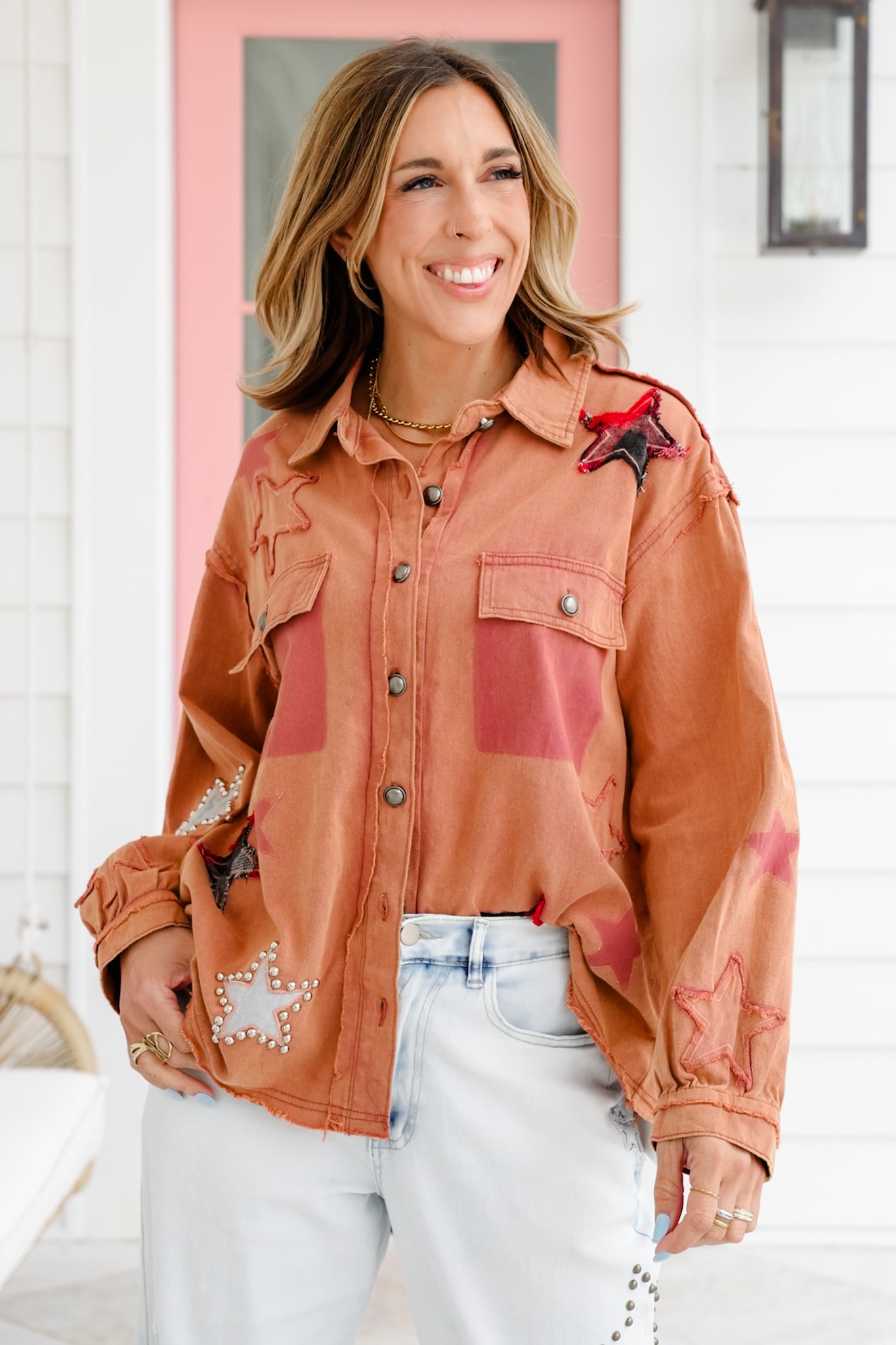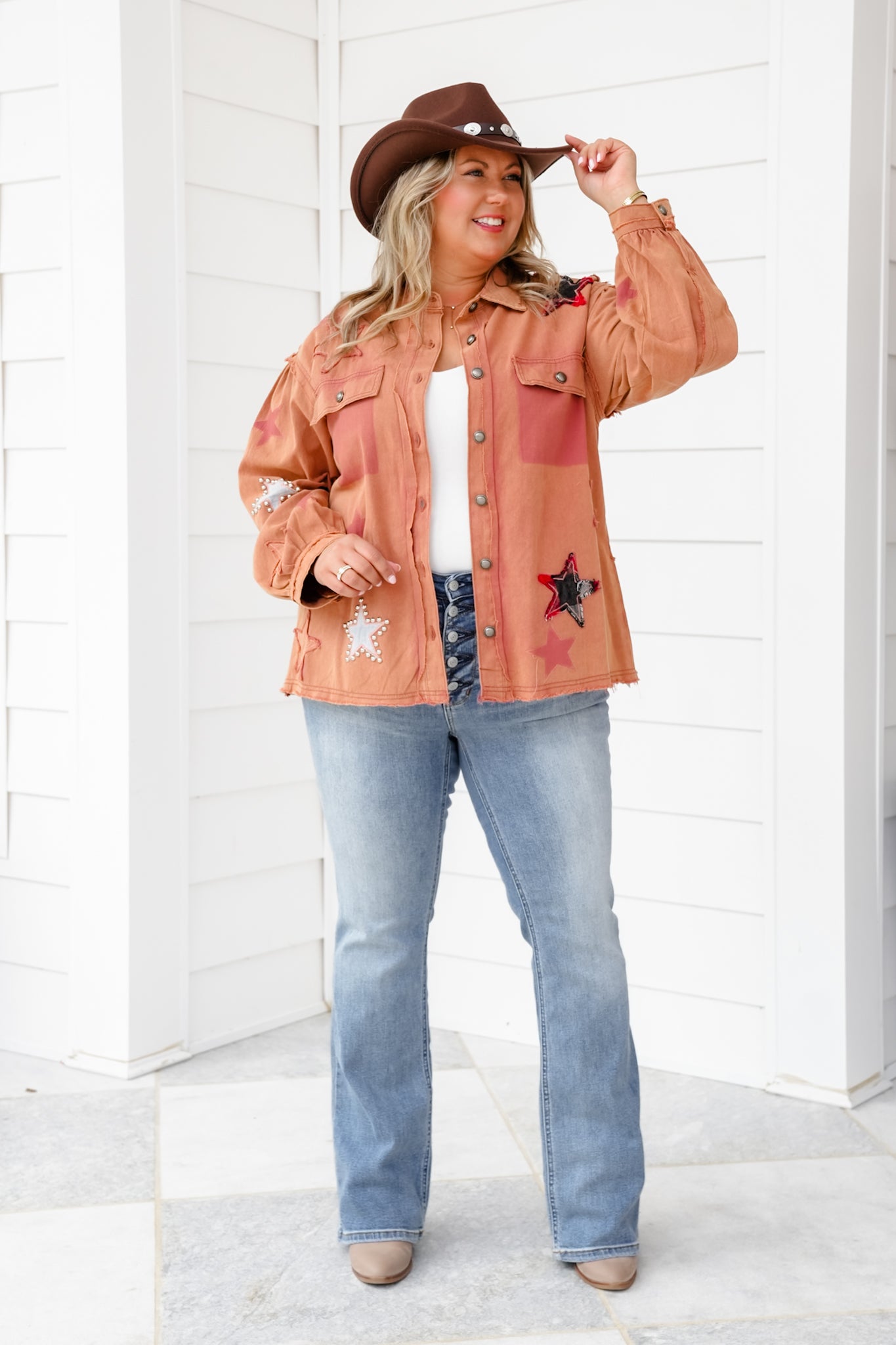 Stars are always trending, and this shacket is no exception! With a vintage wash and standout appliqué detailing, this piece is equal parts comfy and statement-making. Toss it over leggings for a casual coffee run or pair it with distressed denim and sneakers for weekend fun.