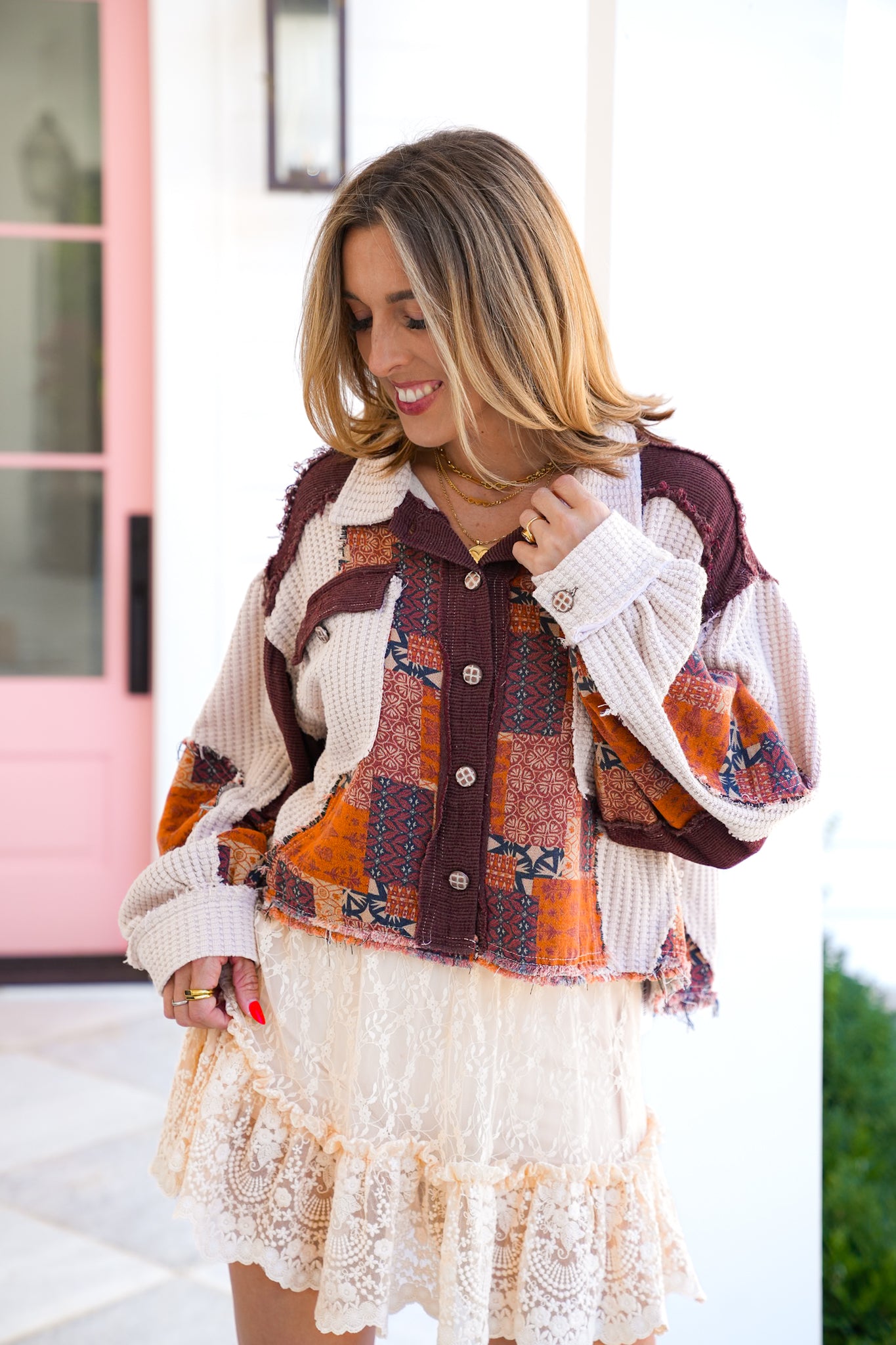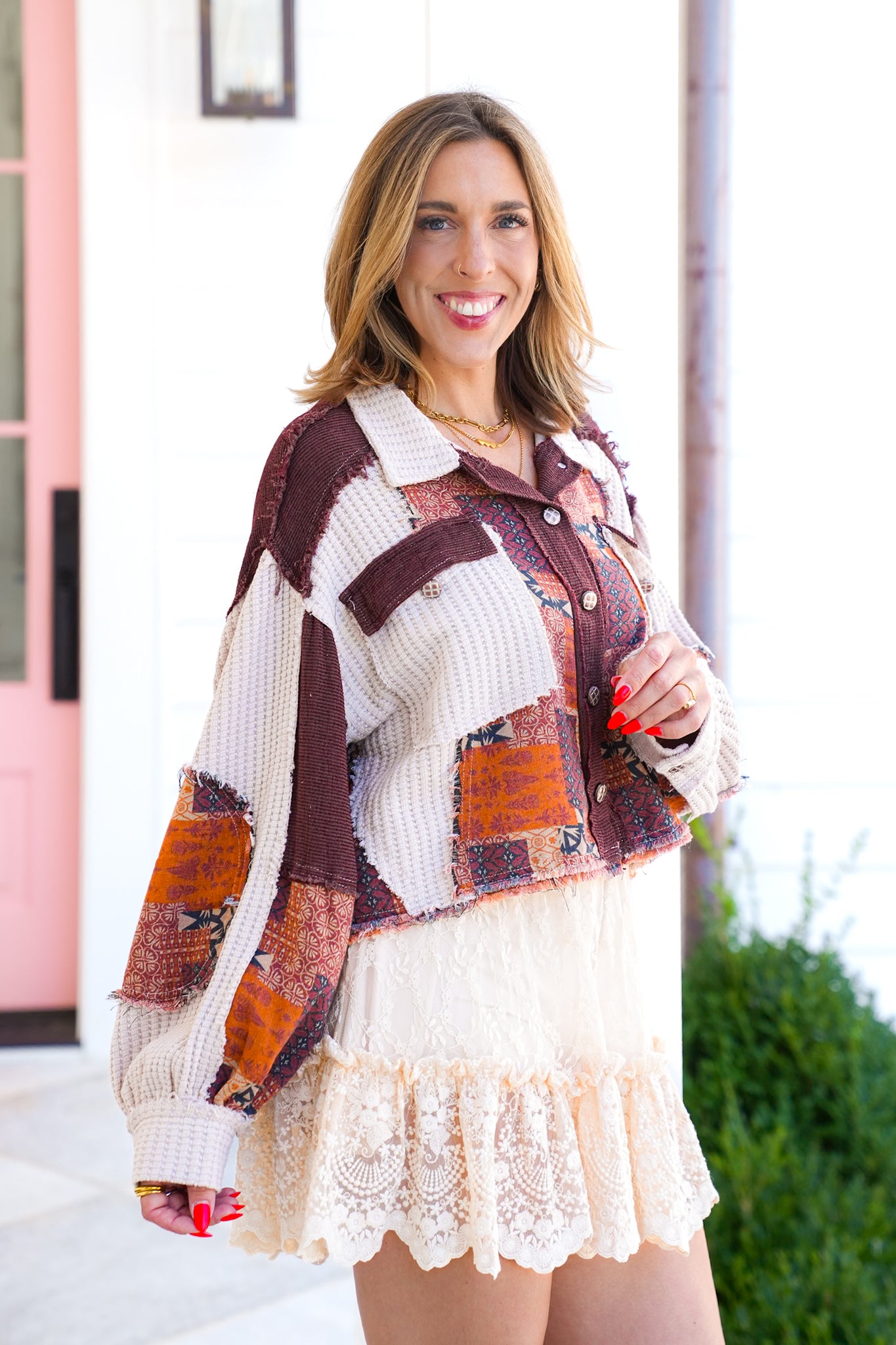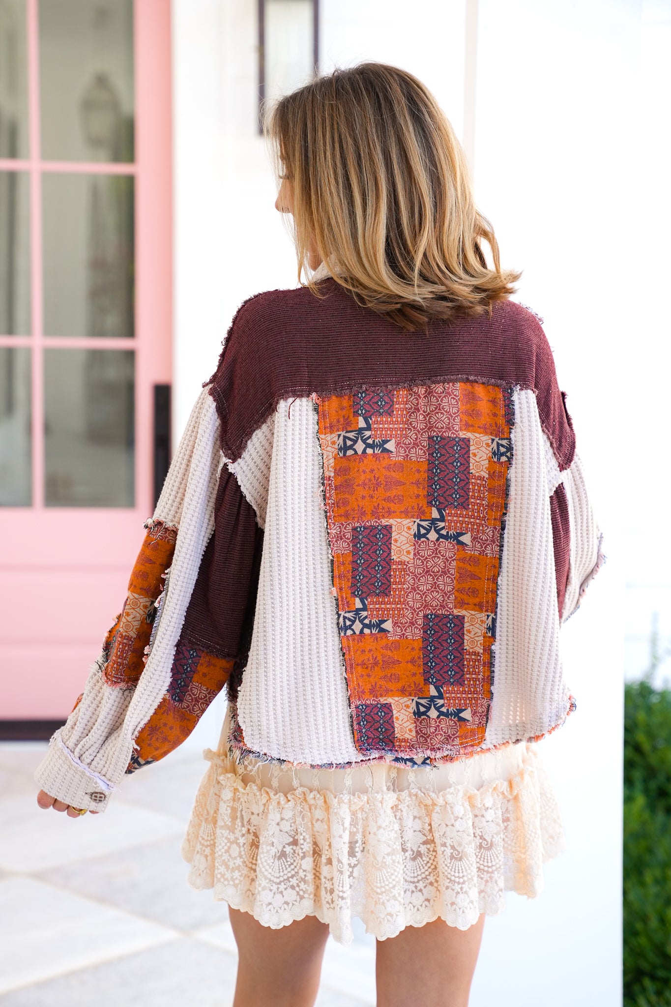 This shacket brings all the boho vibes with its patchwork design and cropped cut. Style it over a lace dress for an eclectic mix, or pair with wide-leg denim and boots for an easy everyday look. It’s the kind of layer that instantly makes your outfit feel unique.
