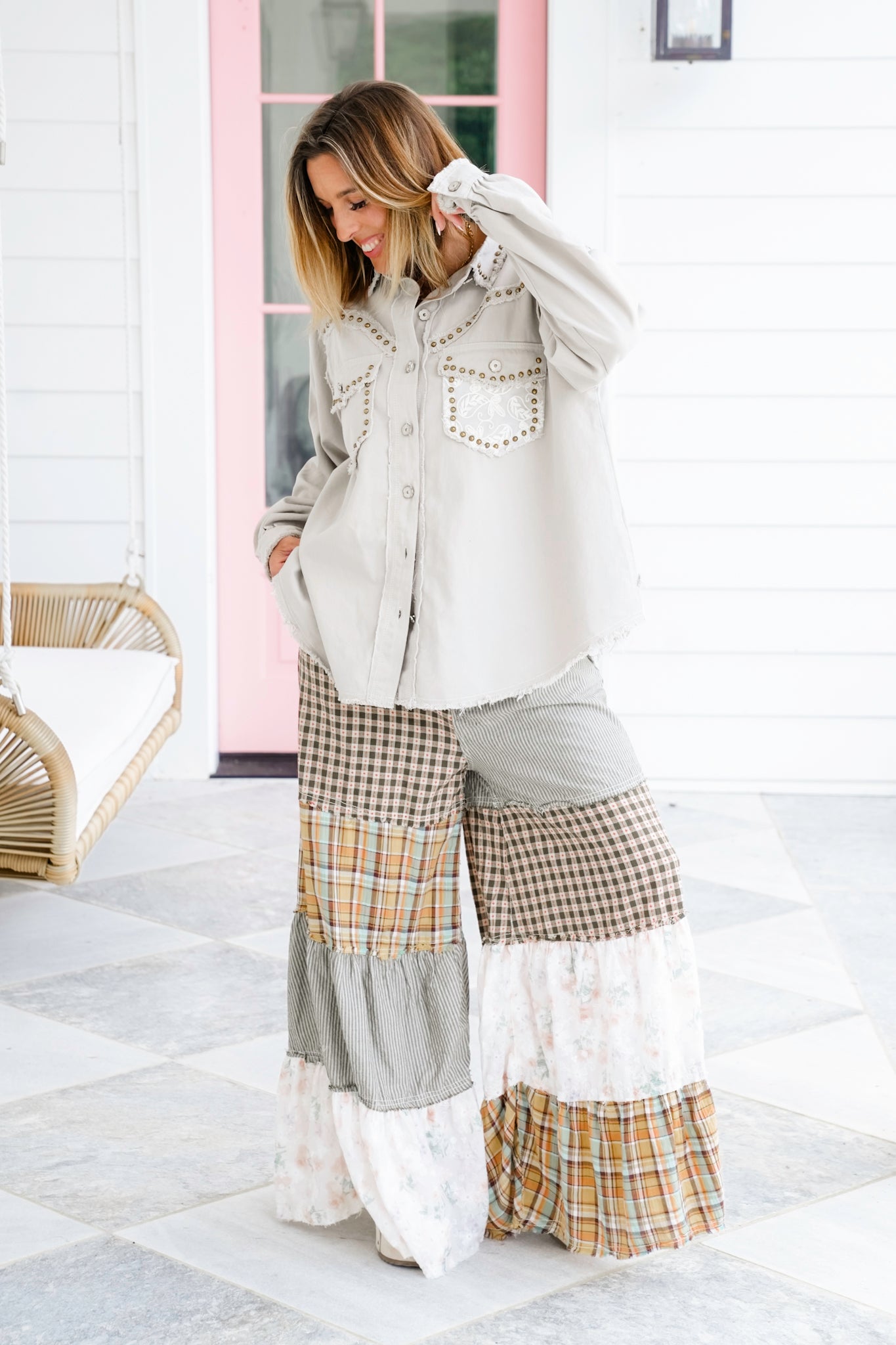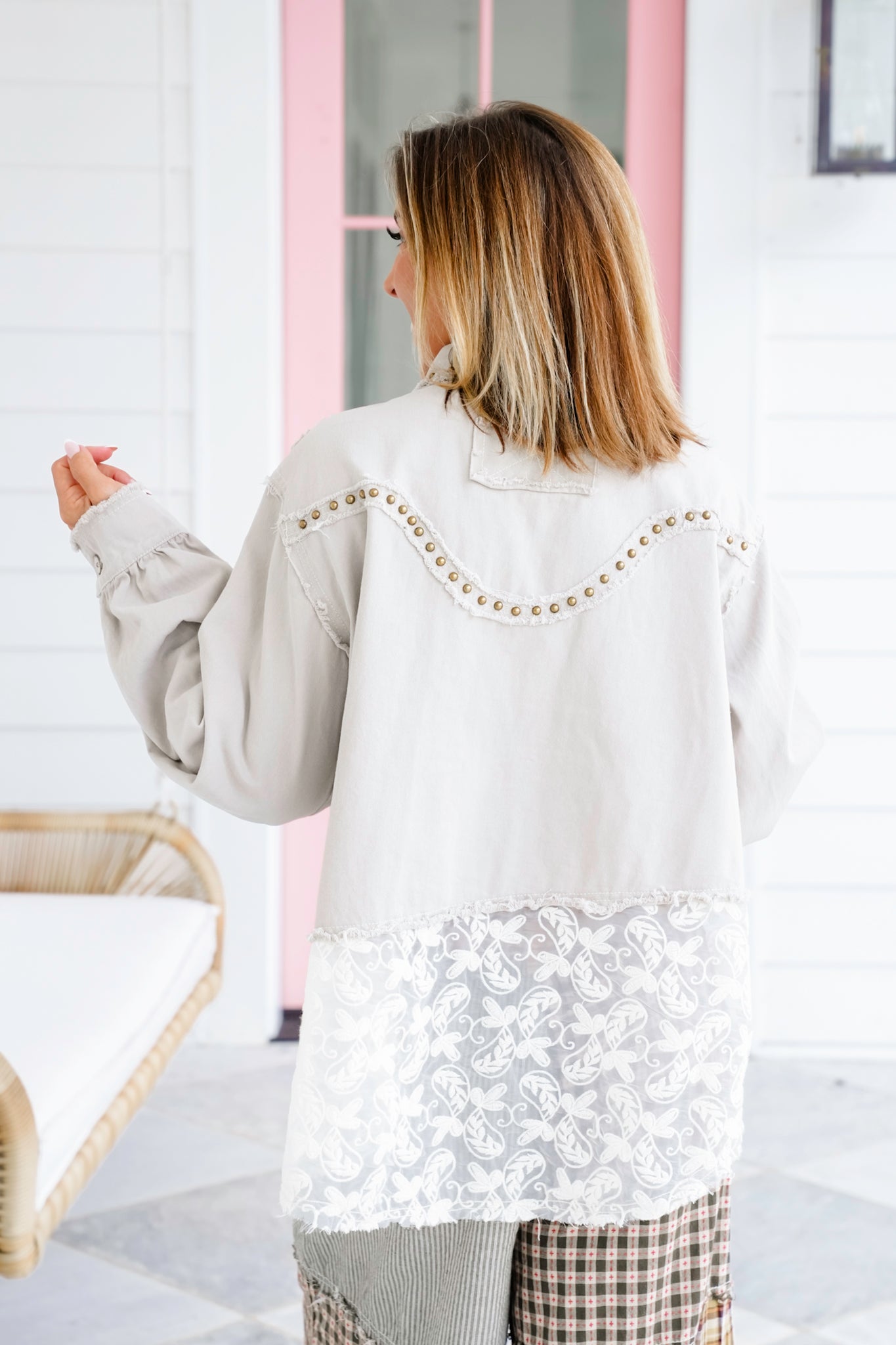 This shacket is all about mixing sweet and bold with its lace trim paired against eye-catching studs. The raw edges and floral buttons give it that signature POL charm, making it a total standout layering piece.