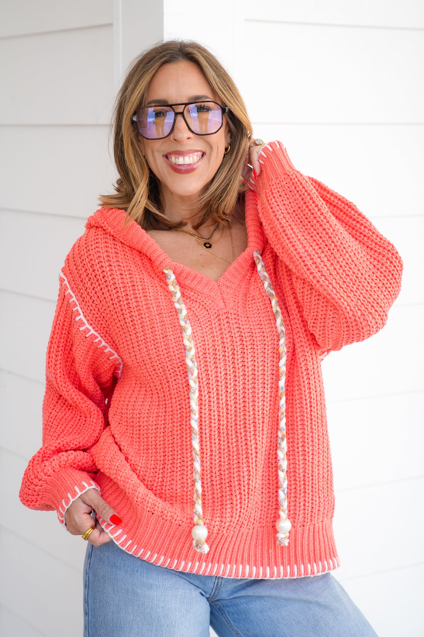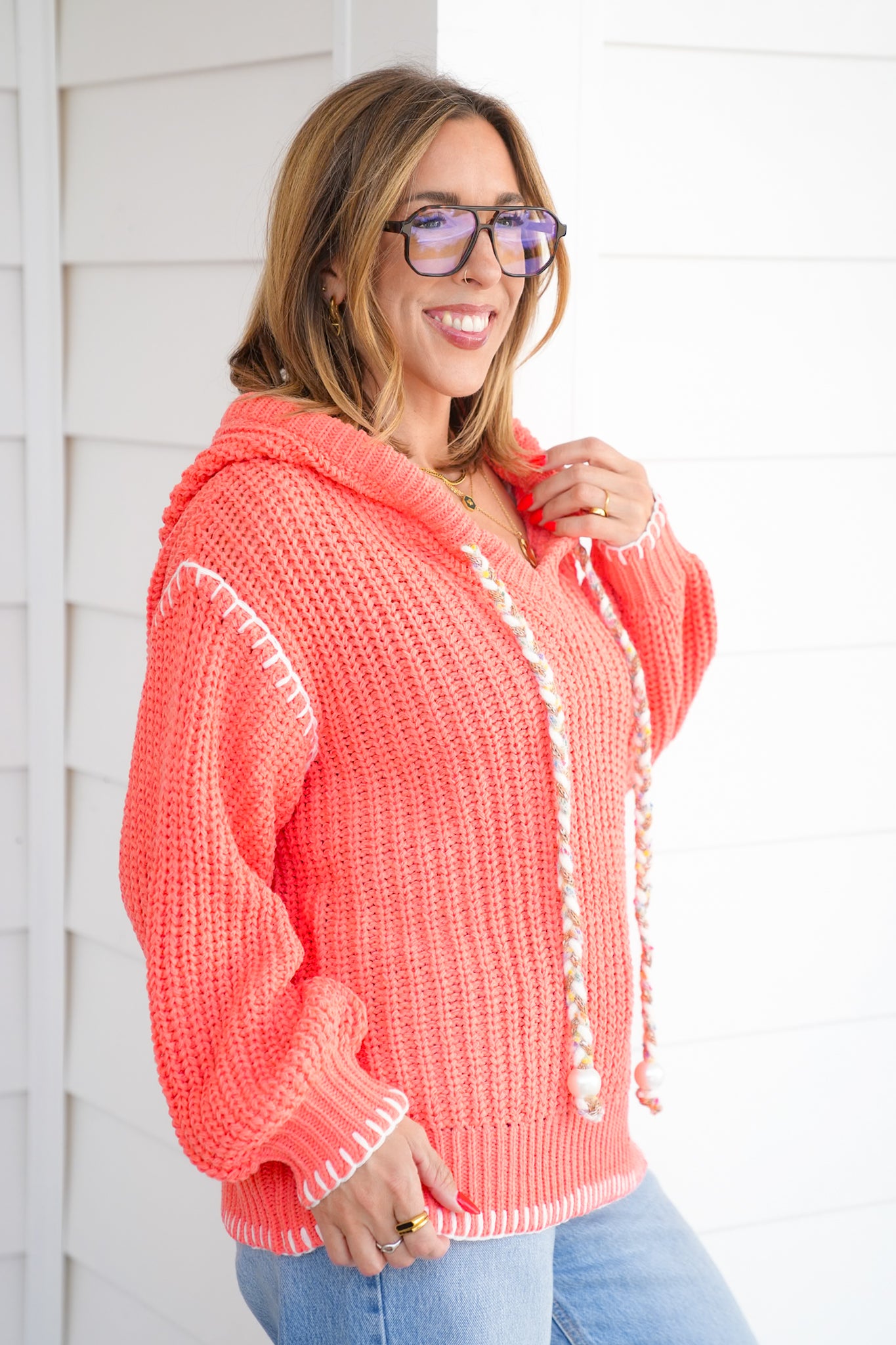 This POL hoodie sweater is a must-have layering piece with a boutique twist. Featuring POL’s signature knit, a slouchy hood, and fun details like contrast stitching and braided drawstrings finished with bead accents, it’s cozy while still chic. Toss it on with jeans for errands, or layer it with leggings for a cozy day in.