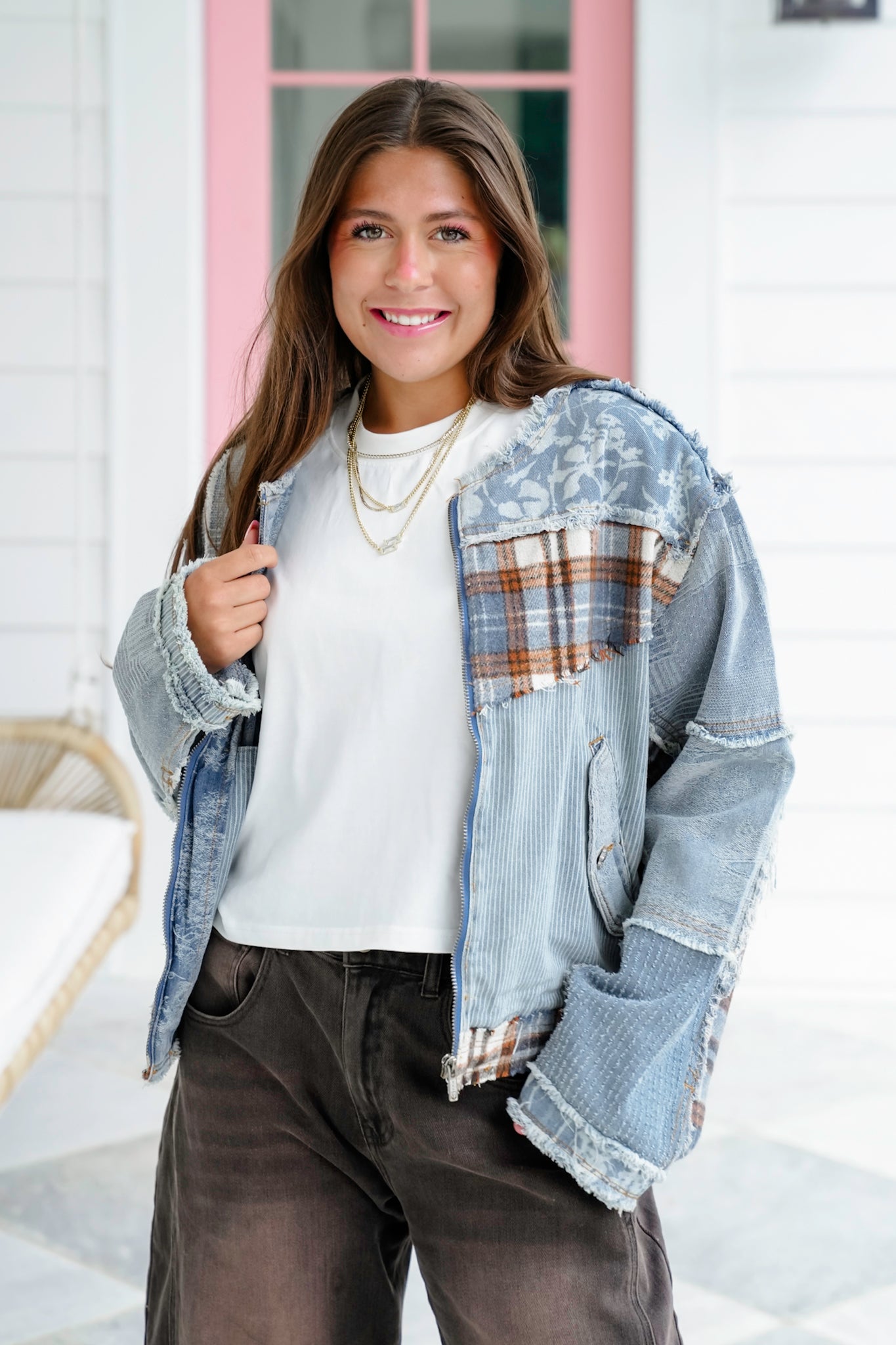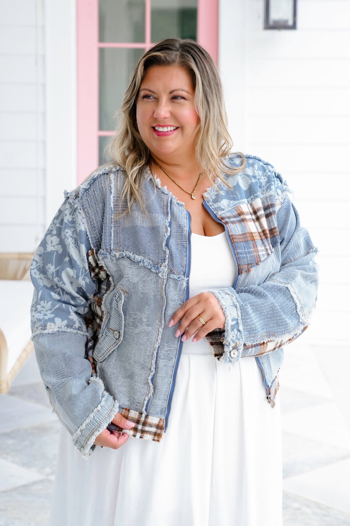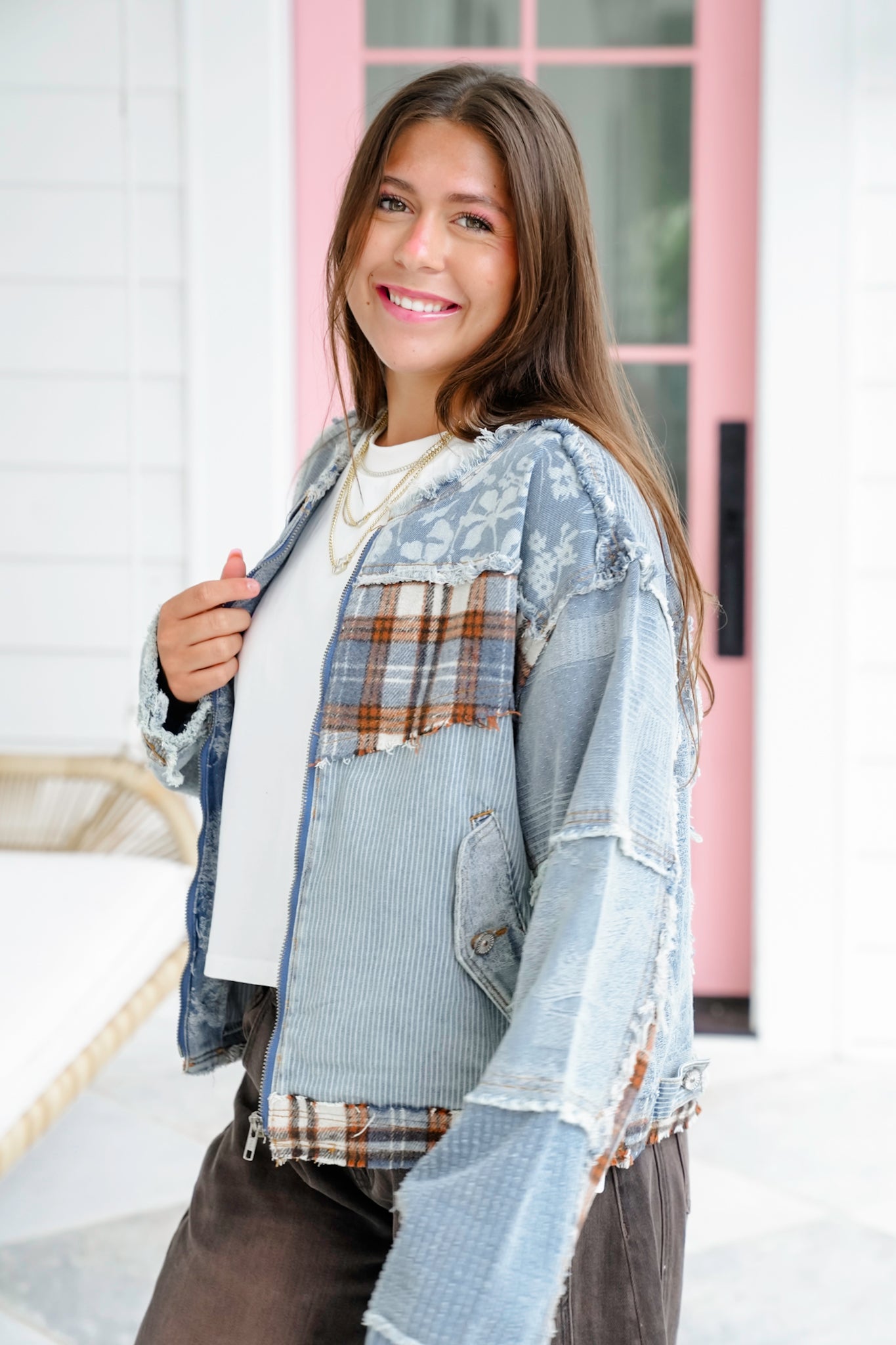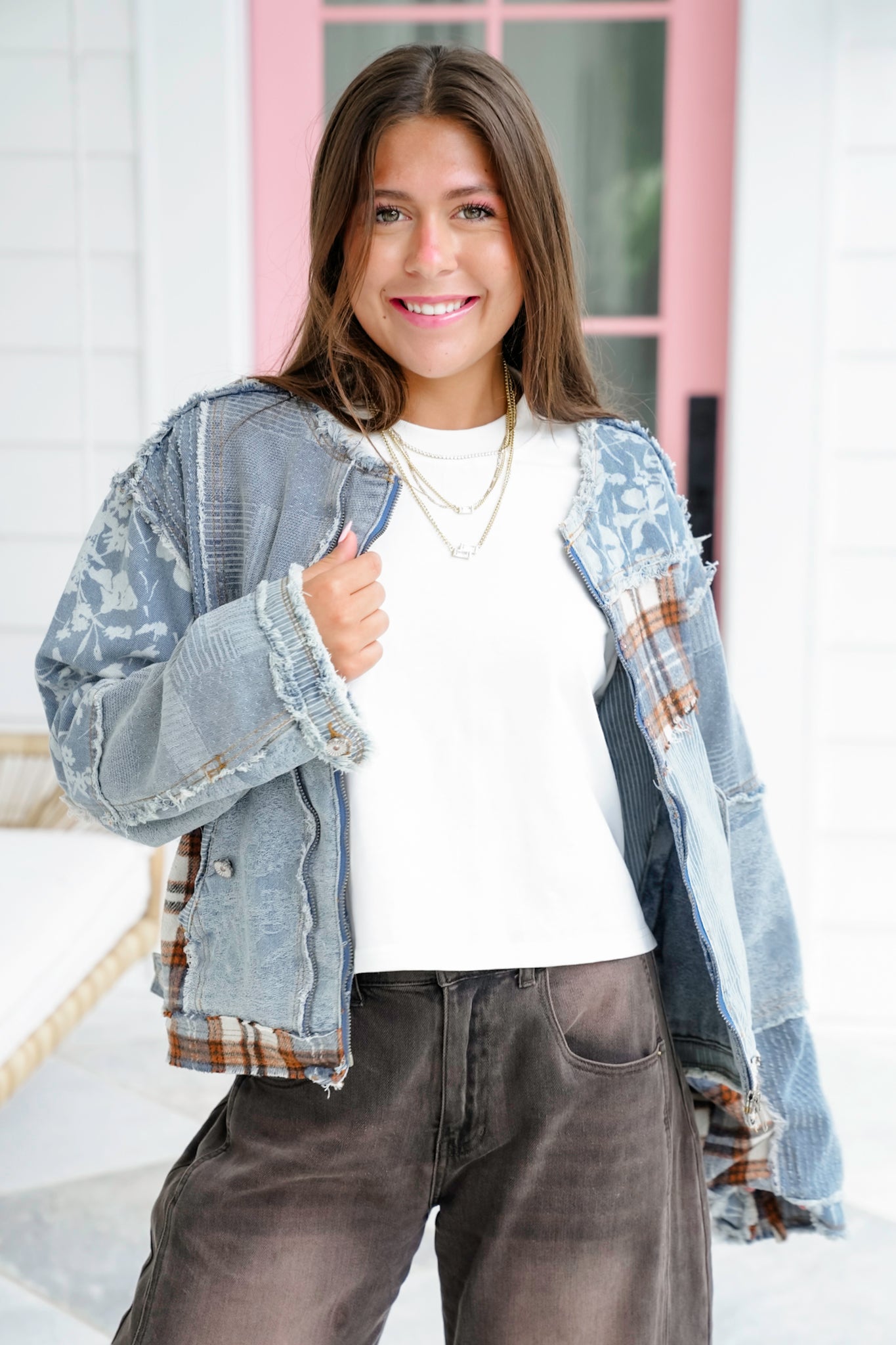 This statement-maker is a whole vibe! A mix of denim, corduroy, flannel, and floral print collide into one bold, edgy, absolutely eye-catching jacket. The frayed seams and patchwork texture give it that vintage, lived-in charm that’s cooler than cool. Throw it on over a graphic tee and distressed denim for weekend errands, or pair it with leggings and boots for a cozy-yet-elevated day out. It’s the jacket everyone will be asking about.