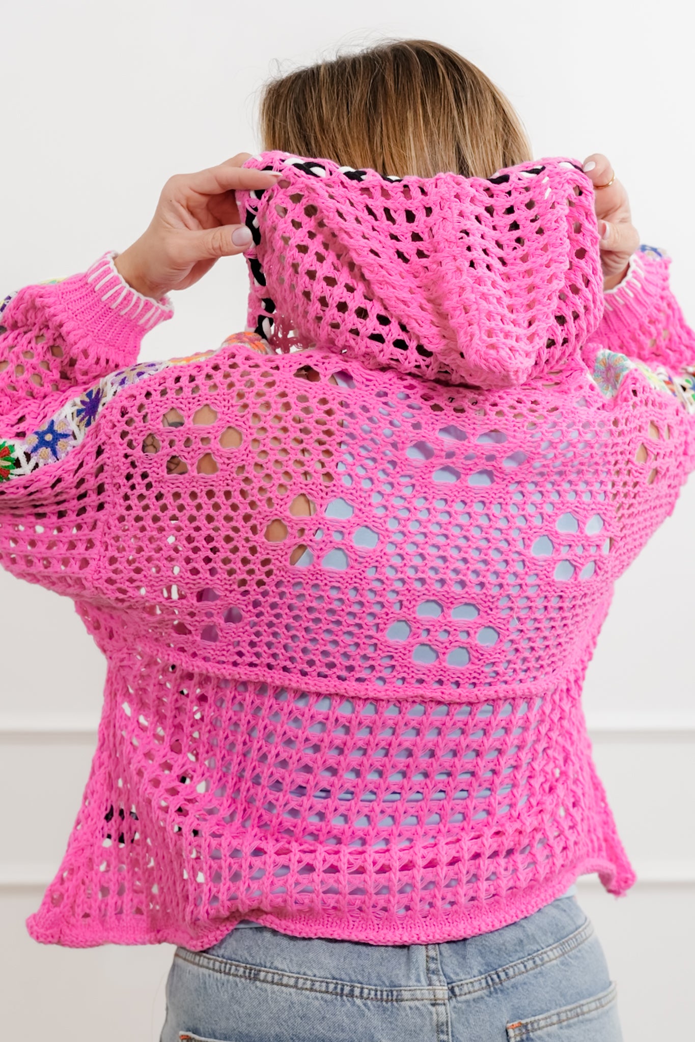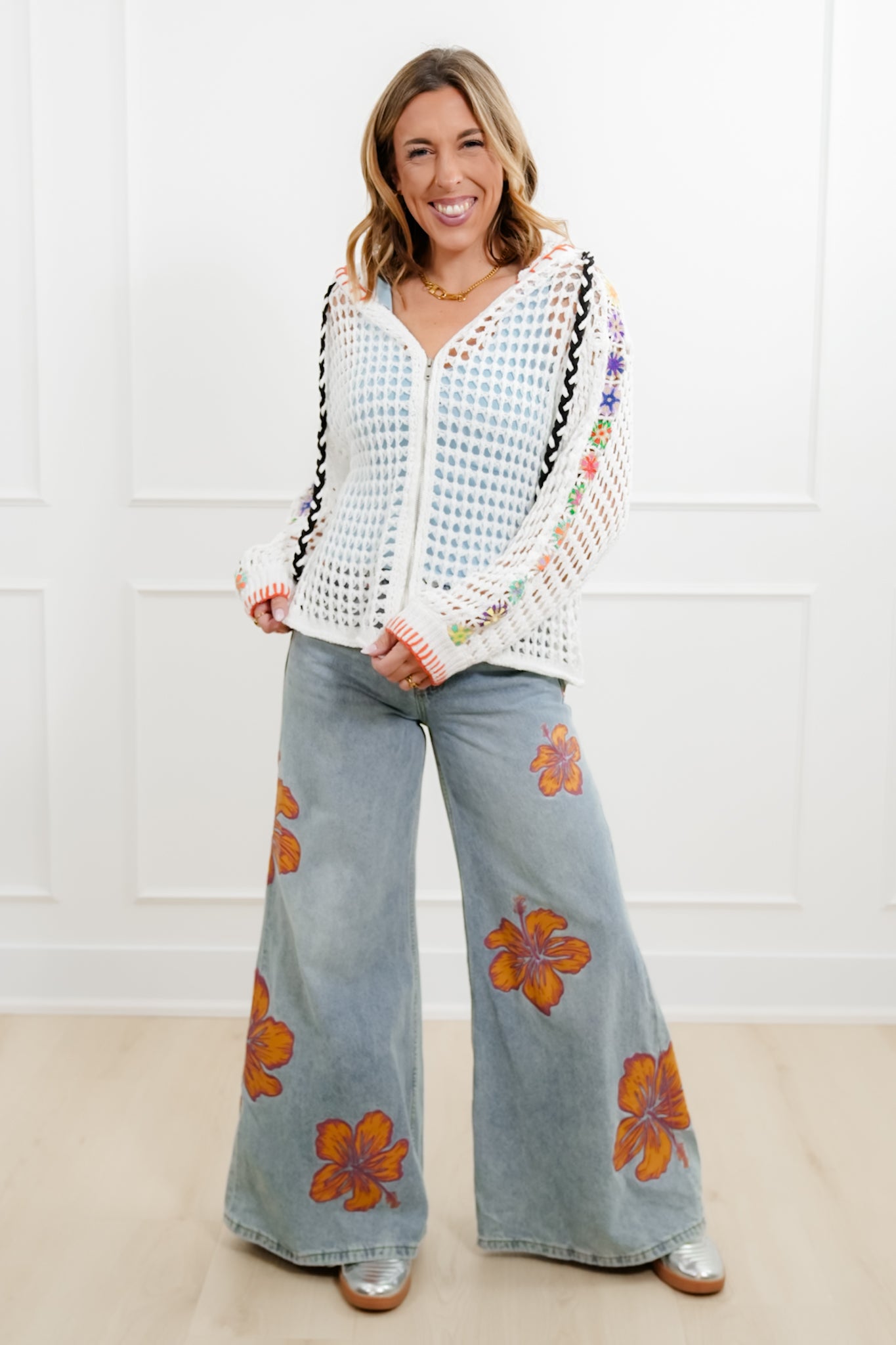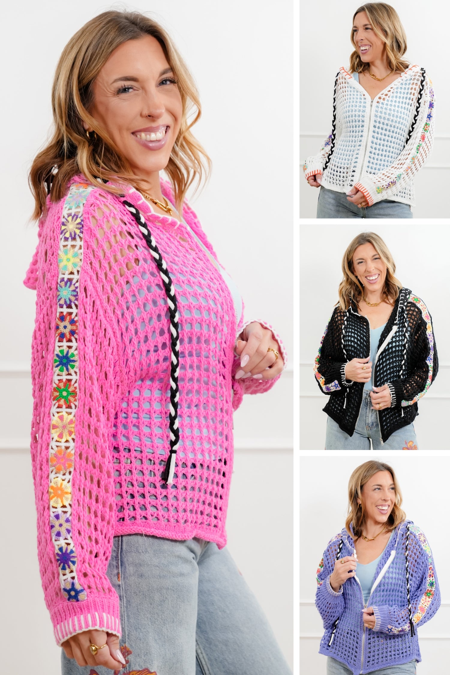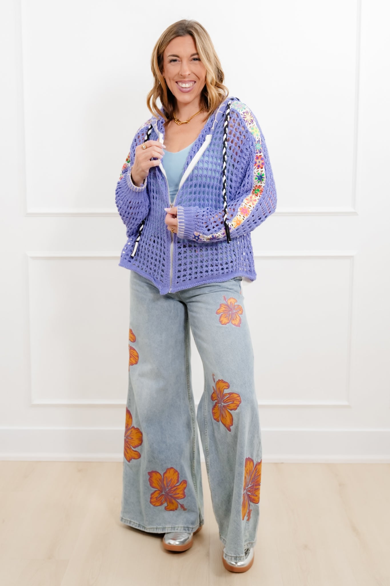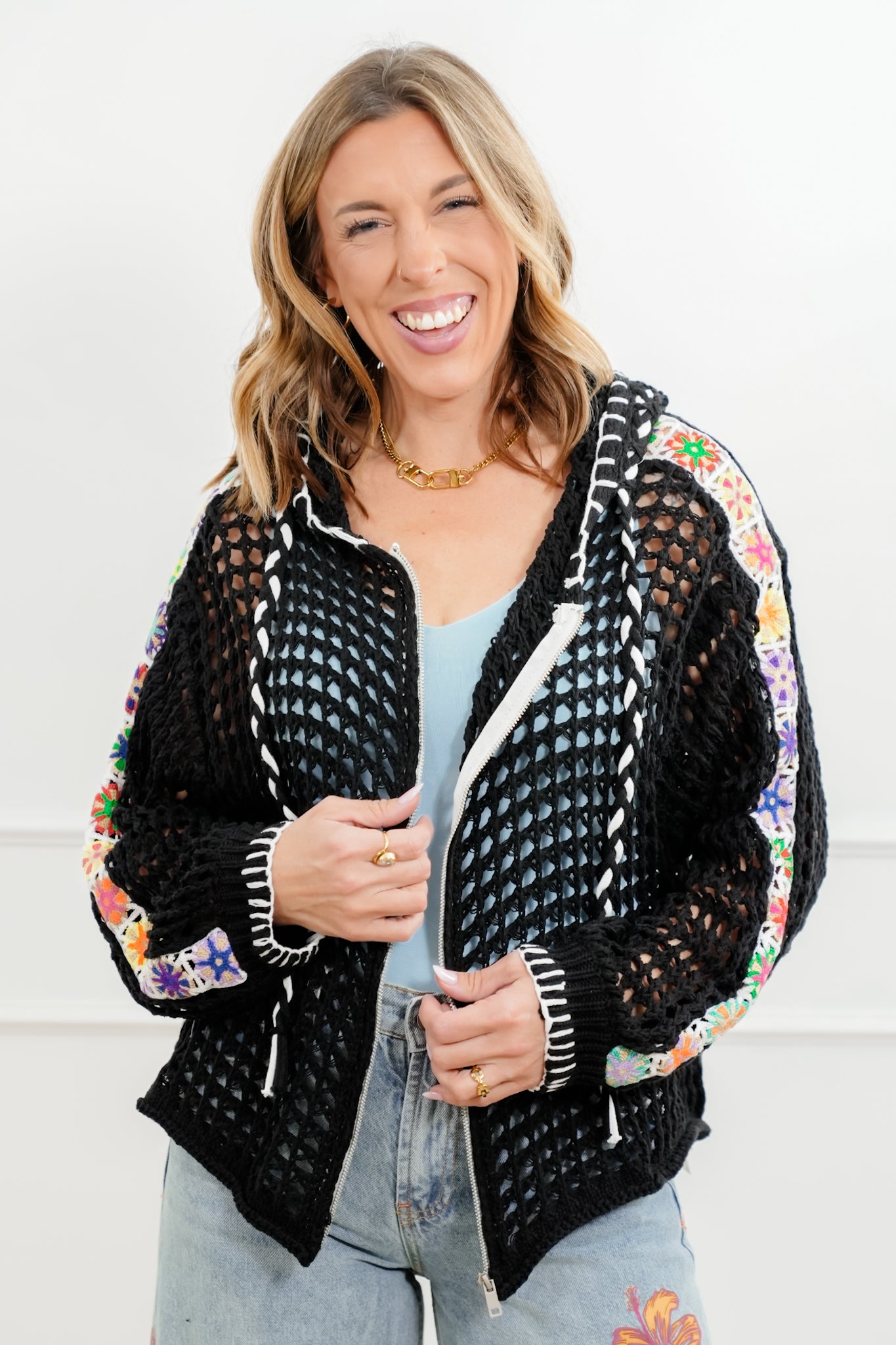 This hoodie sweater is such a standout piece. The open knit design keeps it lightweight and breathable, while all the mixed details give it that special something you don’t see every day. It’s perfect layered over a tank or tee and instantly adds color, texture, and charm to even the simplest outfit.
