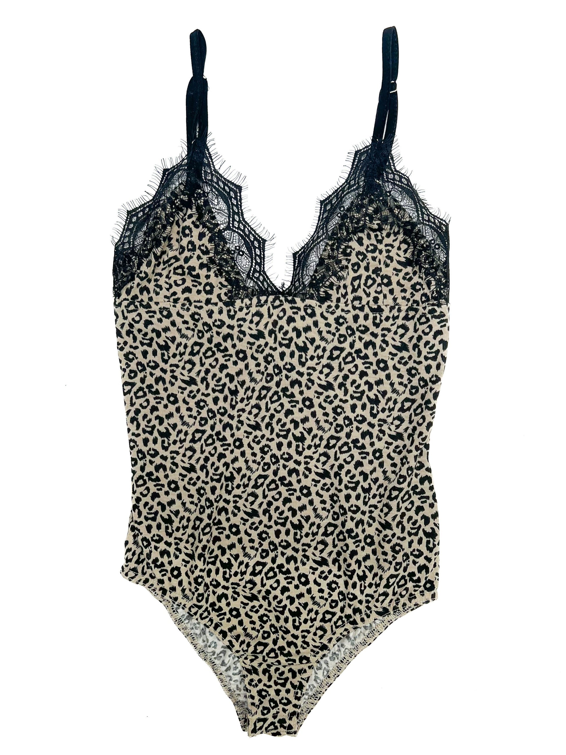 POL Sleeveless V Neck Lace Trim Leopard Print Body Suit
