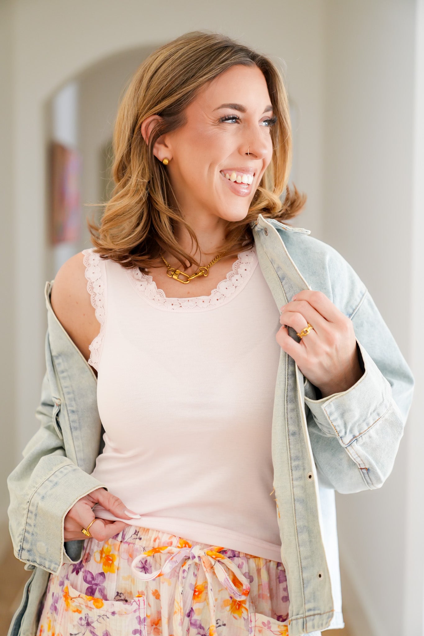 This POL sleeveless tank top is that upgraded basic you’ll reach for again and again. The silky knit feels luxe without being fussy, and the lace trim along the scoop neckline adds just the right touch of femininity. It’s simple, polished, and so easy to dress up or down, perfect layered under jackets and cardigans or worn on its own with denim, skirts, or flowy pants.