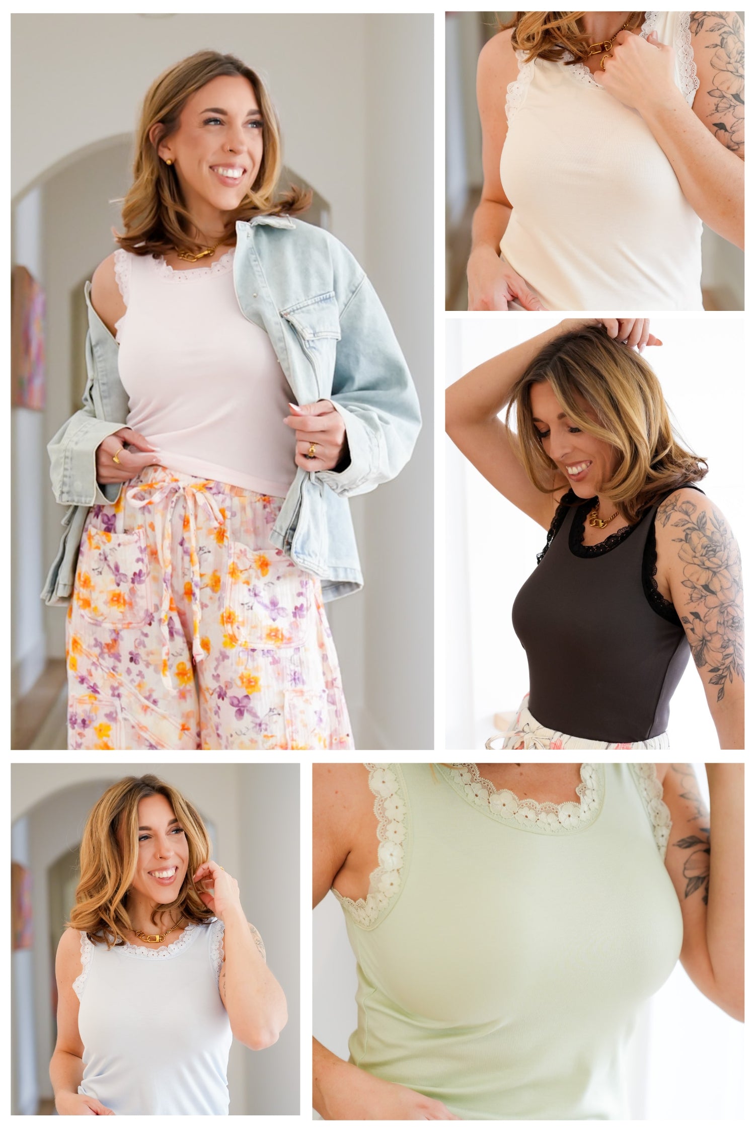 POL Solid Sleeveless Scoop Neck Tank Top with Lace Trim