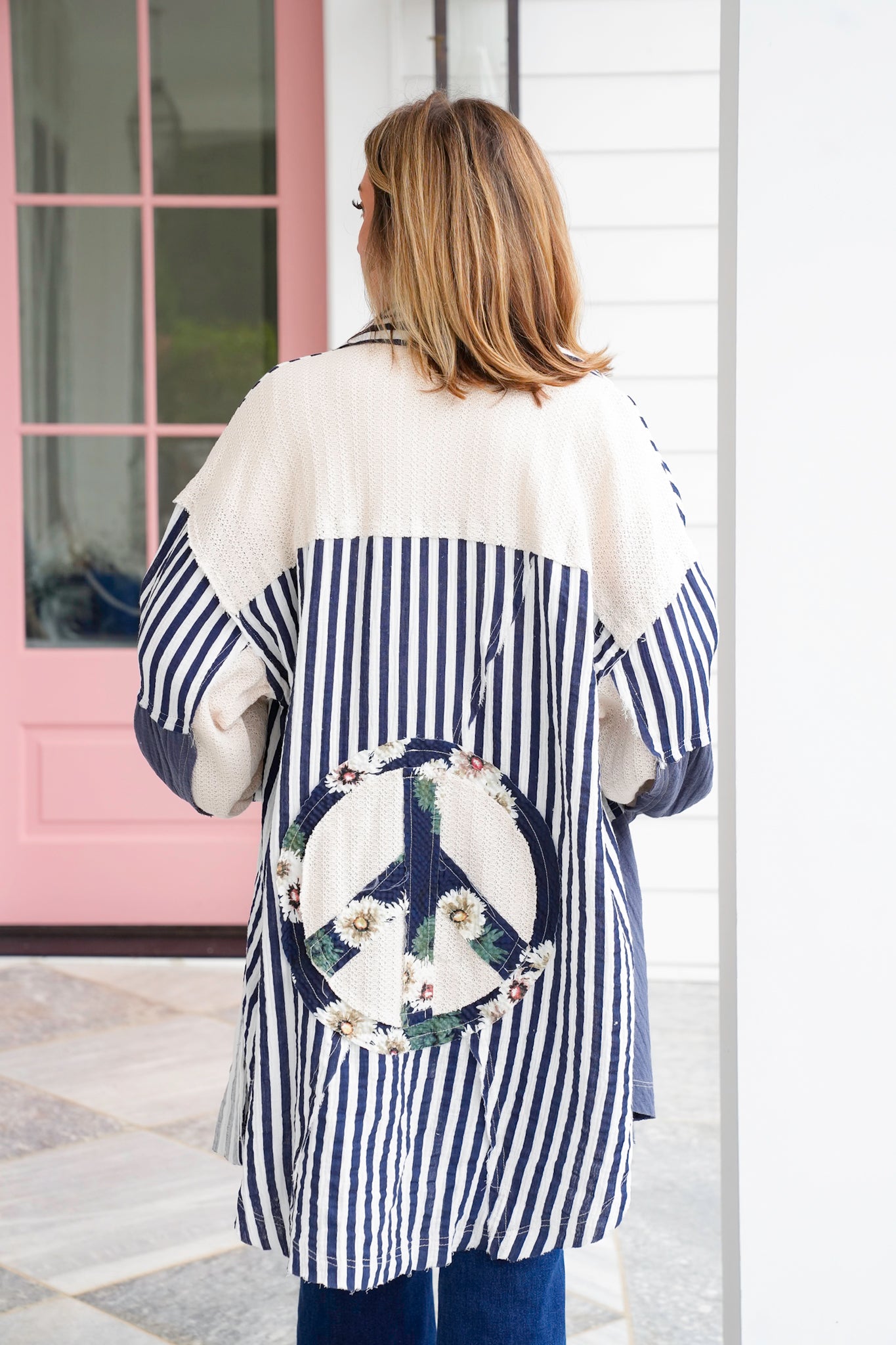 POL Stripe Long Sleeve Button Up Top with Peace Symbol