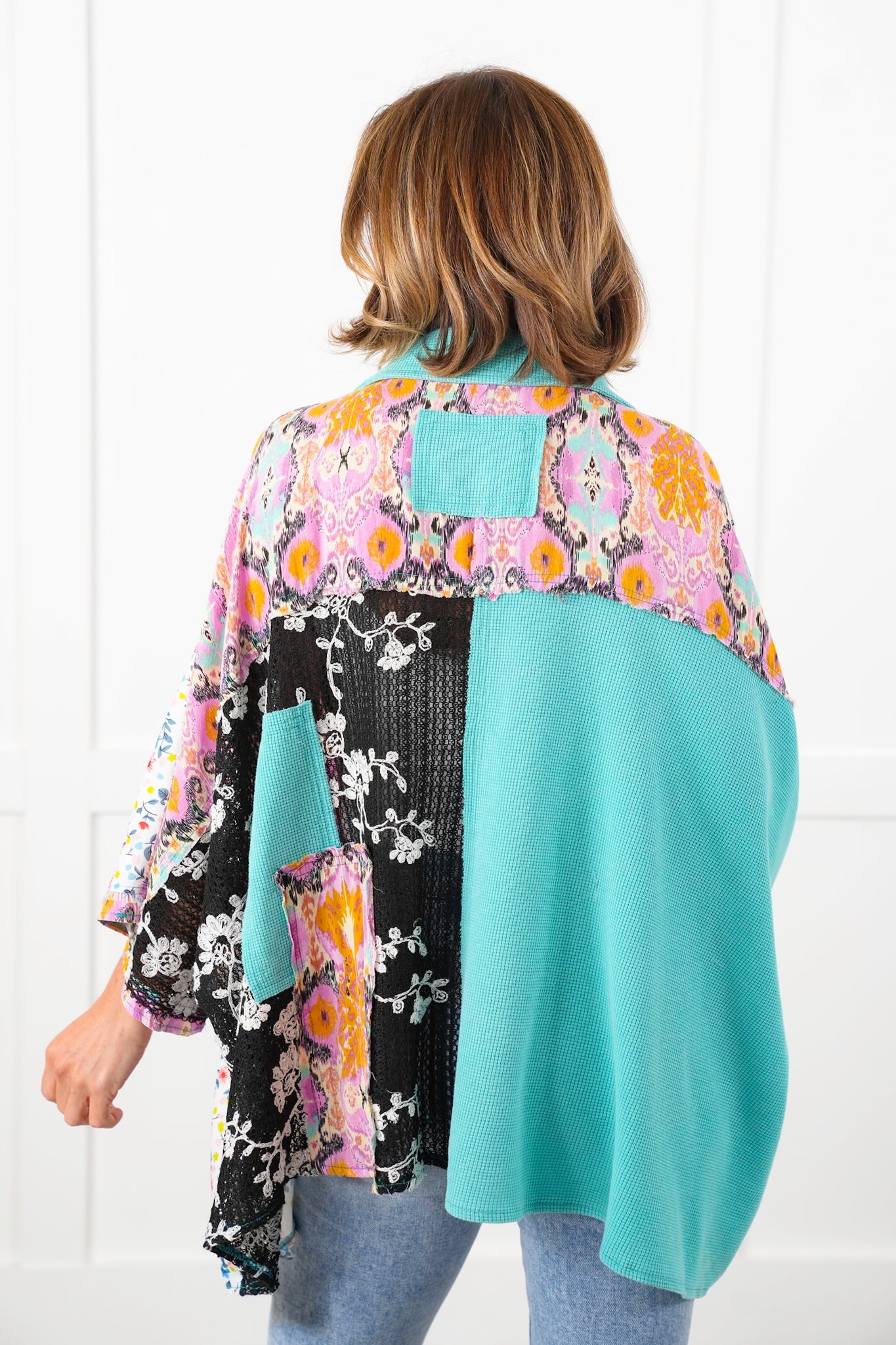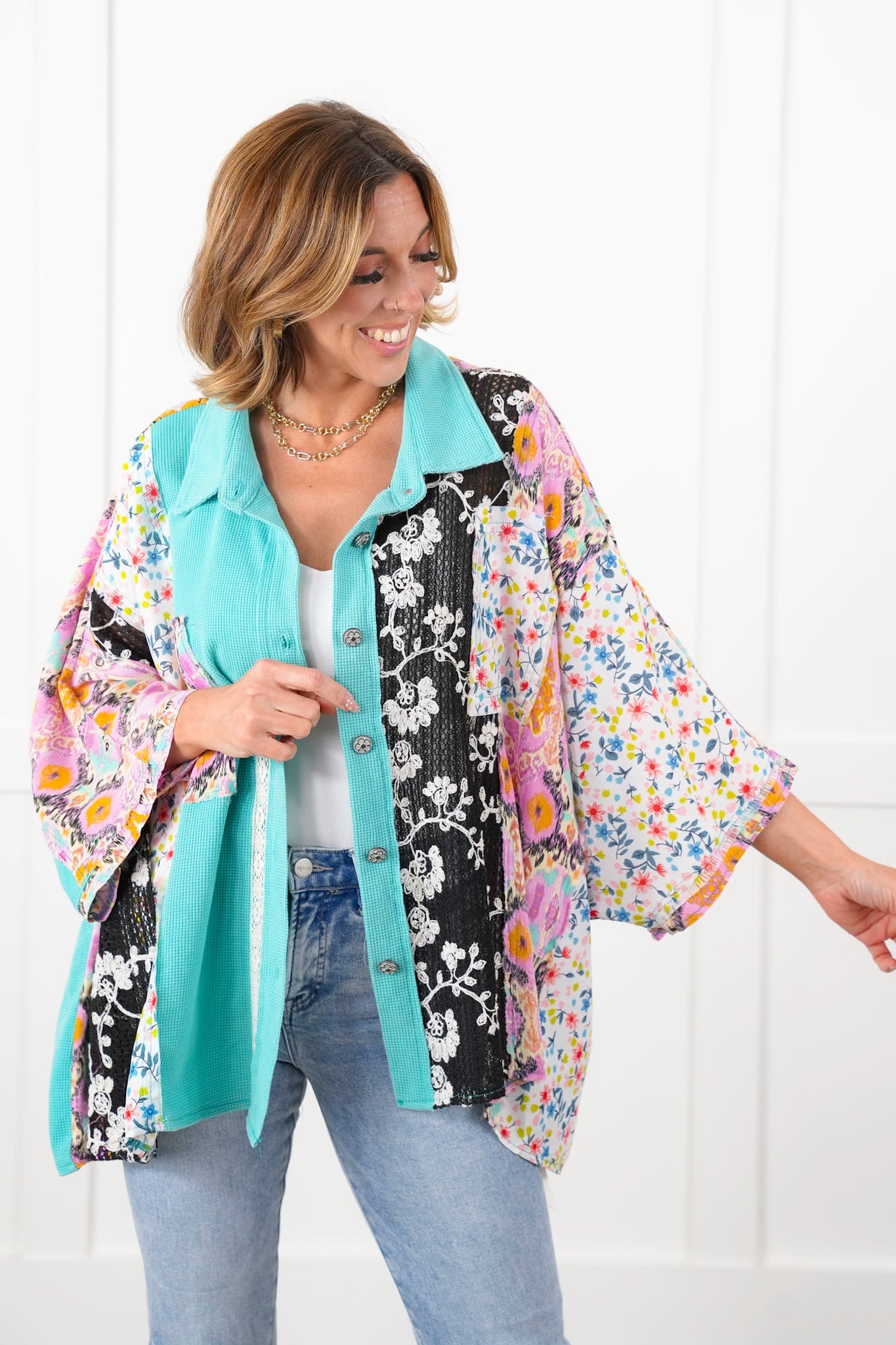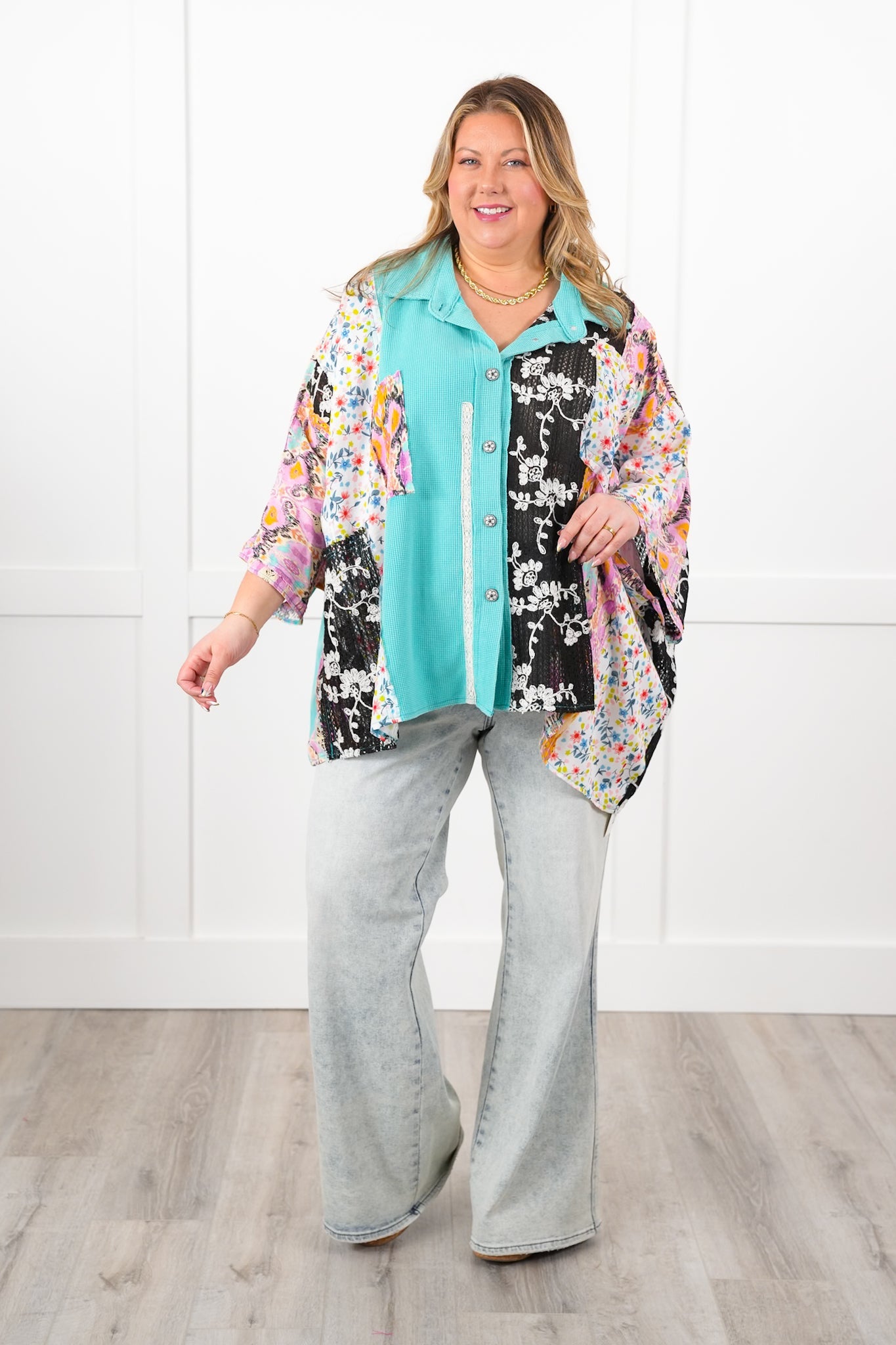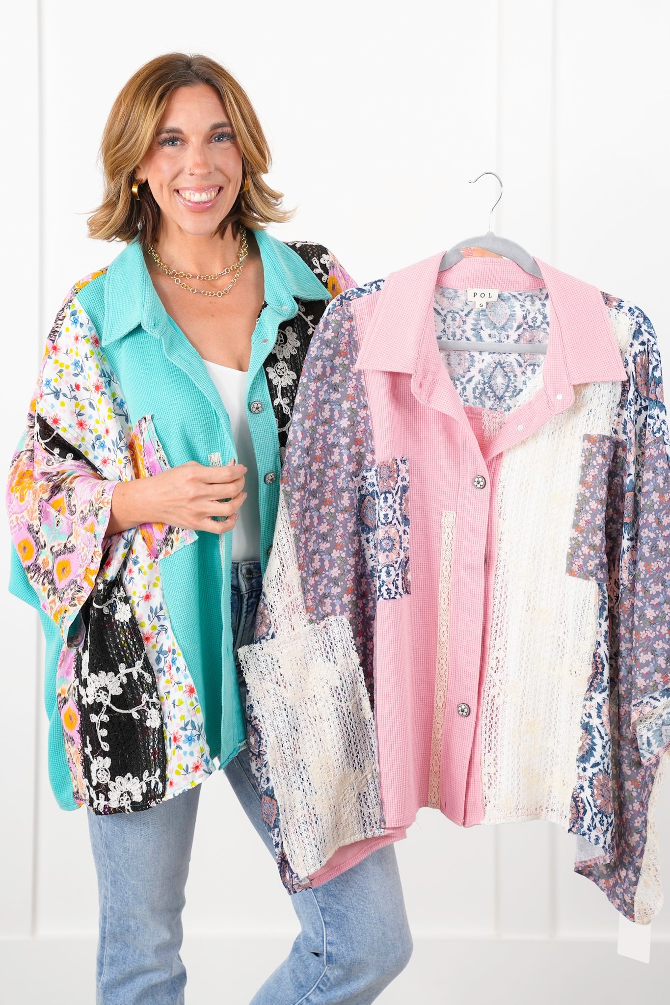 This show-stopping top brings the wow factor with its mix of patchwork prints in gorgeous color combinations! Available in mint green or soft pink bases, each piece features a stunning collection of floral and geometric patterns that create a one-of-a-kind look.