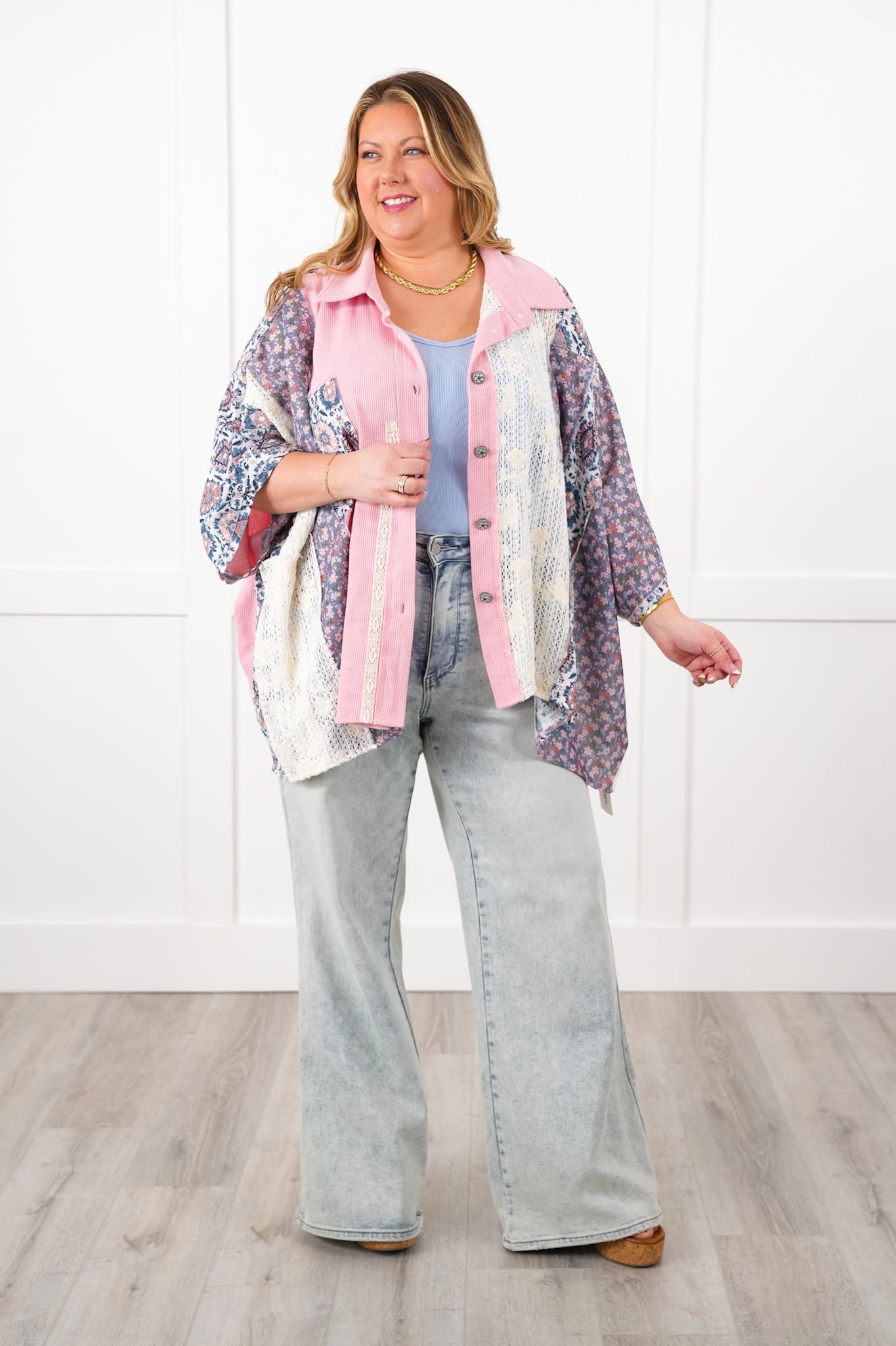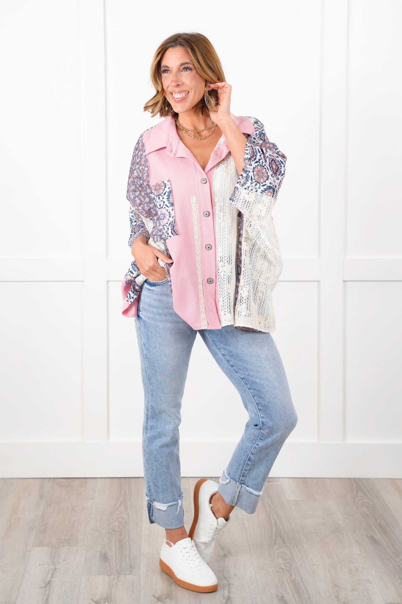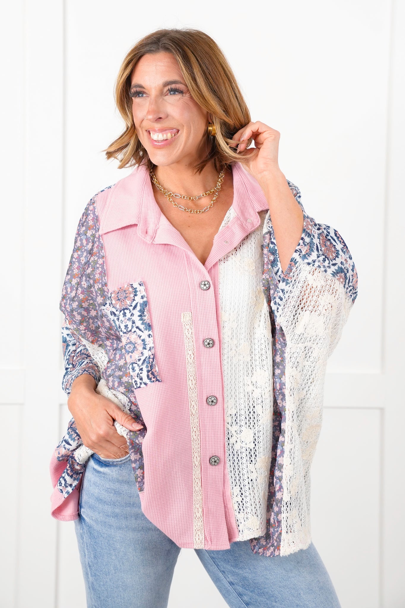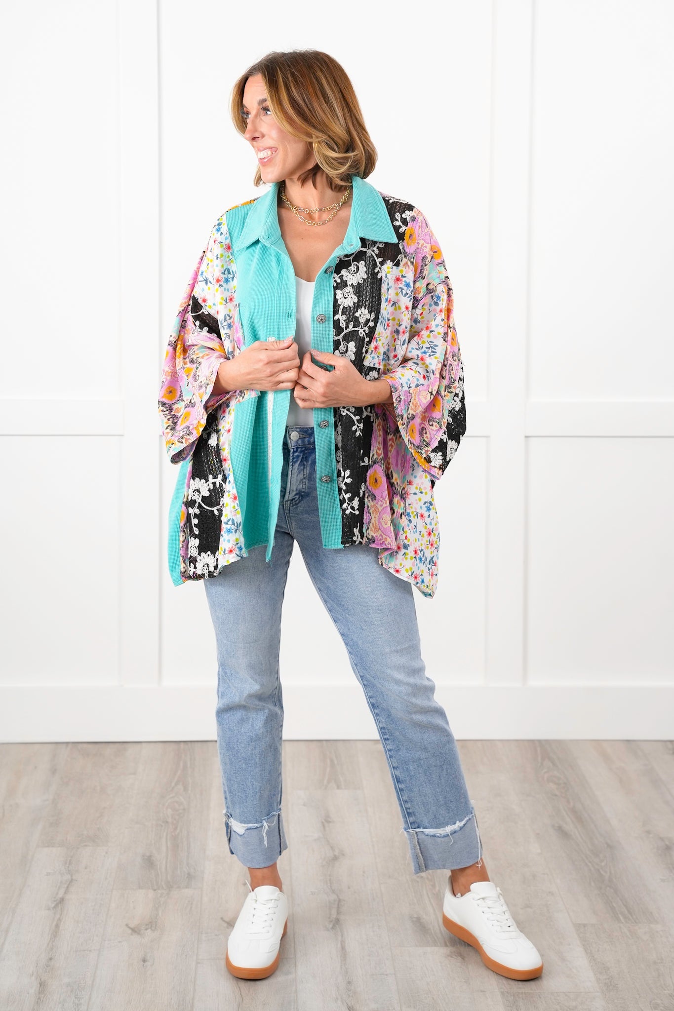 This show-stopping top brings the wow factor with its mix of patchwork prints in gorgeous color combinations! Available in mint green or soft pink bases, each piece features a stunning collection of floral and geometric patterns that create a one-of-a-kind look.