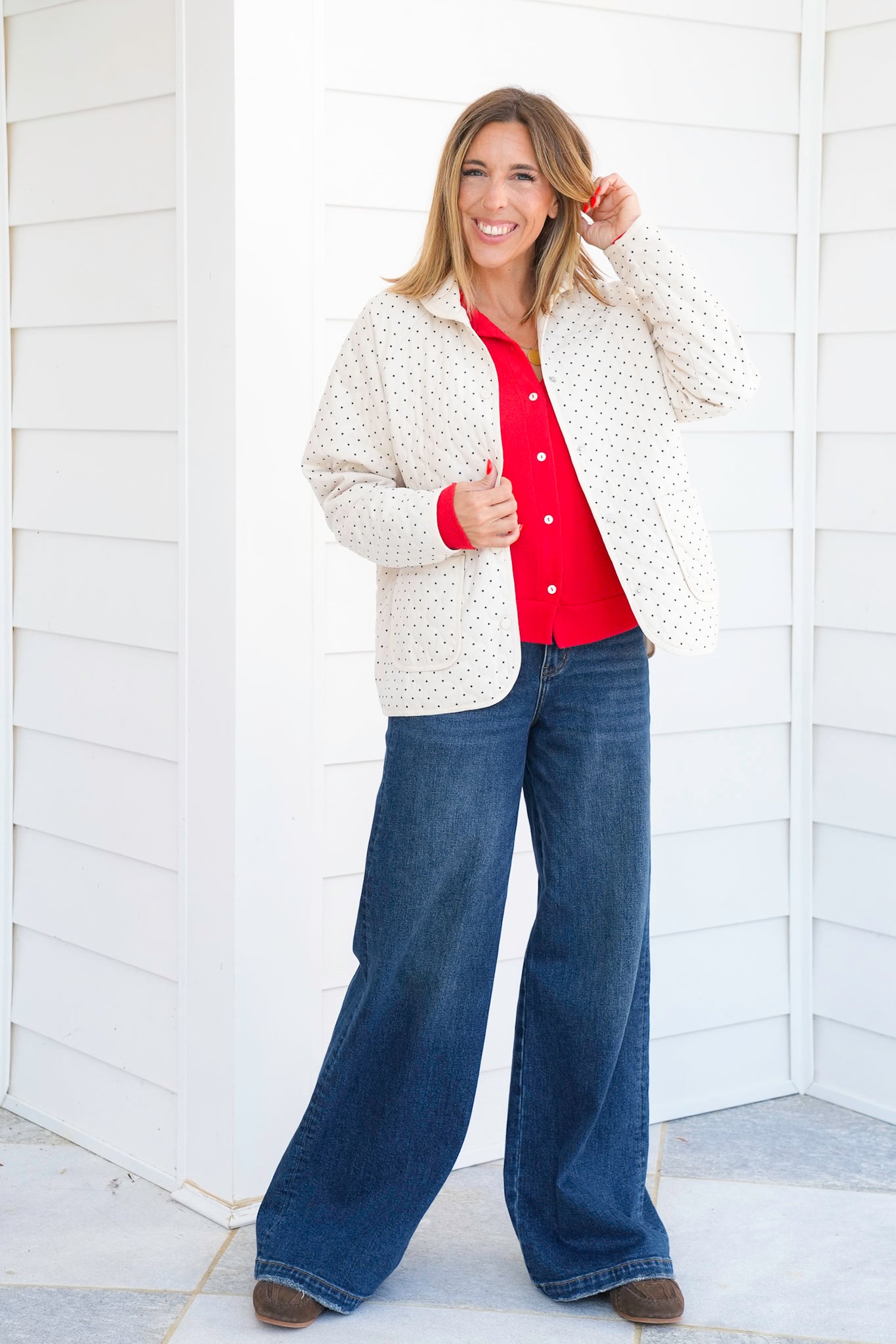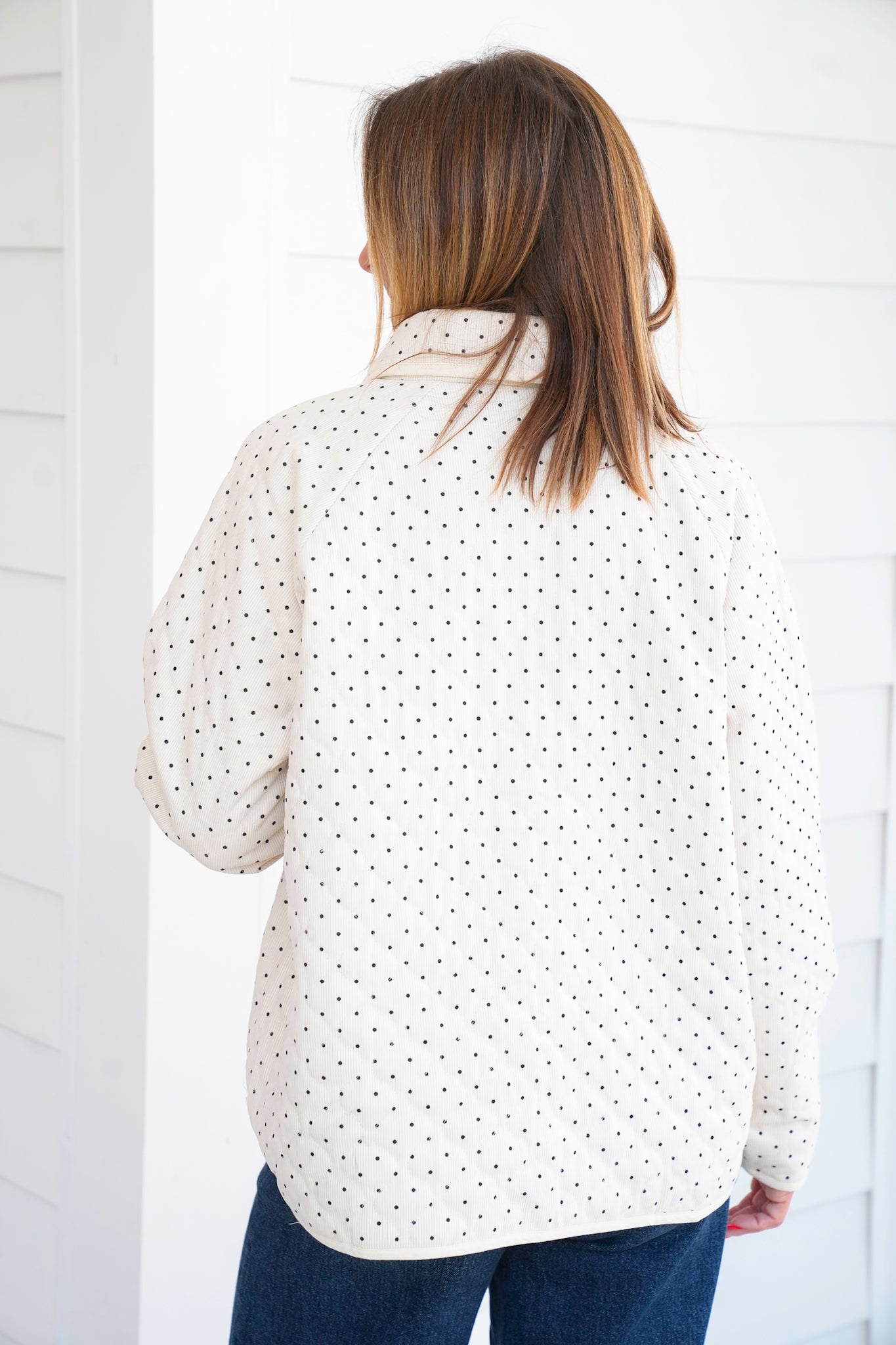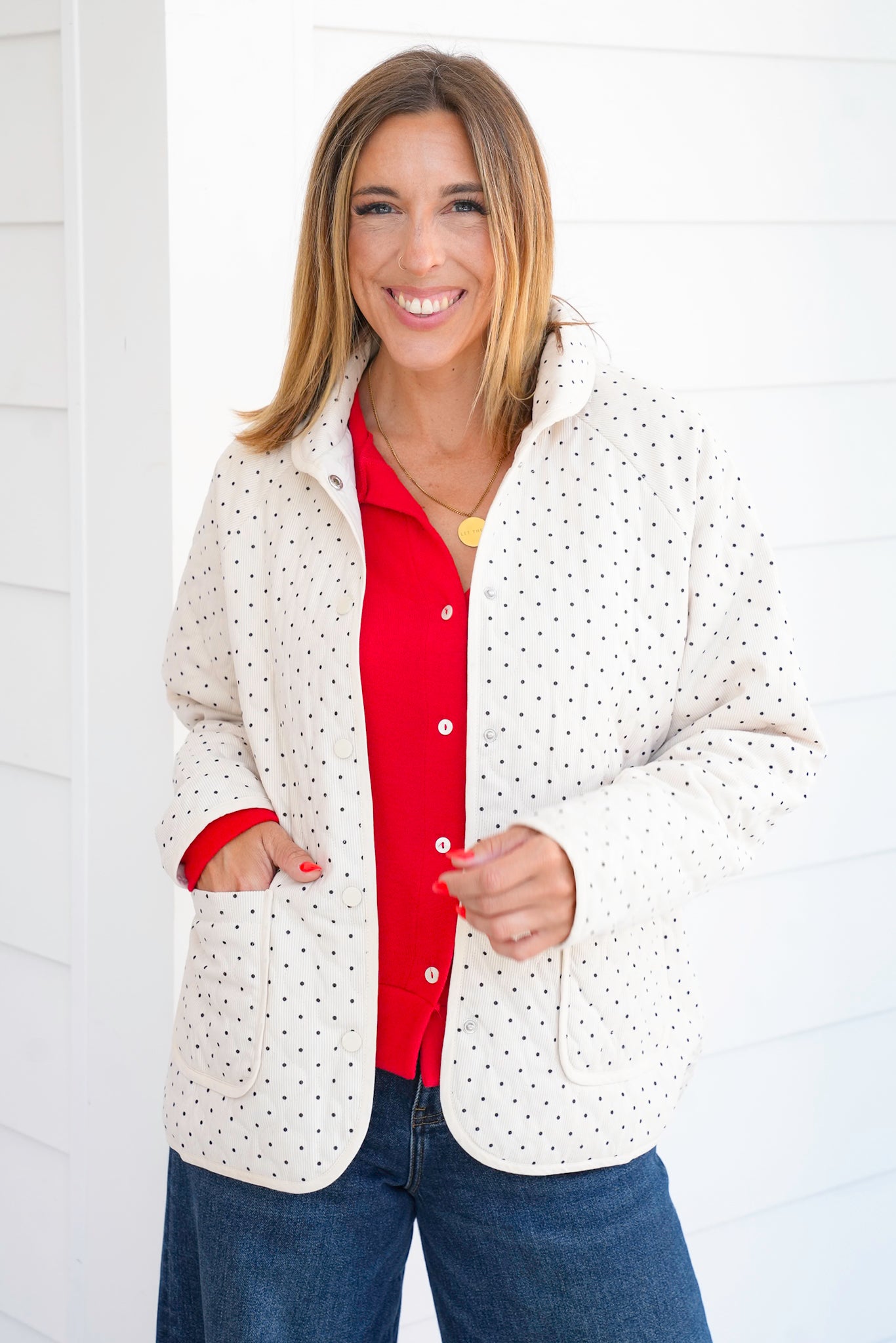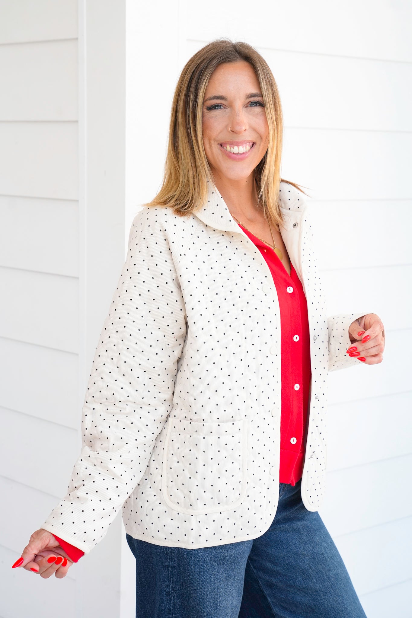 This polka dot quilted jacket is equal parts playful and polished, with a lightweight corduroy feel that’s soft to the touch. The relaxed fit makes it easy to layer, while the snap closures and front patch pockets keep things functional and cute.
