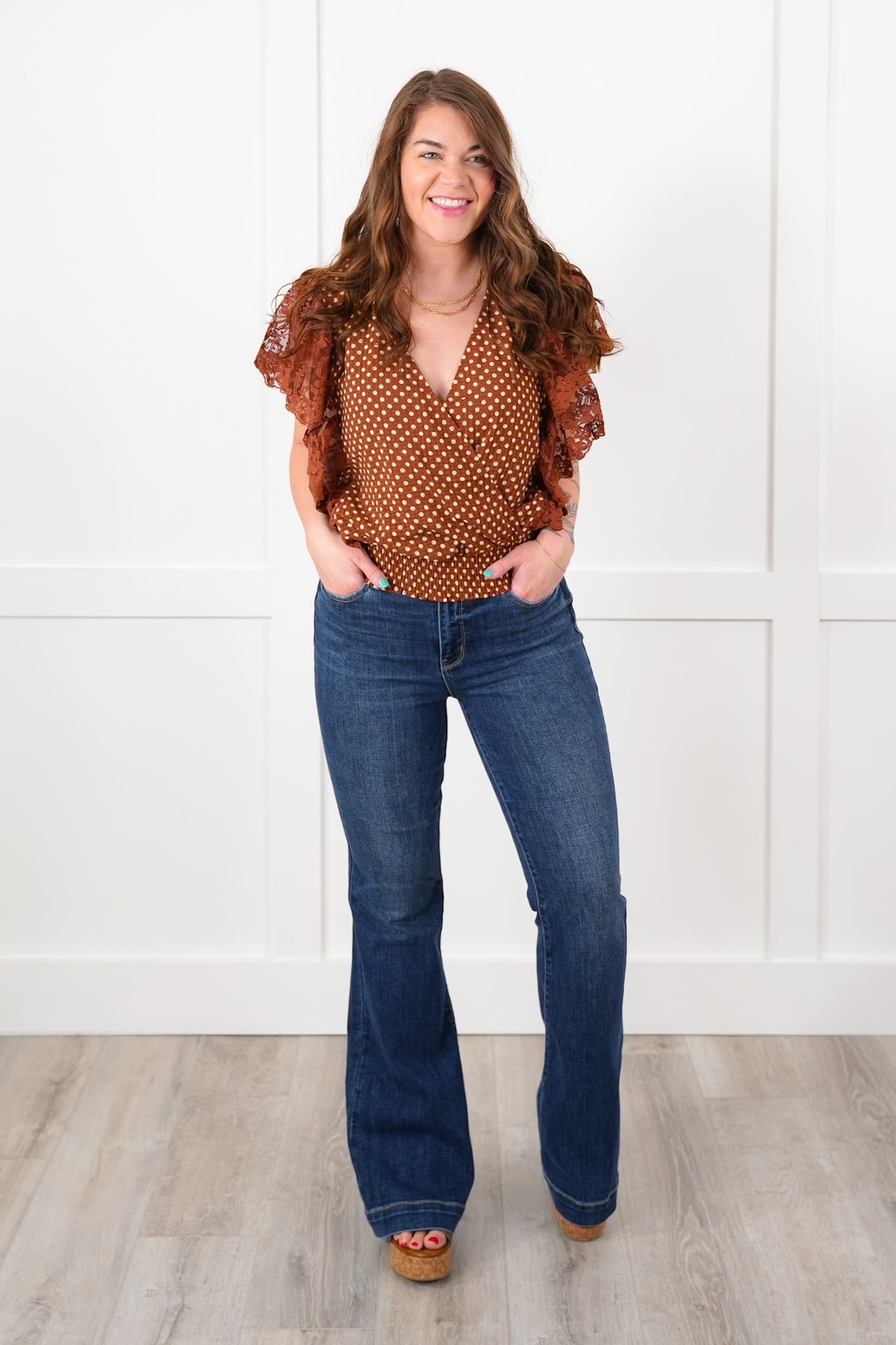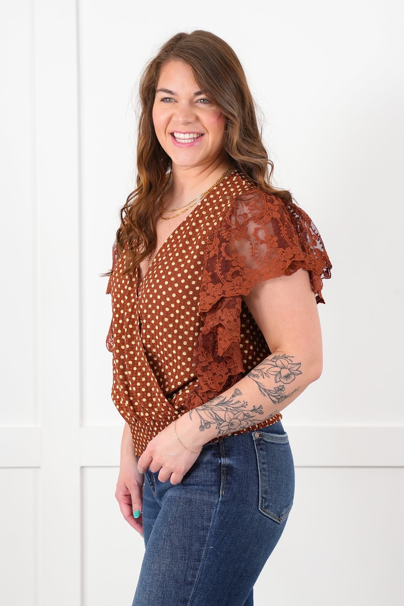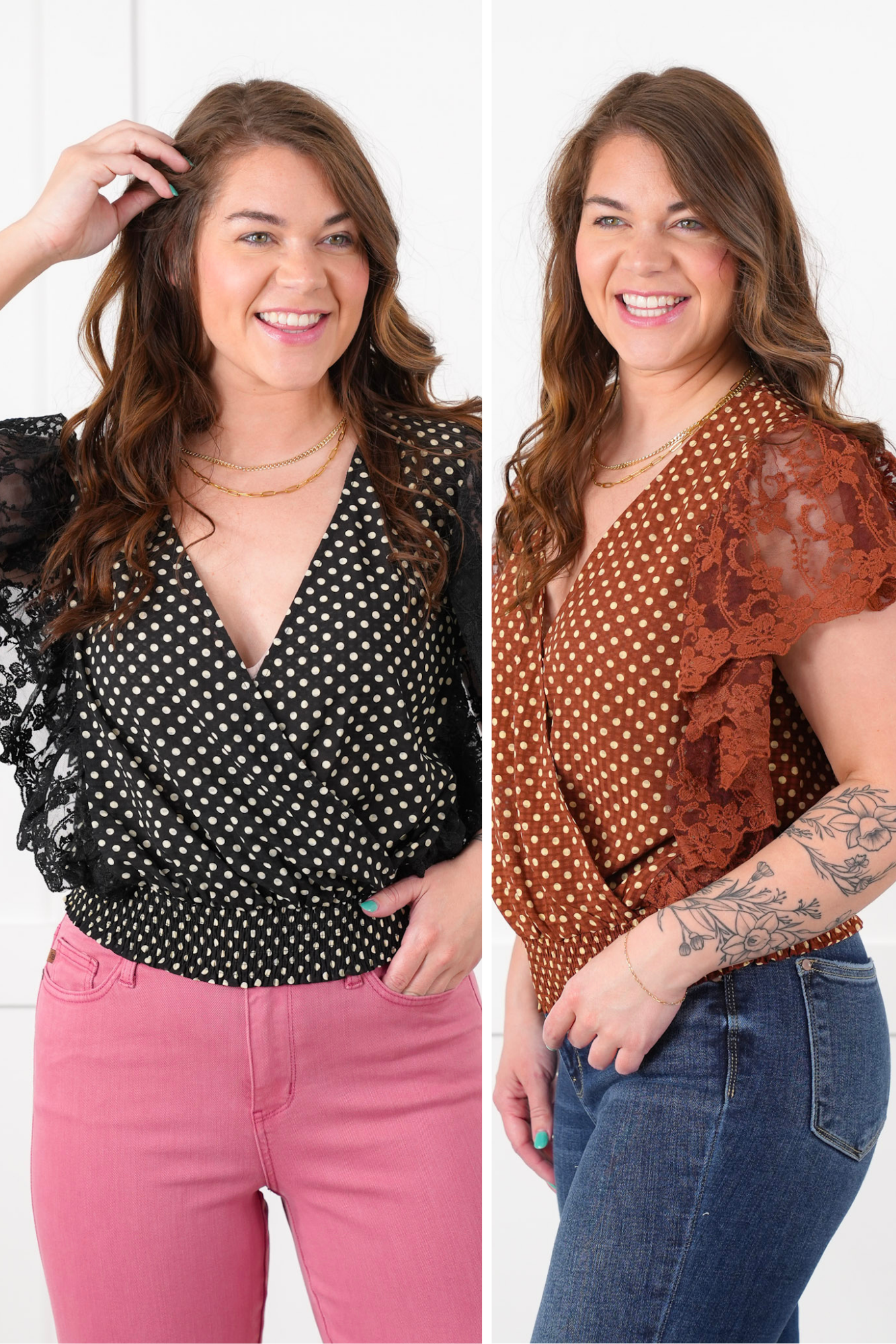 Add a touch of vintage charm to your wardrobe with this adorable wrap top! The classic polka dots and delicate lace detailing bring all the feminine vibes. Whether you're pairing it with jeans or a cute skirt, this top is sure to turn heads.