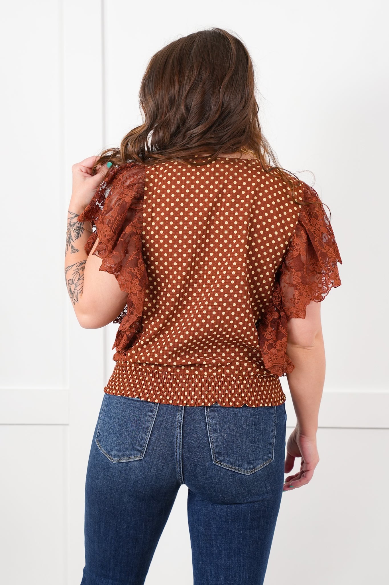 Polka Dot Short Ruffle Sleeve Wrap Top with Lace Detail