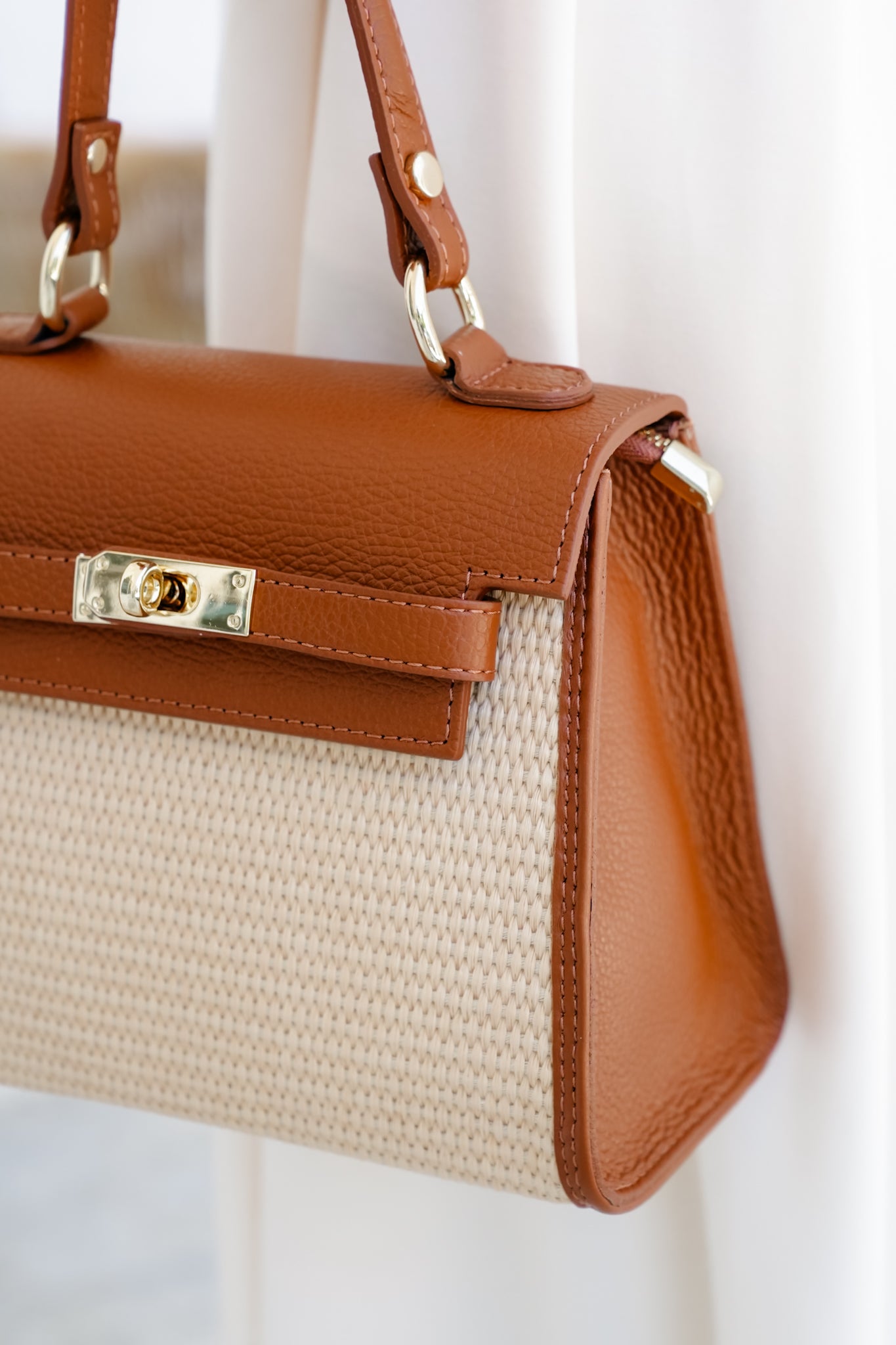 * Structured silhouette with chic raffia body and luxe leather trim