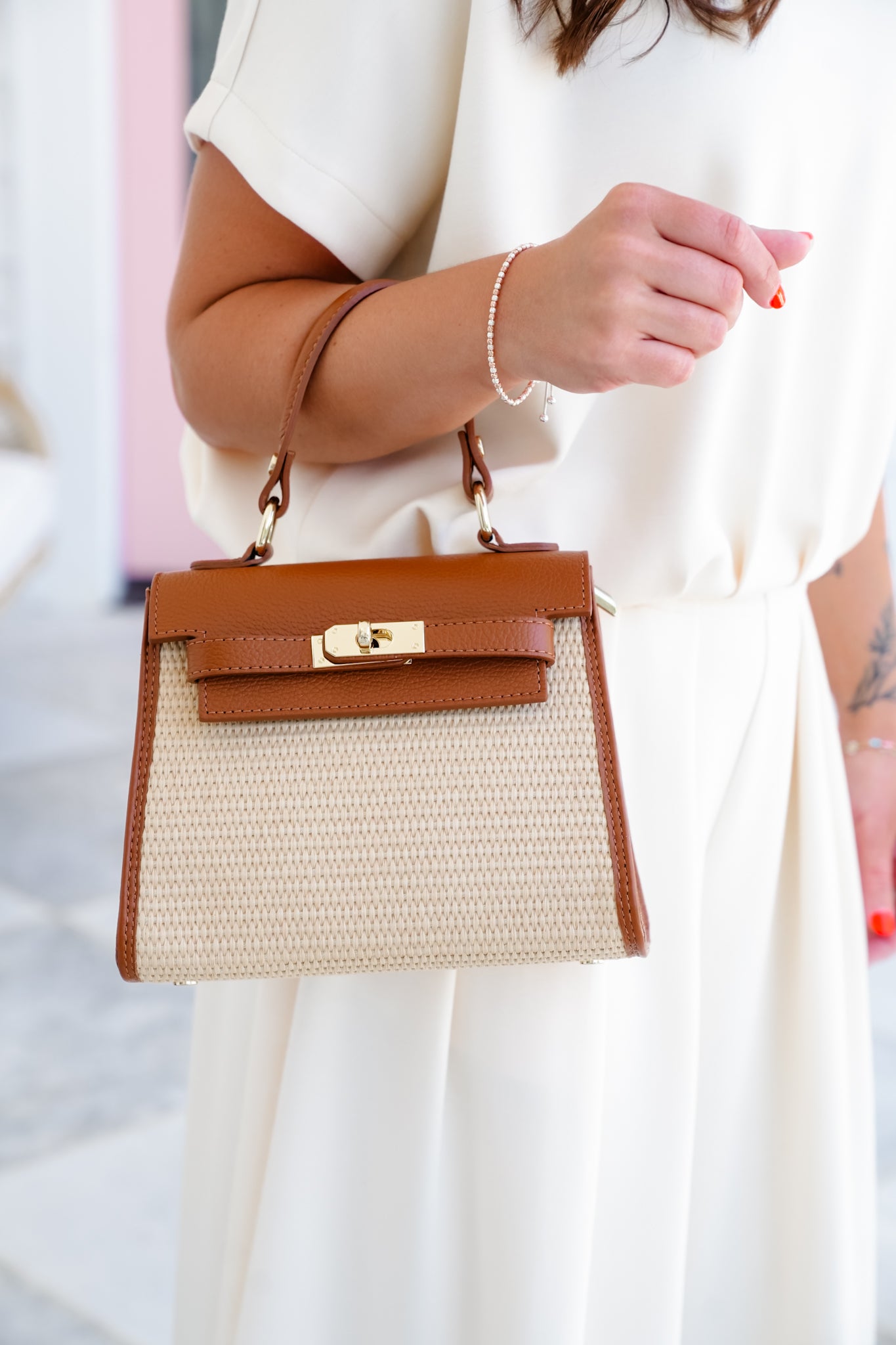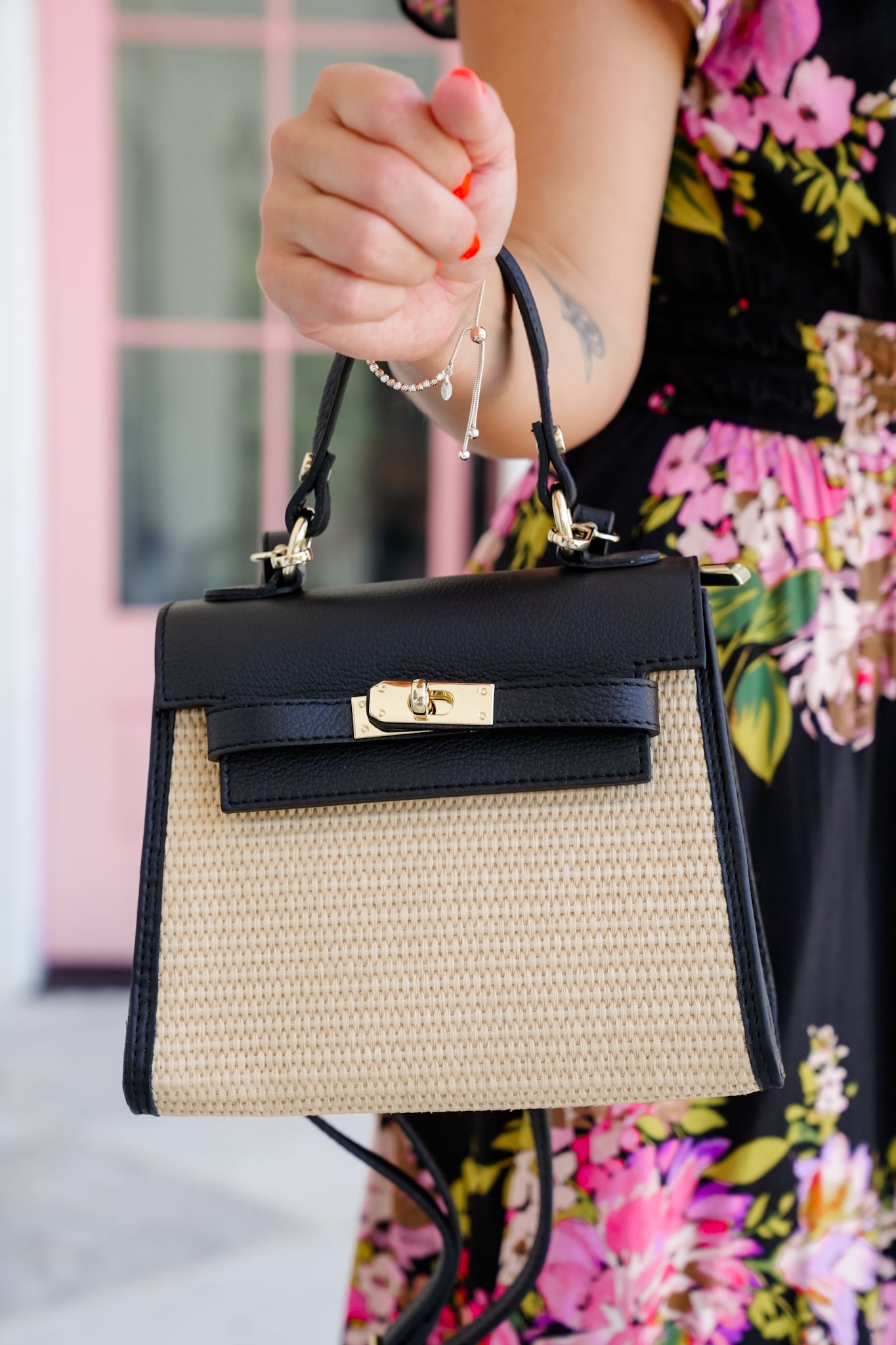 This raffia and leather top handle crossbody bag is the definition of timeless meets trendy. The woven raffia texture, paired with luxe genuine Italian leather trim and a sleek gold twist lock, gives it that upscale, polished feel. Carry it by the top handle for a classic, sophisticated vibe or clip on the crossbody strap when you’re on the go. The bag features a key ring with a buckle and includes a zippered pocket.