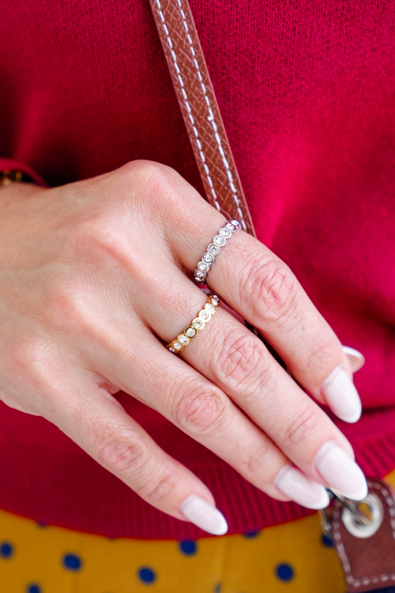 Delicate yet undeniably eye-catching, this eternity band is a symbol of promises kept and moments treasured. Available in radiant gold or timeless platinum, it features bezel-set crystals that shimmer from every angle, yes, they go all the way around! Whether worn solo for a sleek statement or stacked with other favorites, this ring brings that luxe sparkle to your everyday.