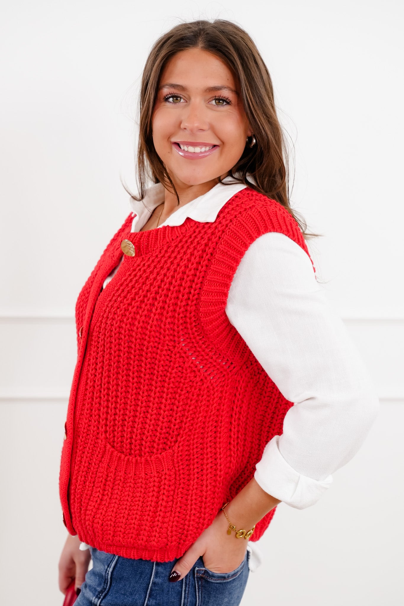 This sweater vest is one of those feel-good layers that instantly pulls an outfit together. The chunky knit gives it a warm, nostalgic vibe, while the shiny hammered buttons add a little extra personality. It’s cute worn open or buttoned up, and those front pockets are the kind of detail you’ll reach for again and again.