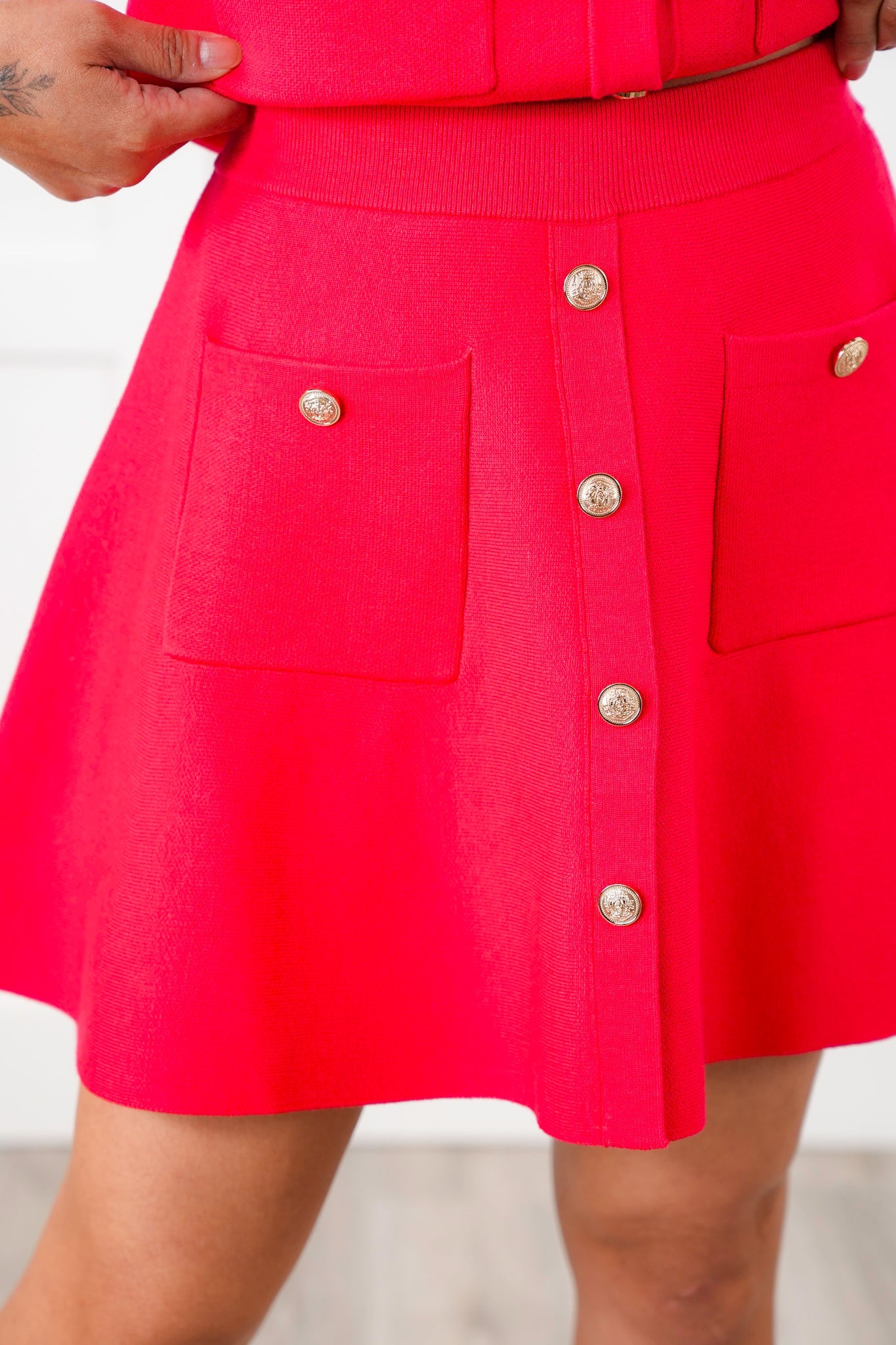 Bring on the bold! This red knit mini skirt is flirty and polished all at once. The gold button detail is decorative but dramatic, and the elastic waistband keeps it comfy no matter what your day looks like. Pair it with a crisp blouse or rock it with the matching top to make a statement.