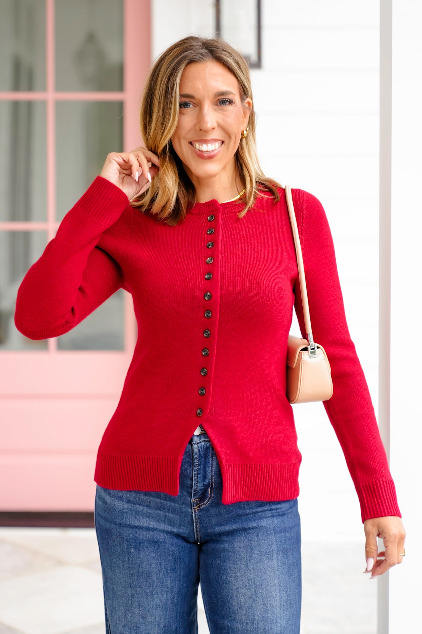 This cardigan sweater brings effortless sophistication to your cool-weather wardrobe. The rich red hue makes a bold yet timeless statement, while the soft knit drapes perfectly, whether worn buttoned up or open over a cami. Style it with dark denim for a chic, casual day look or tuck it into a pleated midi skirt with heels for something more refined.