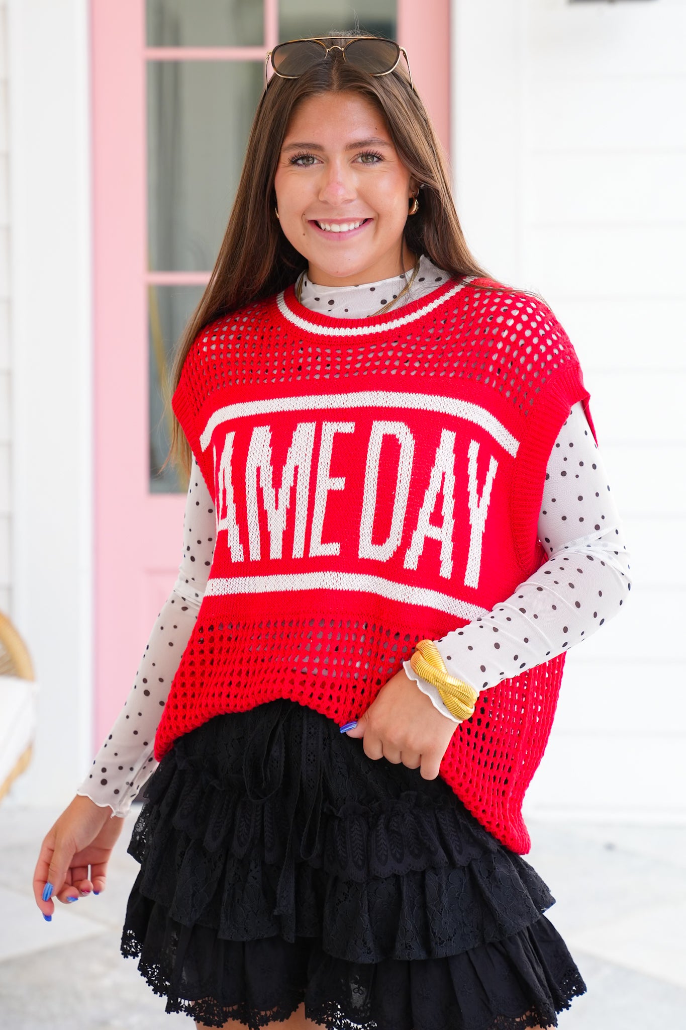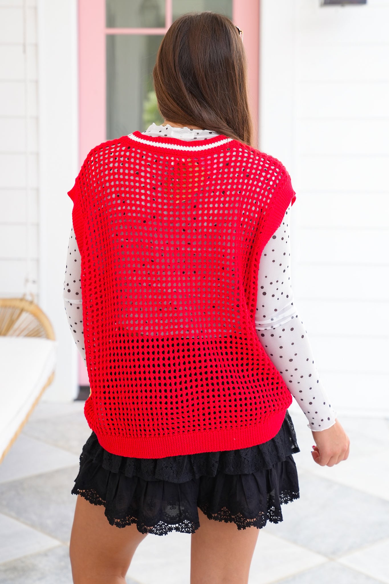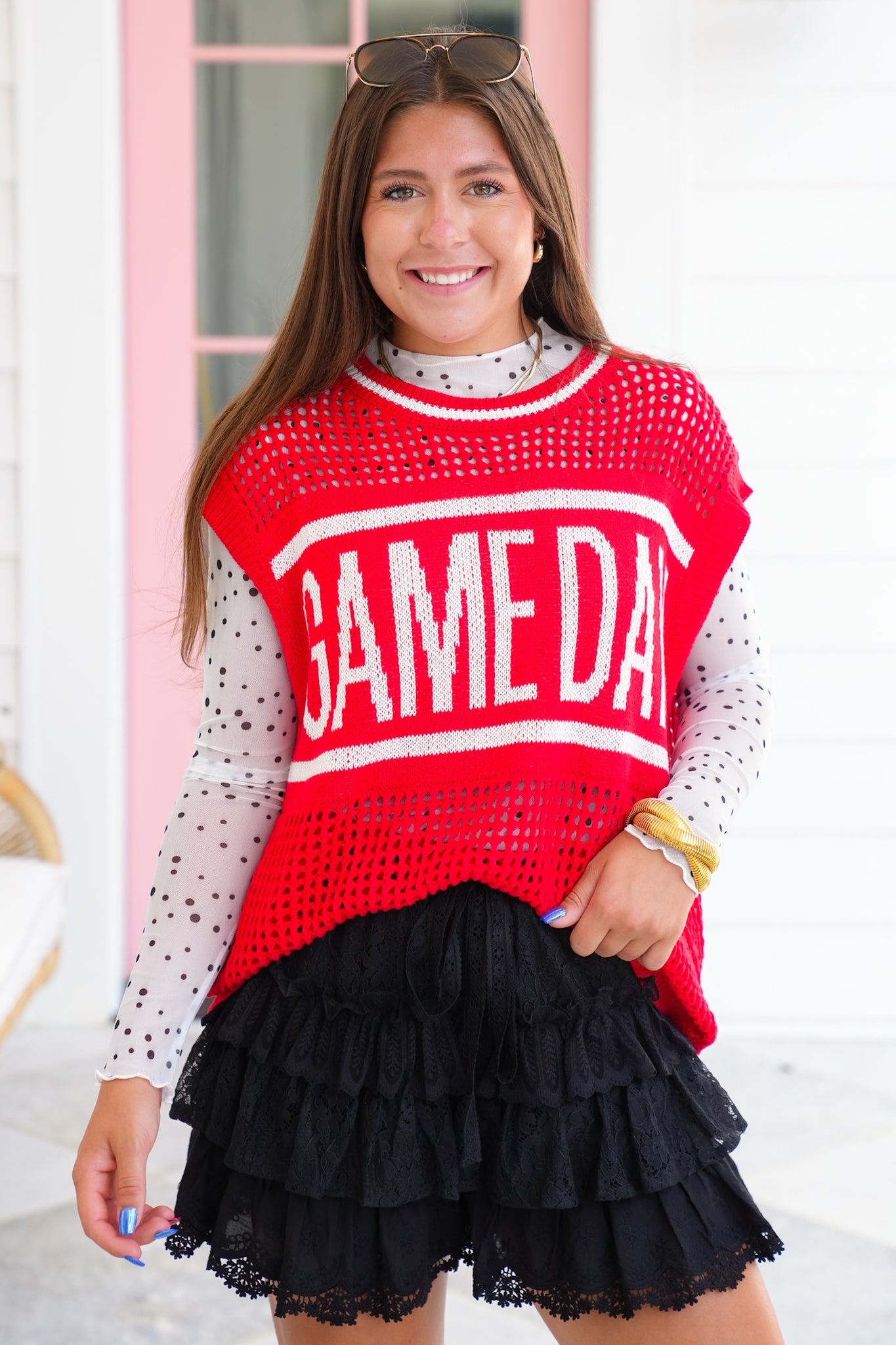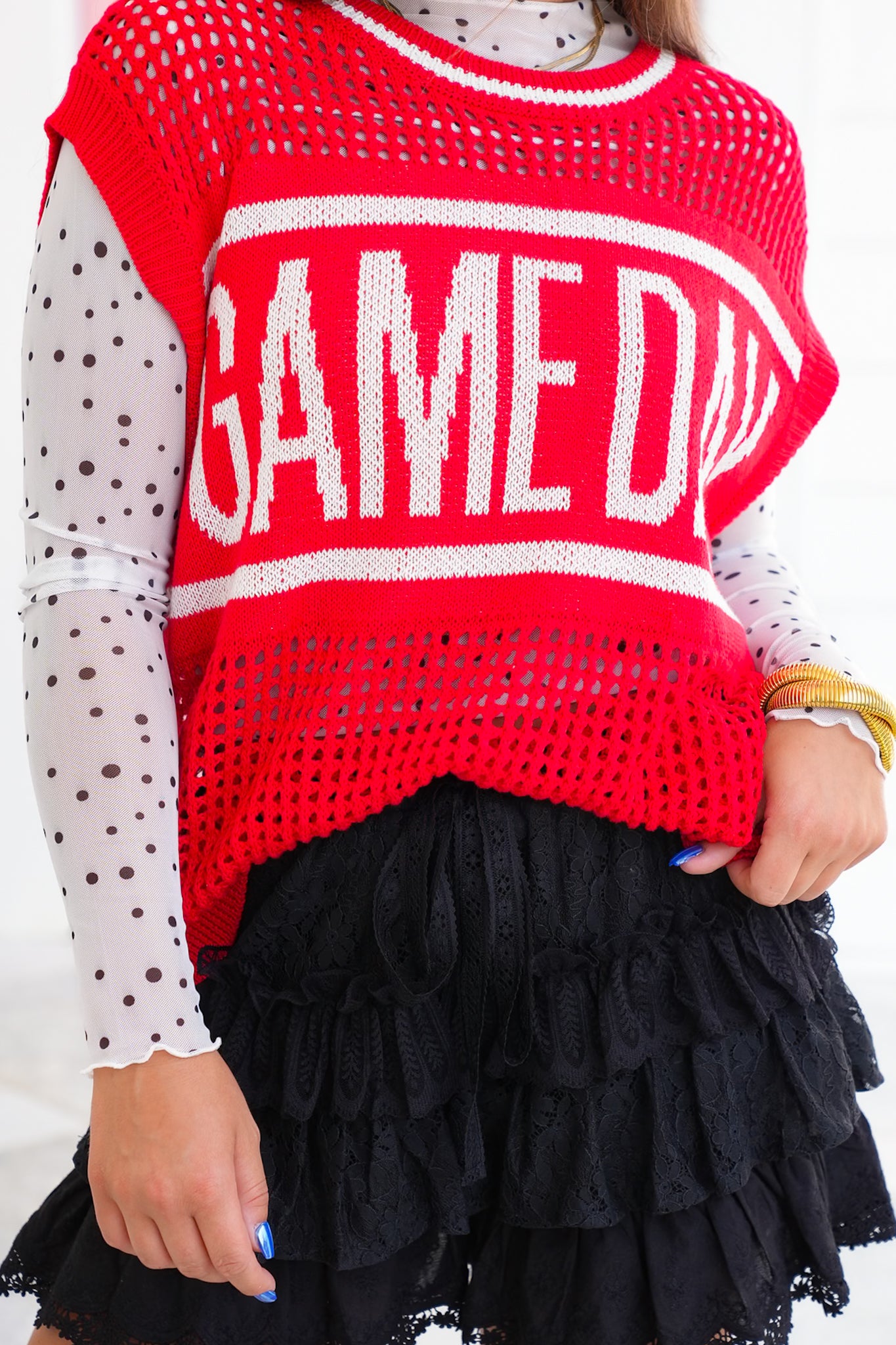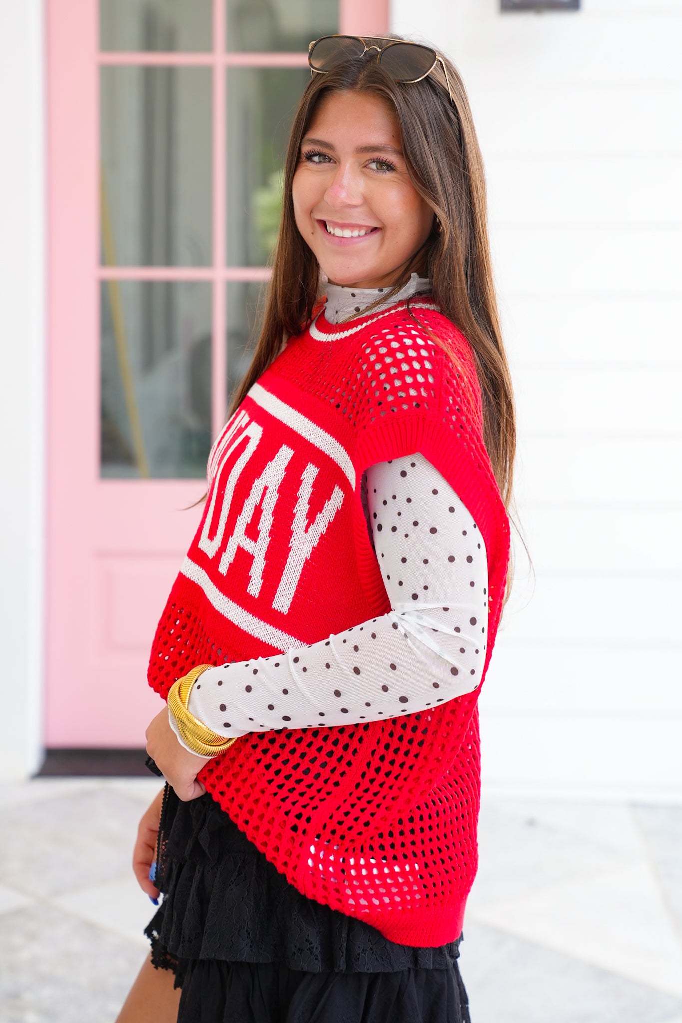 Nothing says spirited style like this sweater vest! With its bold red and oversized cut, it’s made to be the centerpiece of your game day look. Style it over a mesh long sleeve or layer it with your team’s colors to really show off your spirit. Pair it with denim, skirts, or even leggings and you’re ready to cheer in comfort and style.