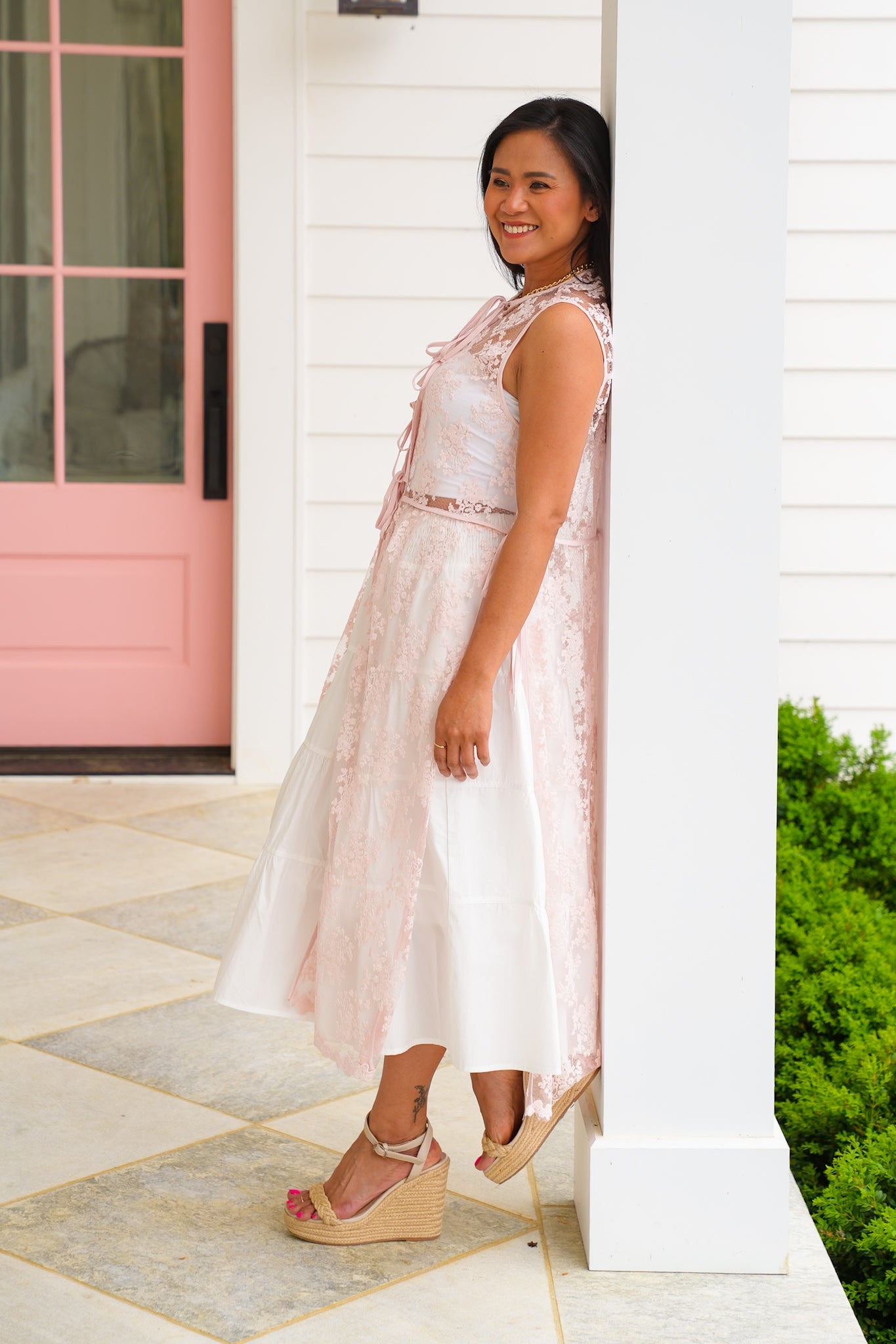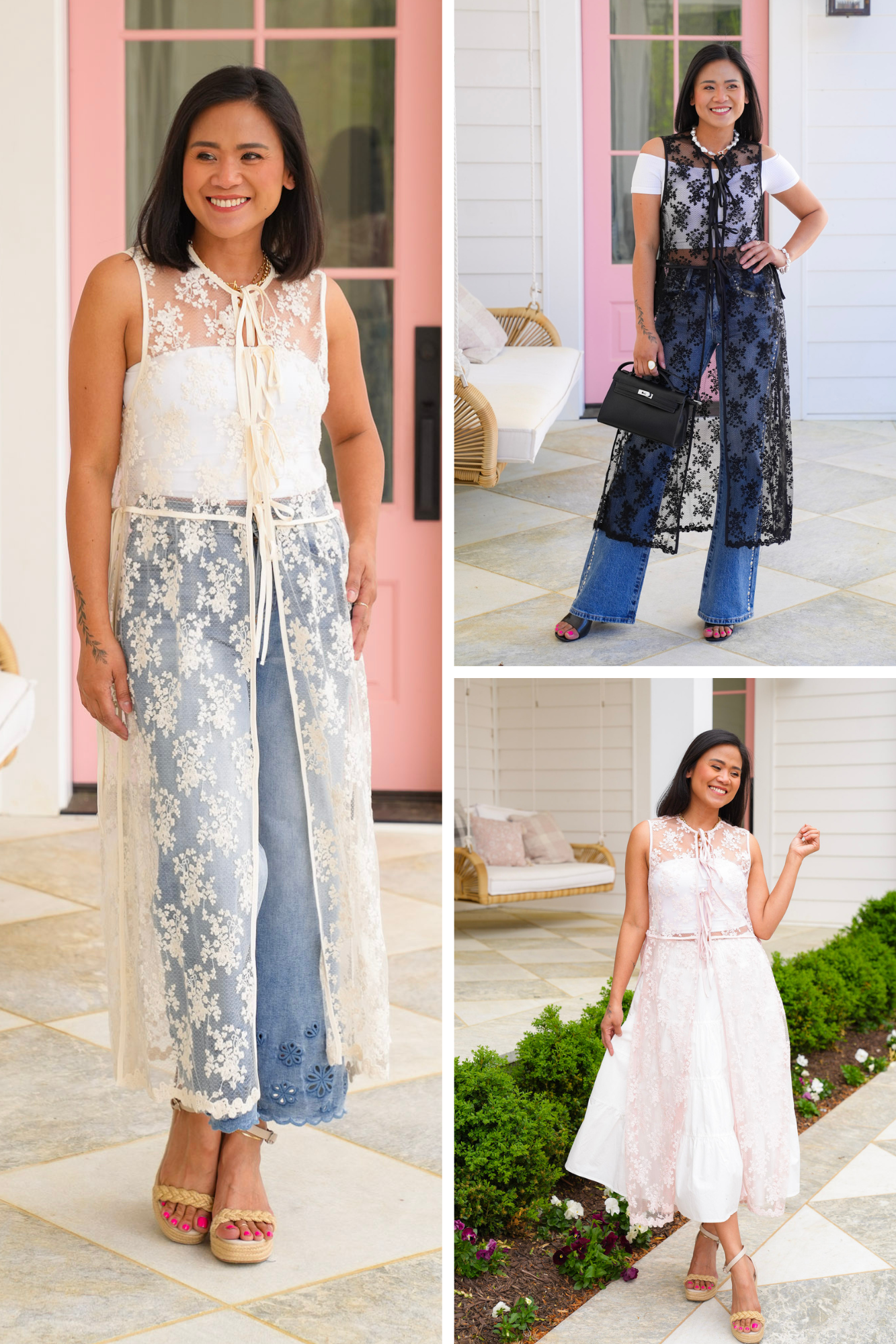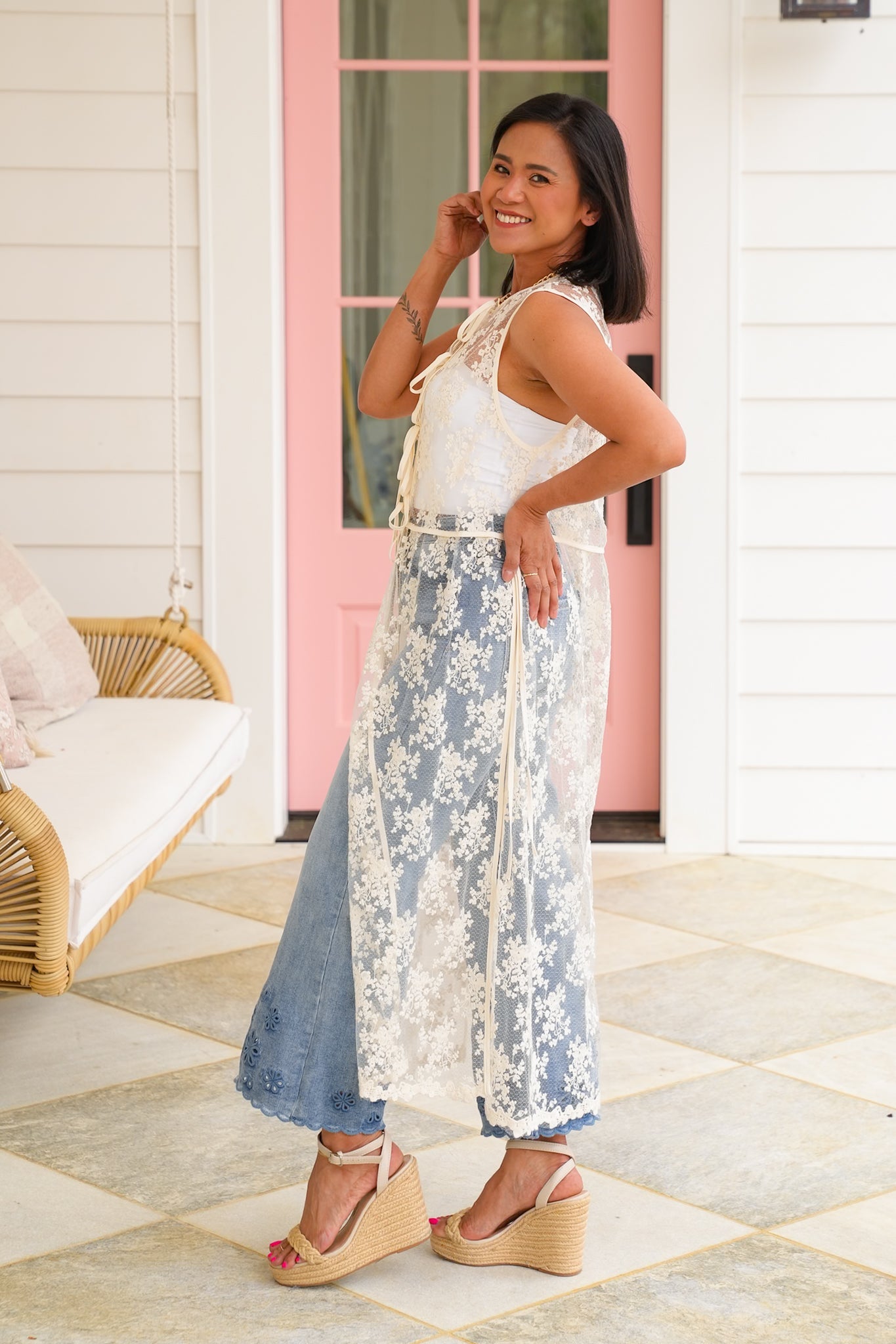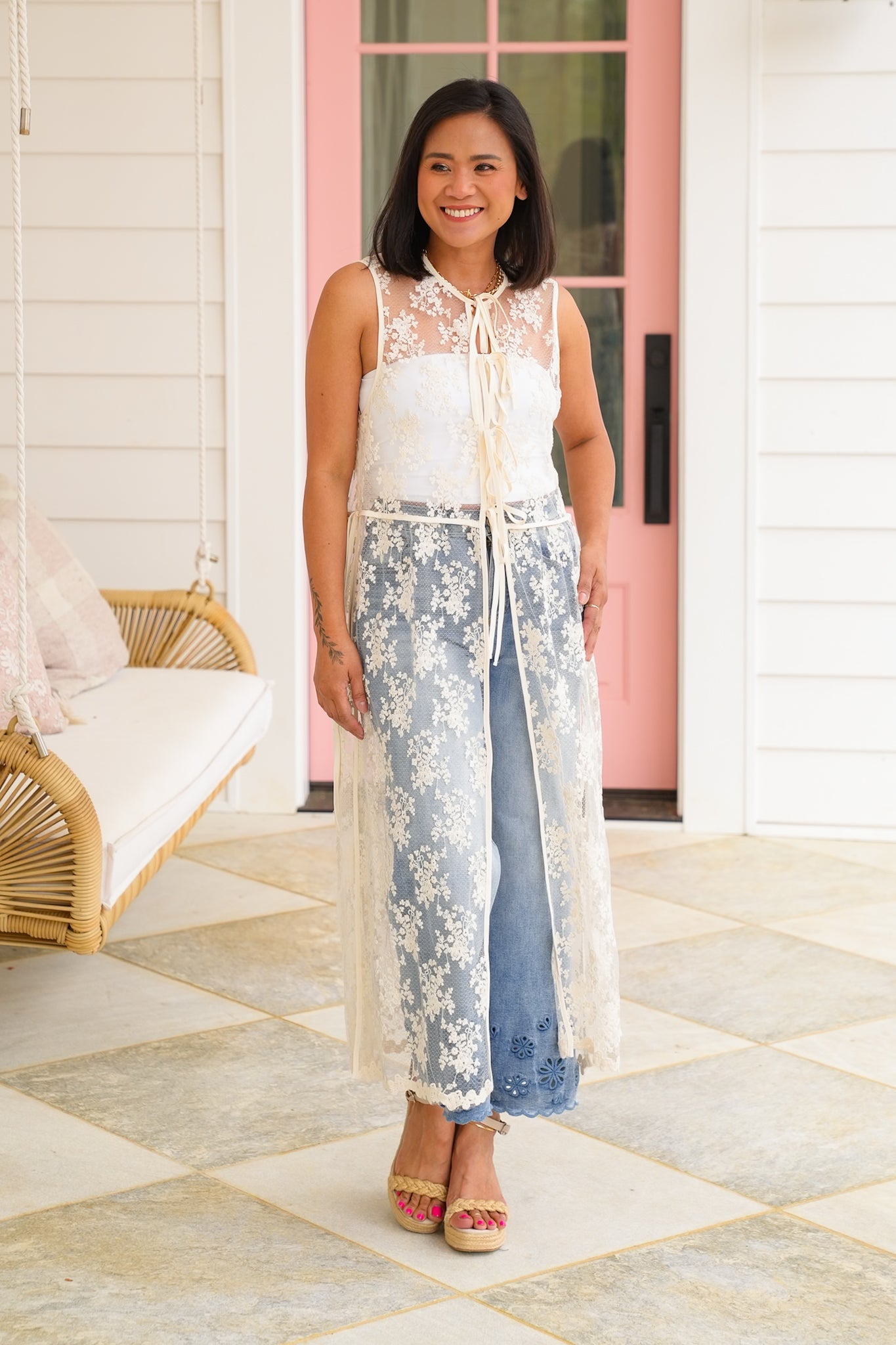 Fall in love with this stunning lace sleeveless vest from Listicle! With its charming tie front detail and delicate lace that elevates this piece from simple to spectacular. It is perfect for dressing up your favorite basics or creating that statement layer that transforms your entire look.