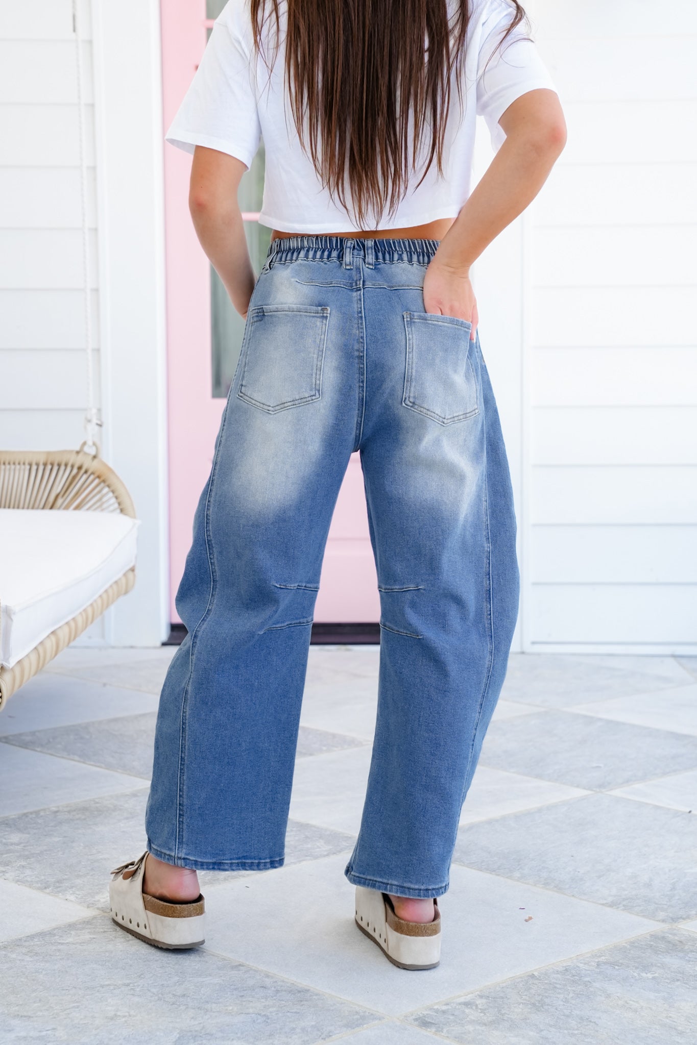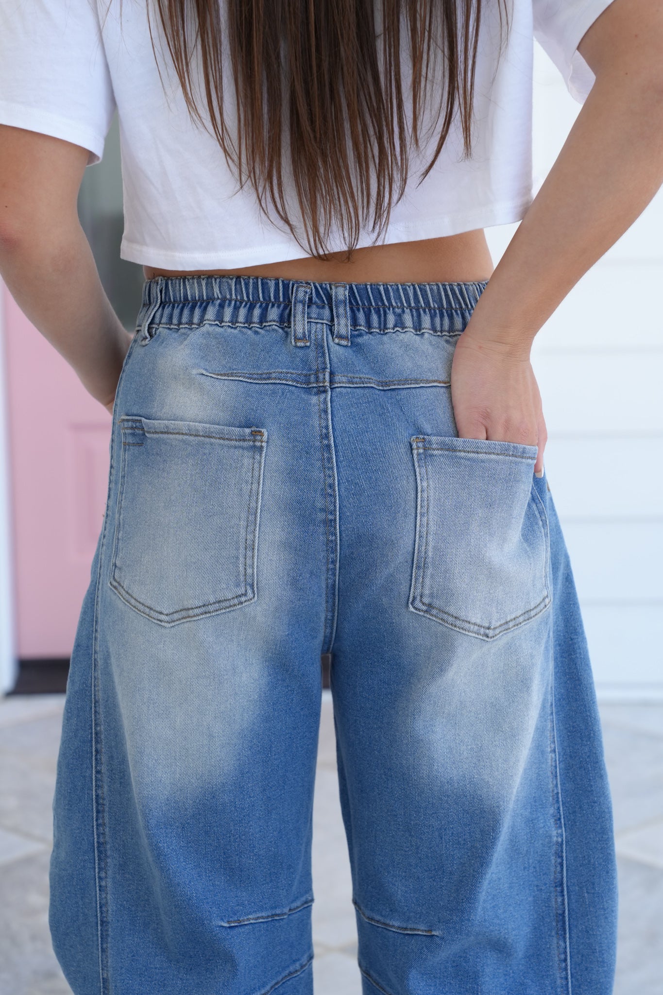 Restock! Non-Distressed Barrel Jeans with Elastic Waist Detail