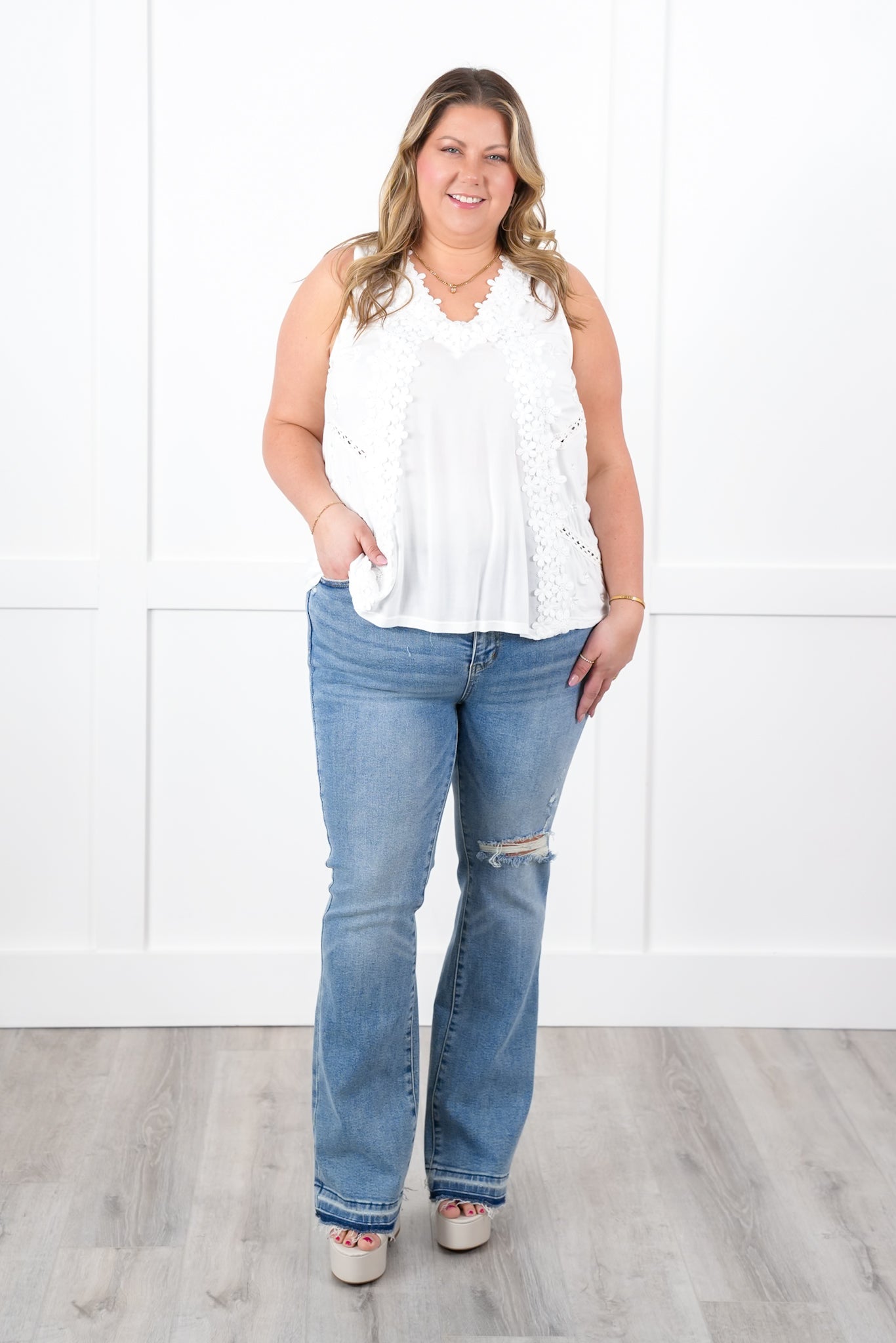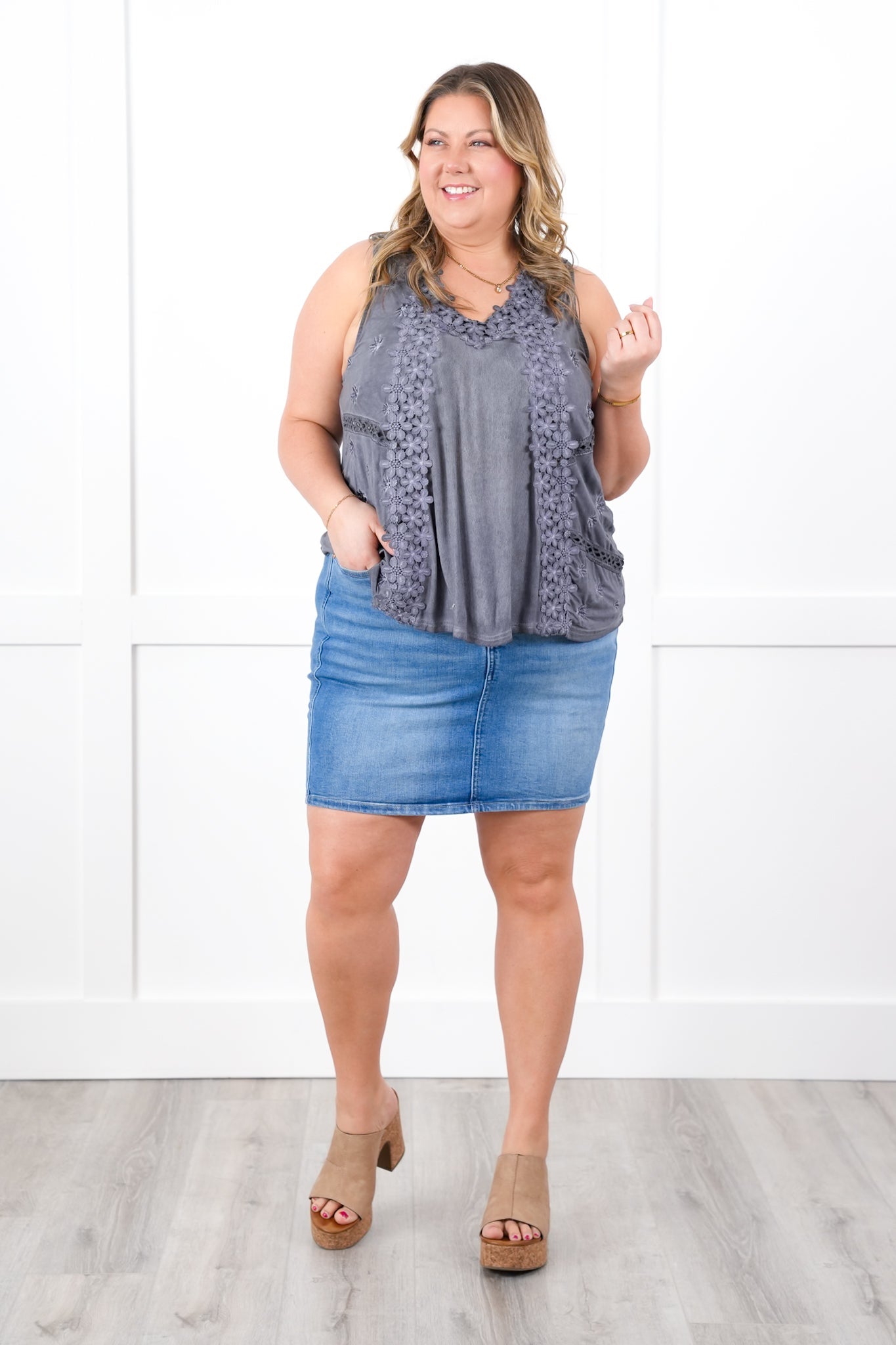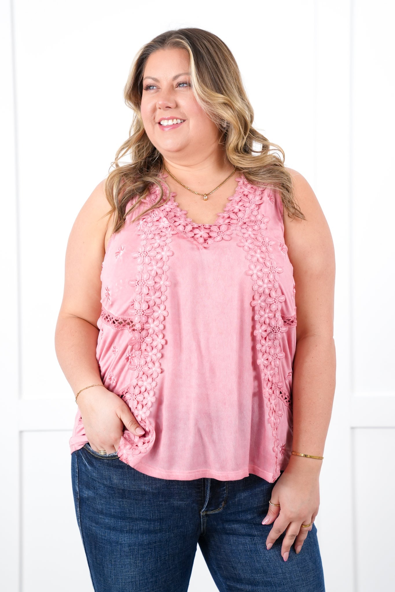 She's BACK babes! This top is a POL staple that flies off our shelves every time we get it back in stock. It is a sleeveless design with a buttery soft fabric, complete with gorgeous floral lace for a stunning presence and style. You can layer it with a blazer or jacket or just pair it with jeans for a gorgeous outfit!