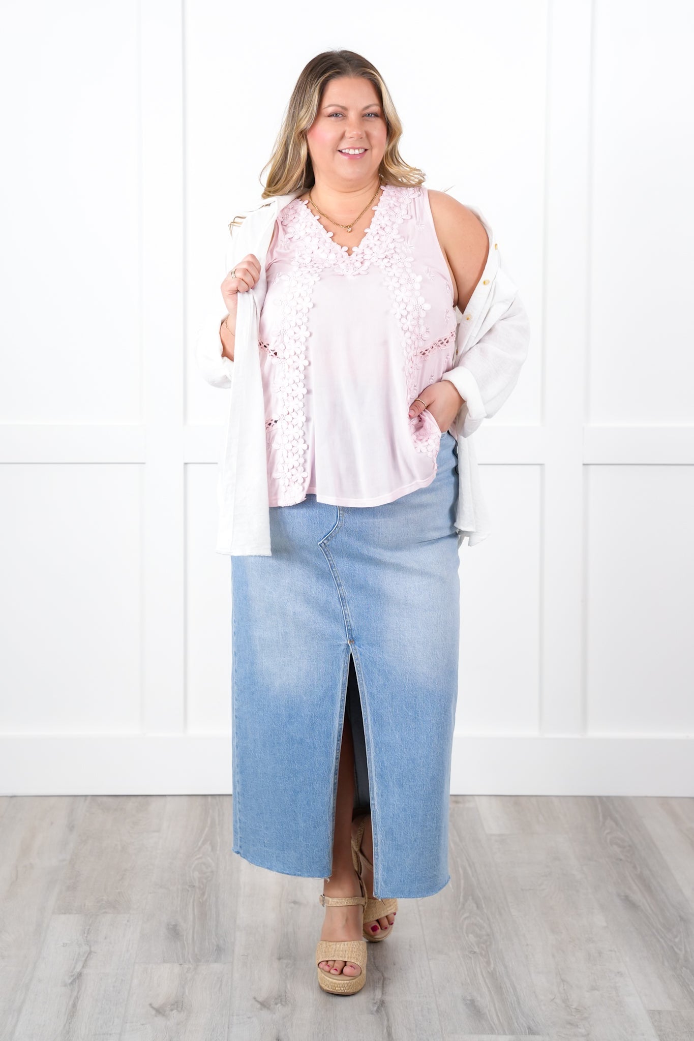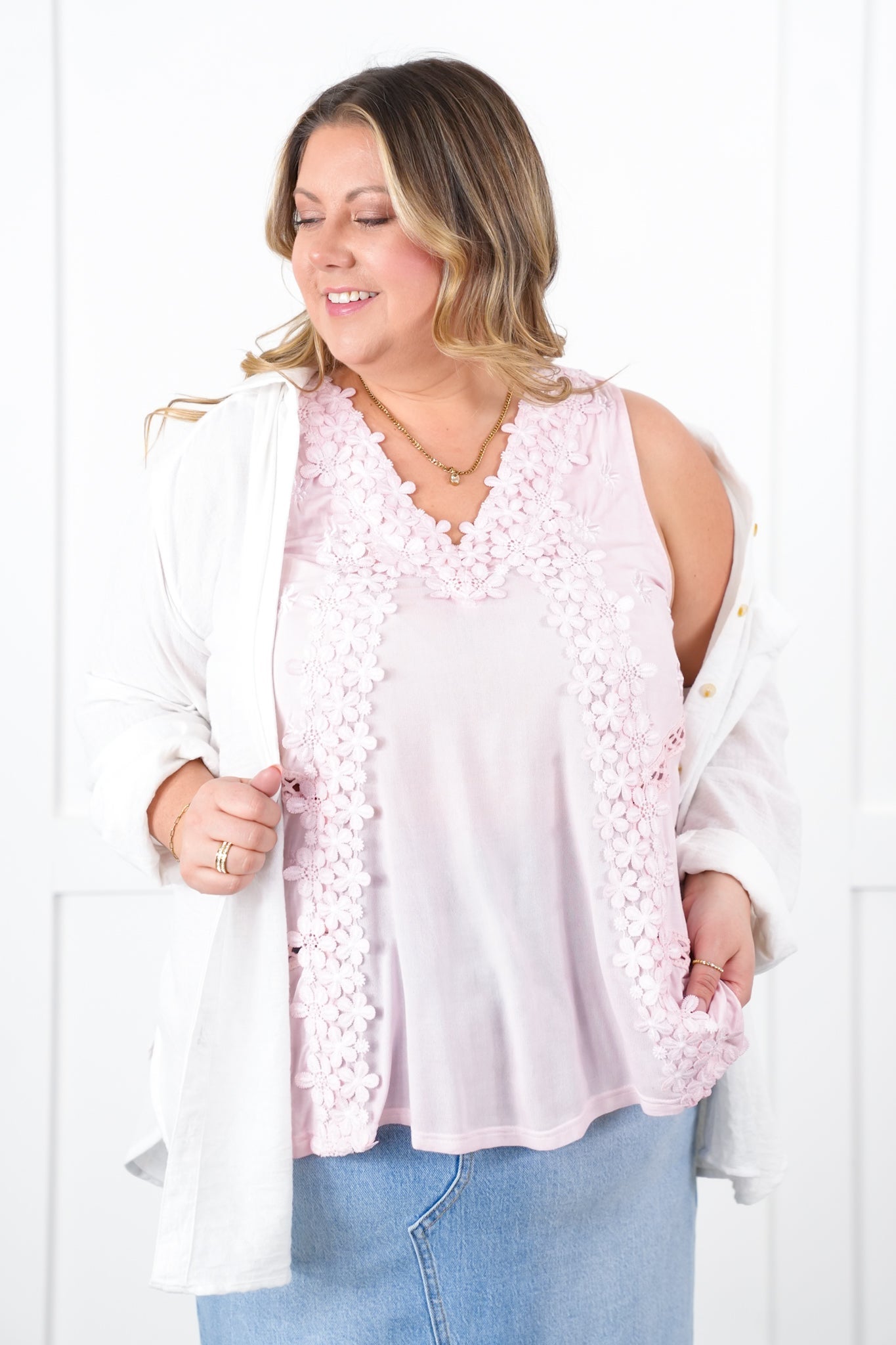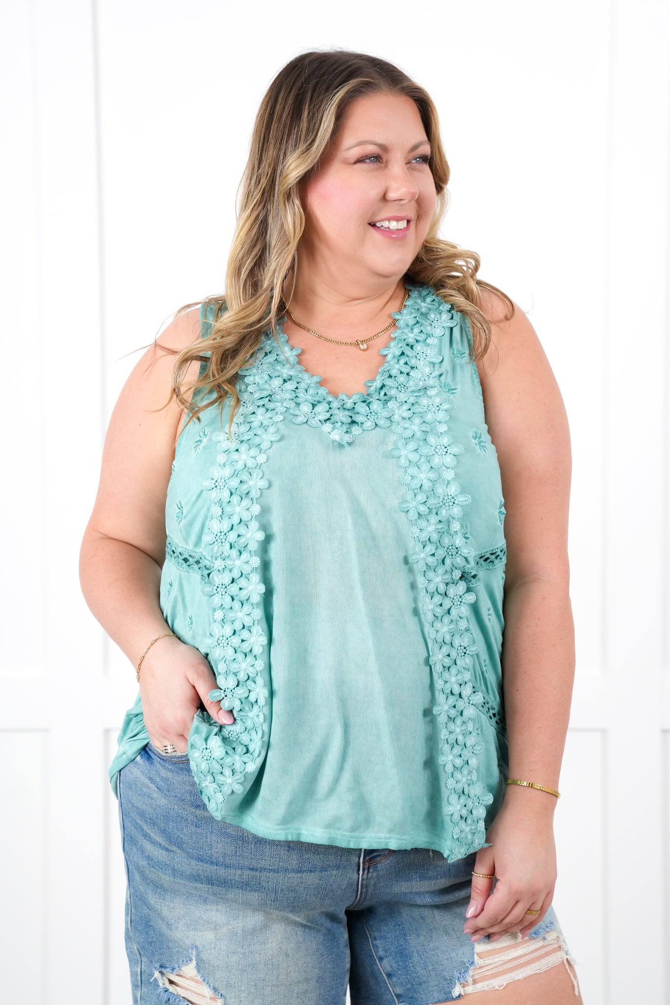 She's BACK babes! This top is a POL staple that flies off our shelves every time we get it back in stock. It is a sleeveless design with a buttery soft fabric, complete with gorgeous floral lace for a stunning presence and style. You can layer it with a blazer or jacket or just pair it with jeans for a gorgeous outfit!