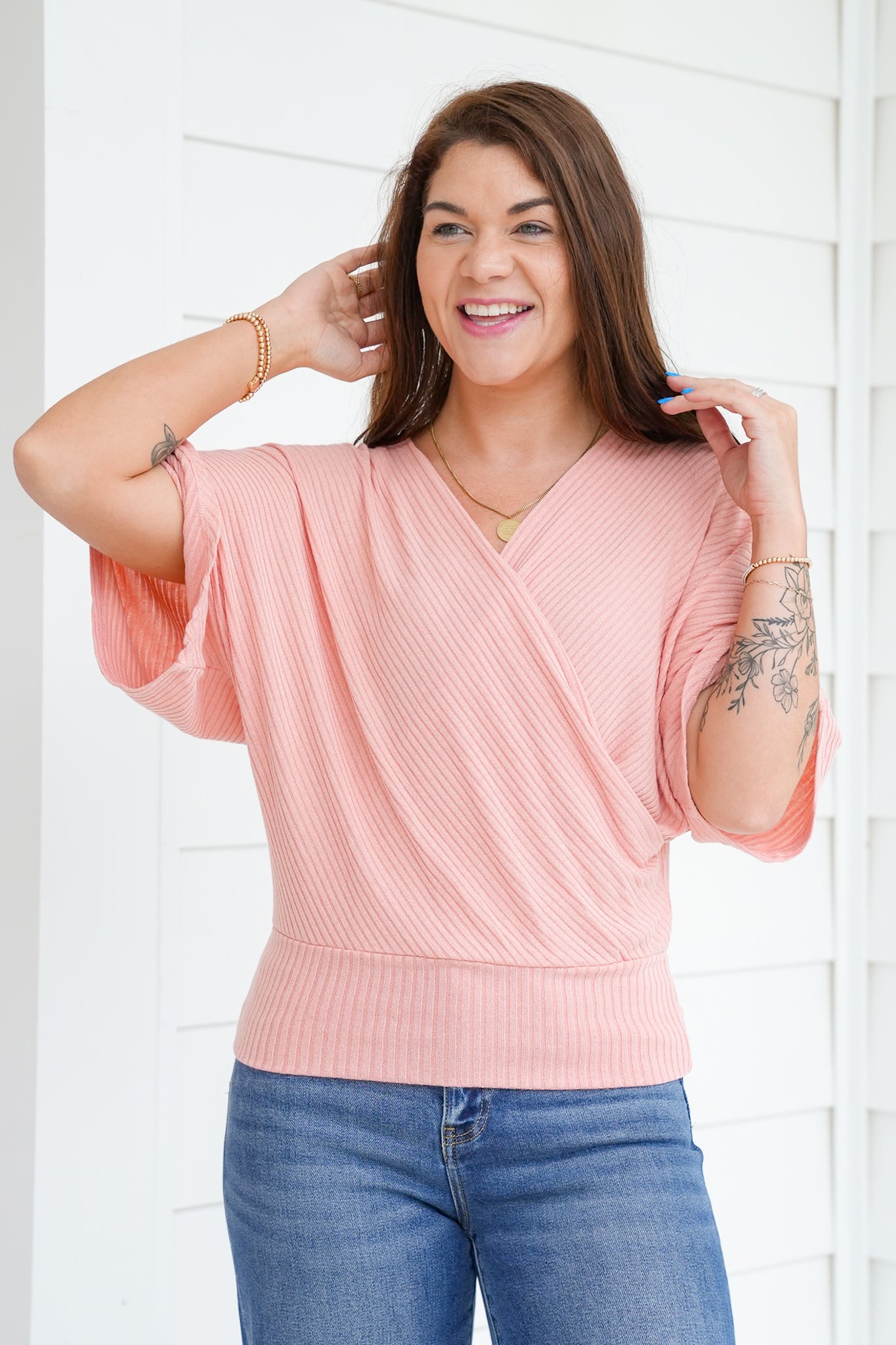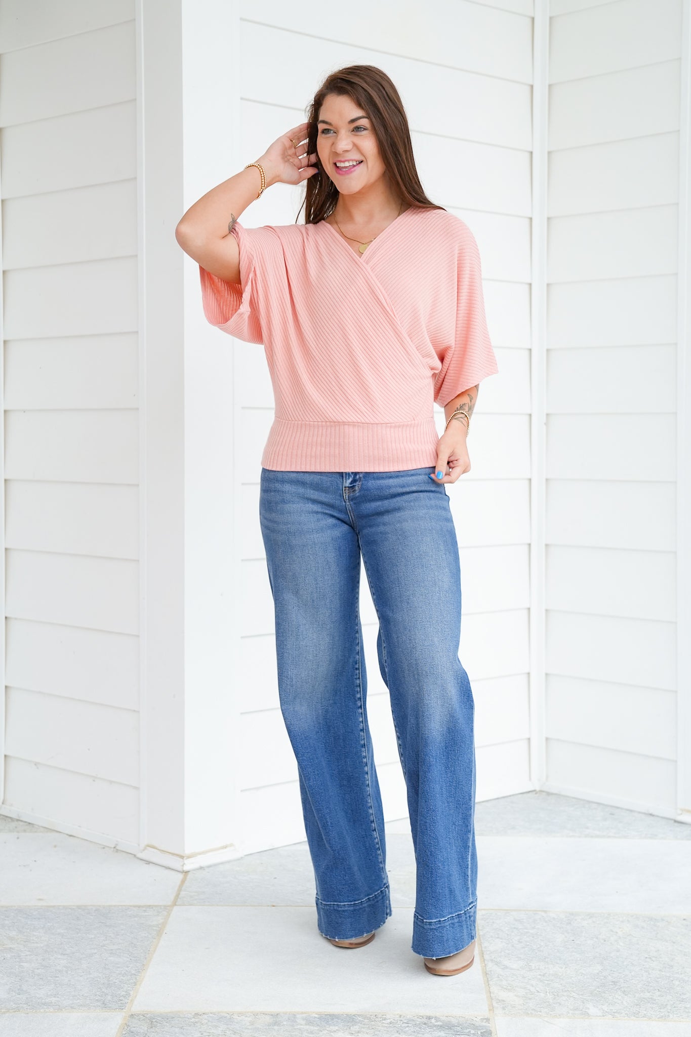 This top is the definition of chic comfort. The wrap style and dolman sleeves make it universally flattering, while the ribbed knit gives it that elevated, put-together feel. Pair it with jeans for an everyday look or with trousers and a necklace for dinner out. It’s a versatile piece you’ll reach for again and again.