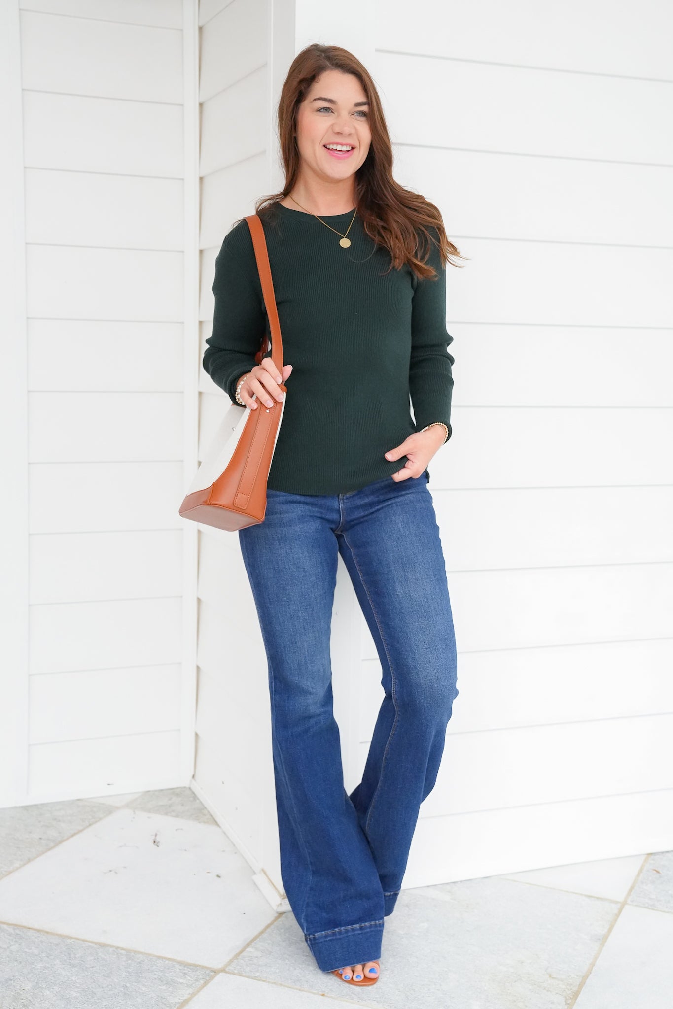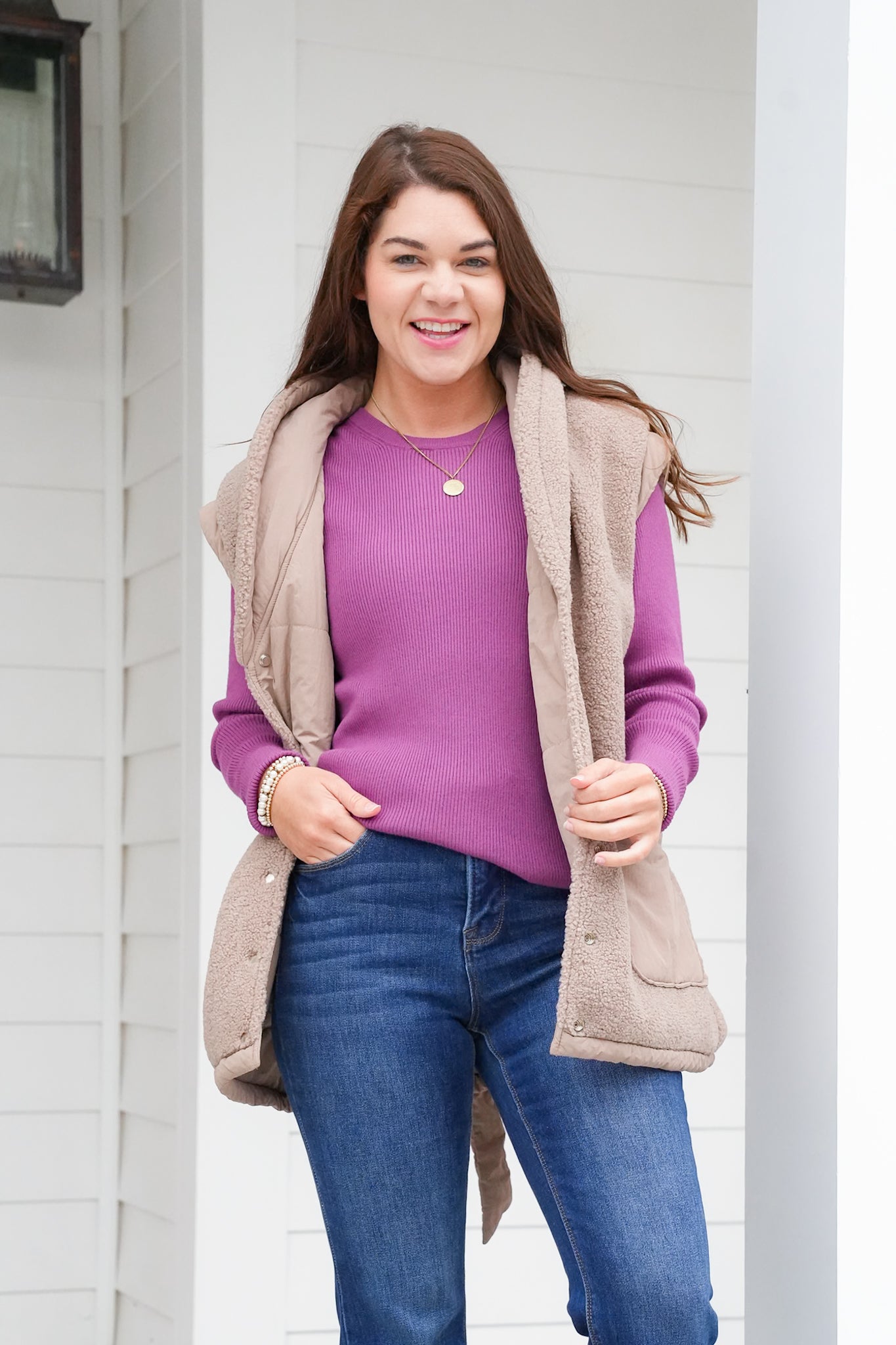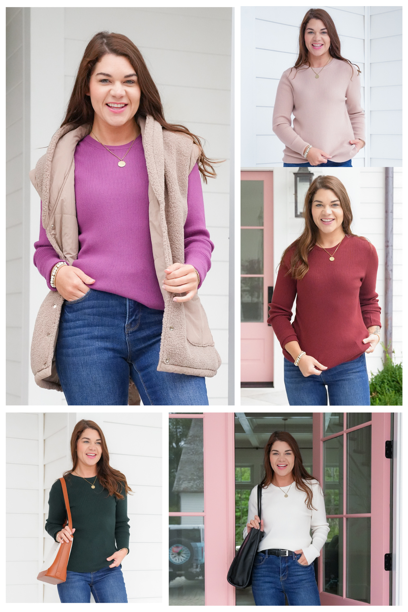 This ribbed sweater is a polished basic that feels anything but boring. The ribbed texture creates a flattering shape while the stretch makes it extra comfy for all-day wear. Dress it up under a blazer for work or style it with denim and booties for weekends—it’s that versatile staple piece you’ll keep reaching for.
