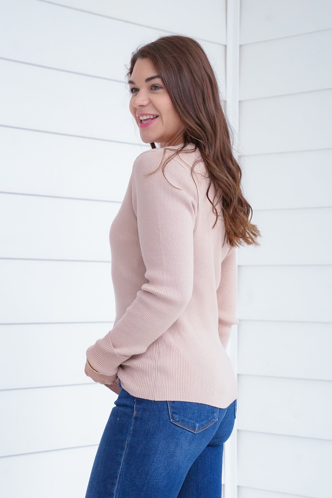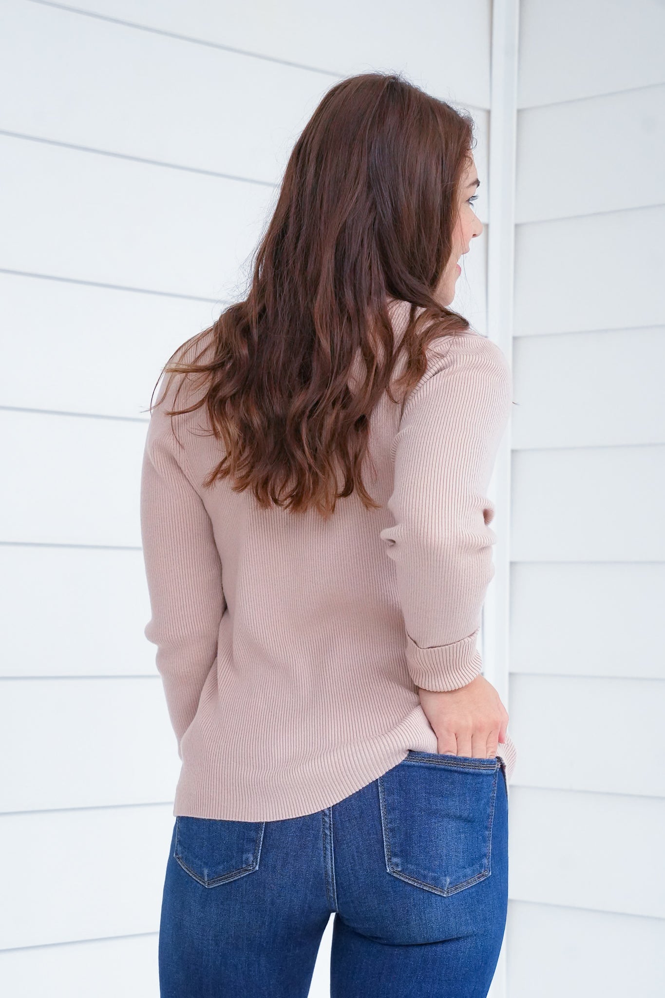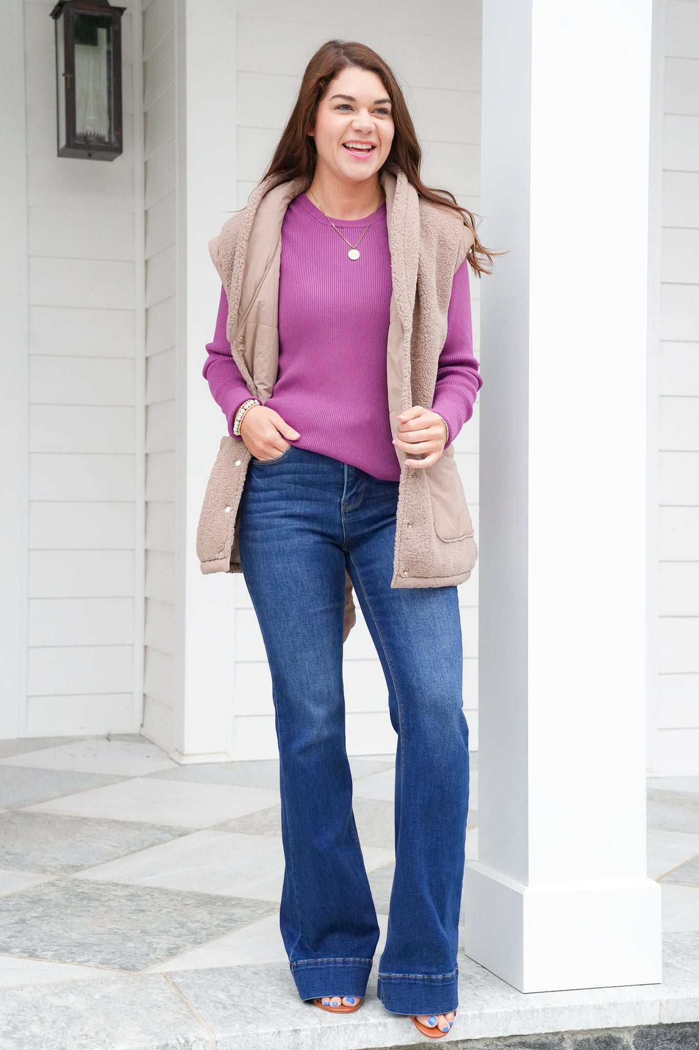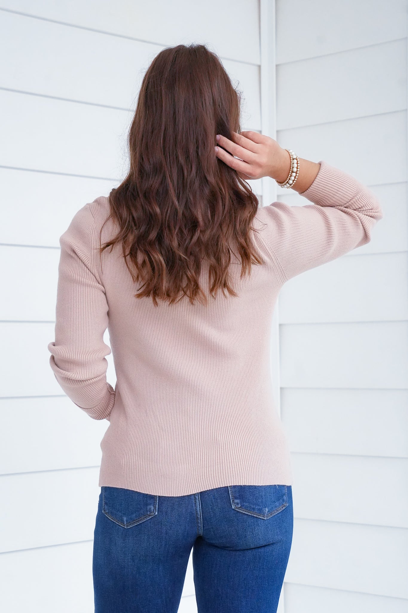This ribbed sweater is a polished basic that feels anything but boring. The ribbed texture creates a flattering shape while the stretch makes it extra comfy for all-day wear. Dress it up under a blazer for work or style it with denim and booties for weekends—it’s that versatile staple piece you’ll keep reaching for.