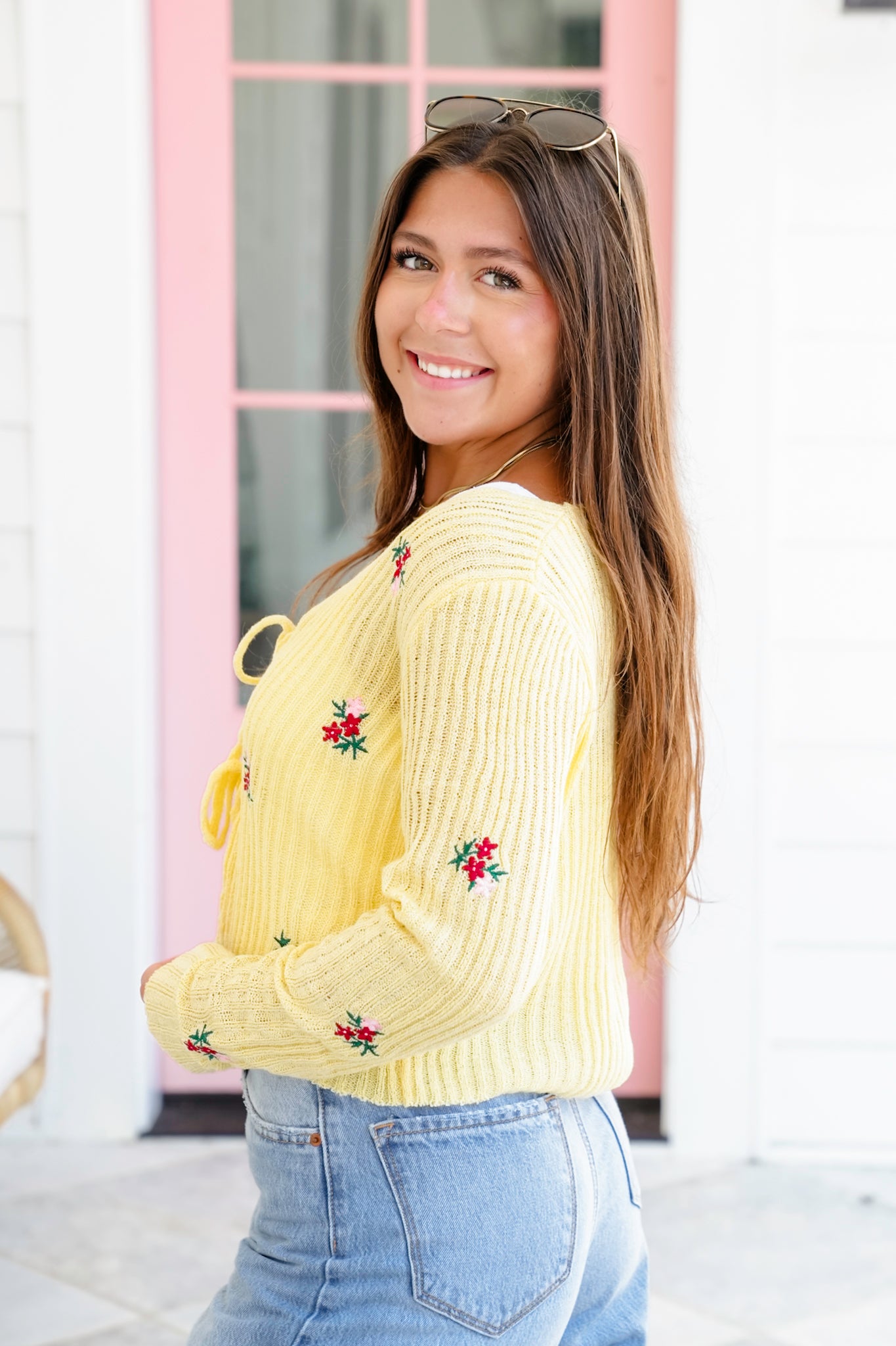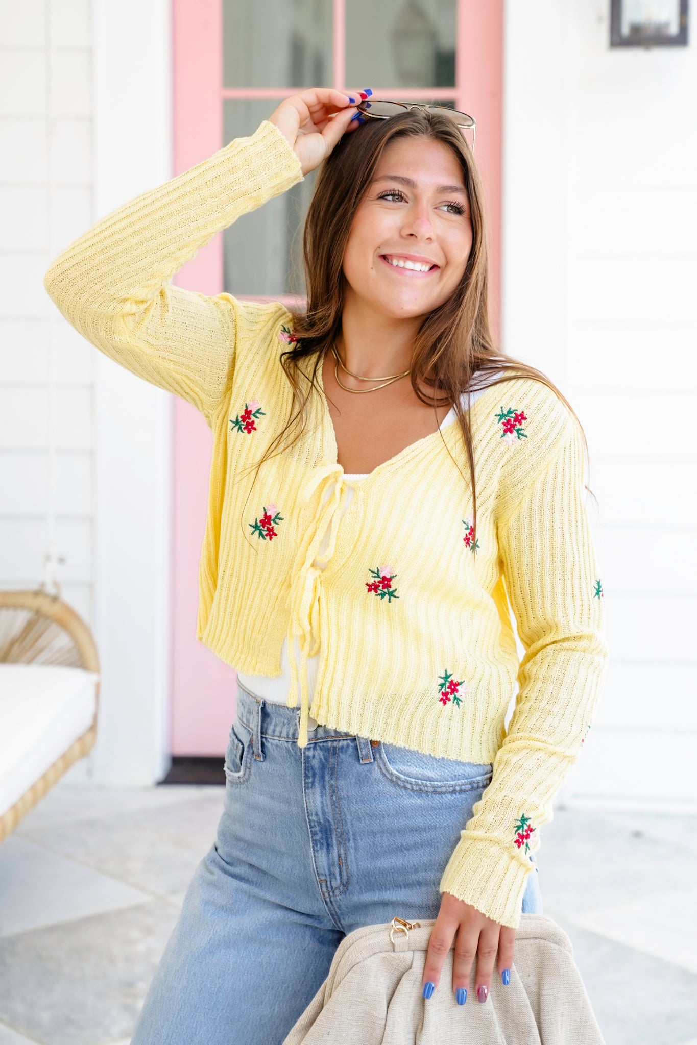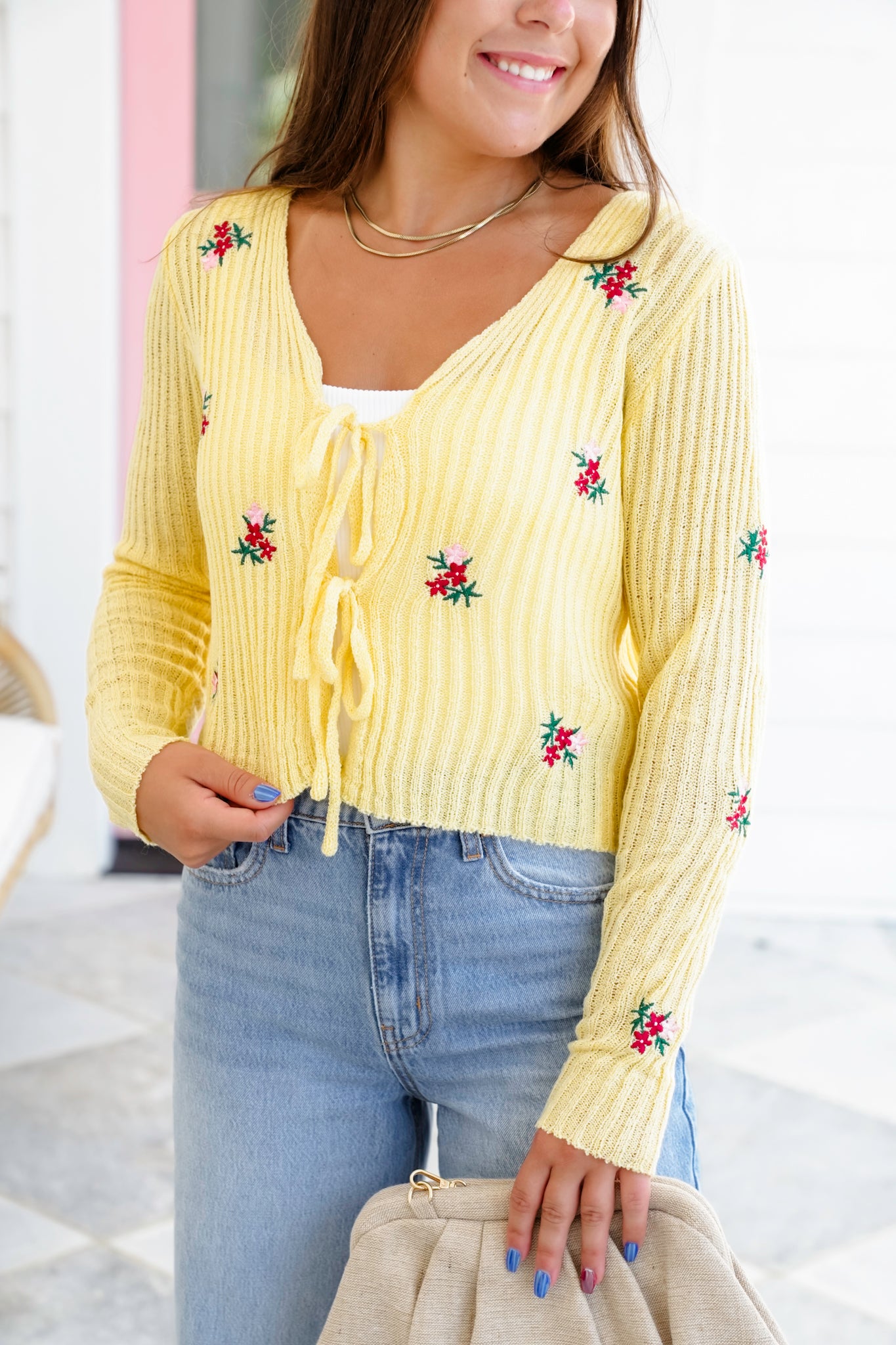 This flirty floral sweater is pure sunshine. With a dreamy tie-front closure, ultra-soft ribbed texture, and darling embroidered flowers, it delivers vintage vibes with a fresh, playful twist. Wear it tied over a cami, layered with a lace bralette, or styled open over a dress for a sweet but sassy finish.