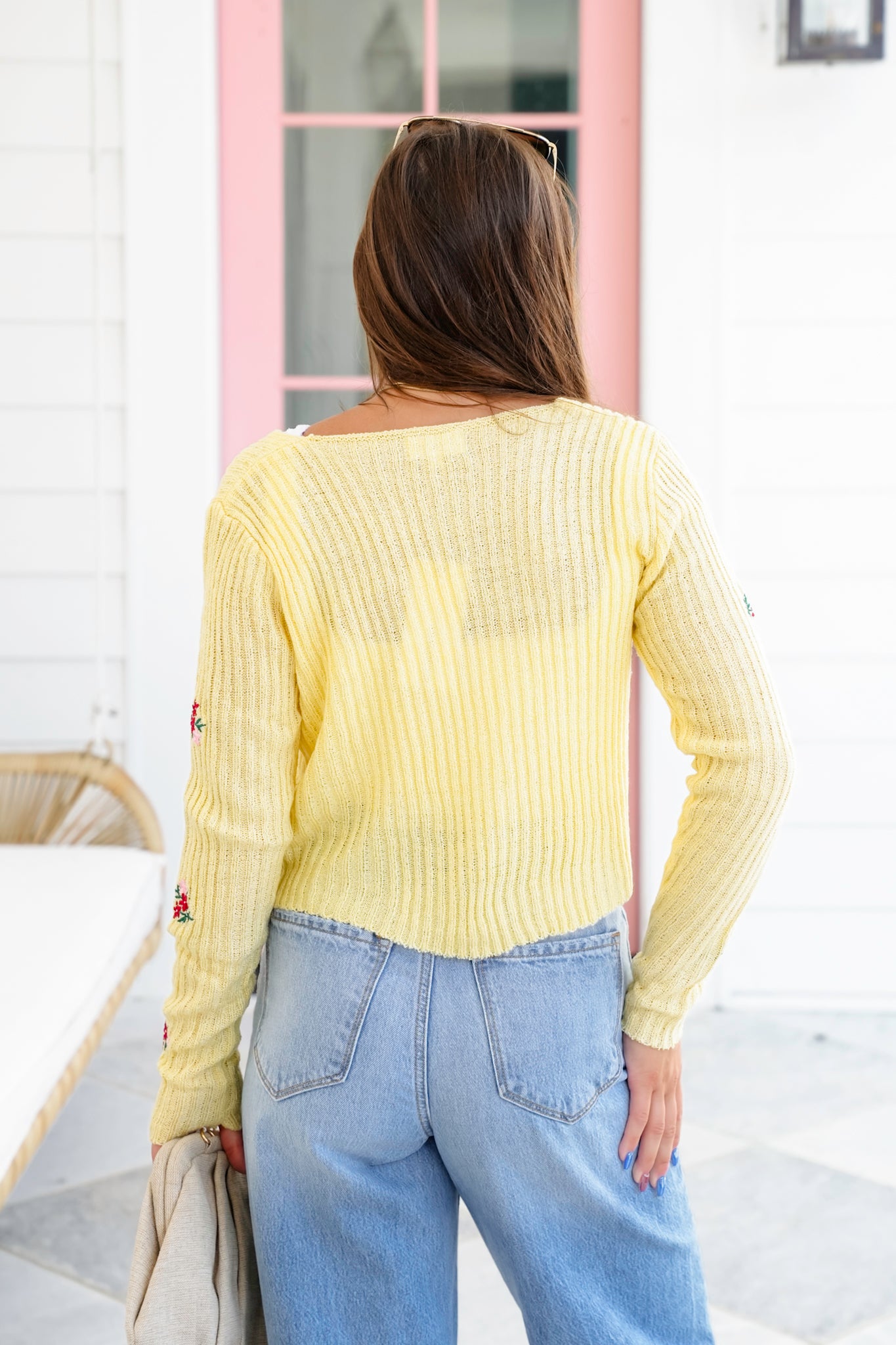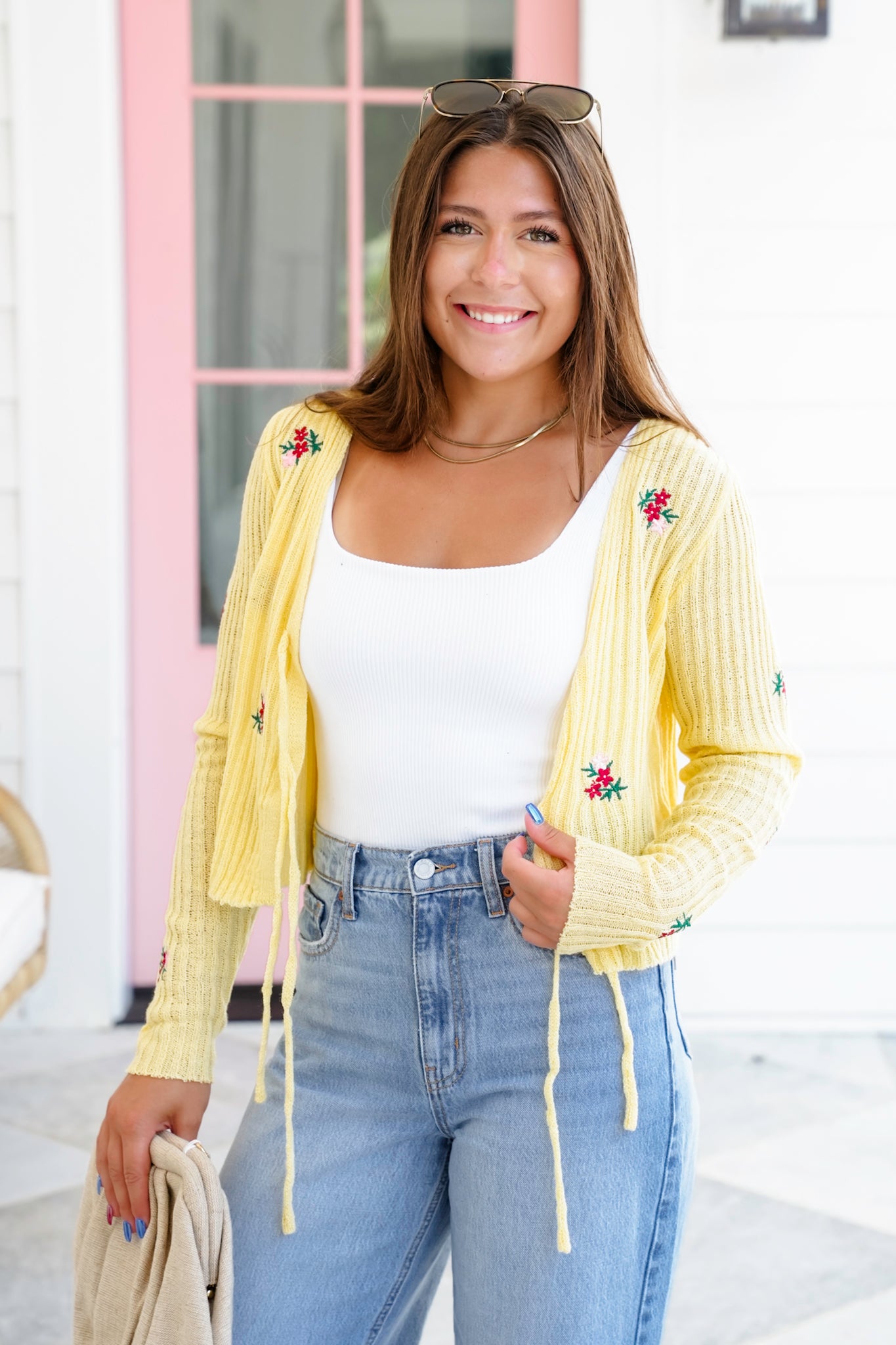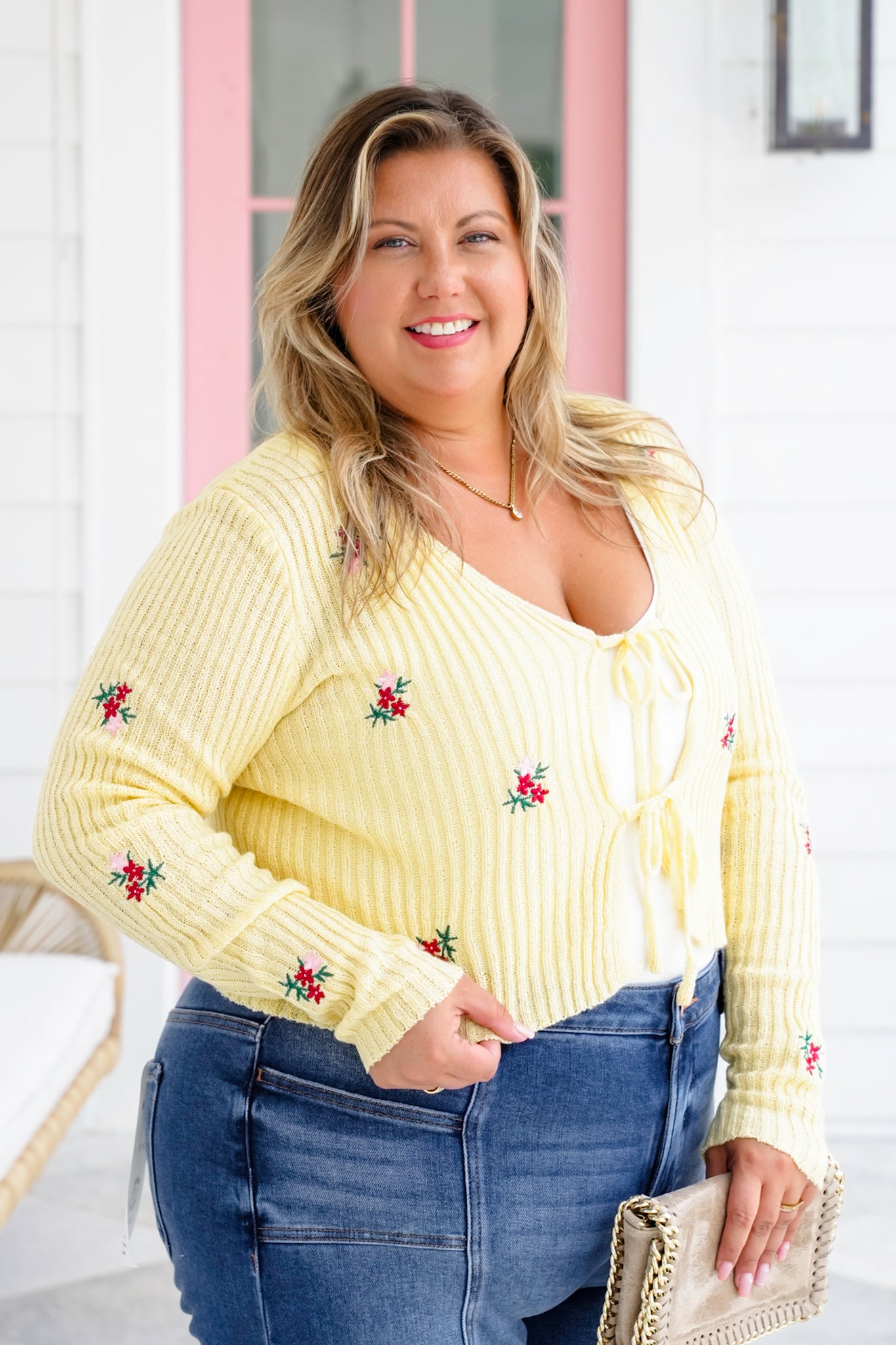 This flirty floral sweater is pure sunshine. With a dreamy tie-front closure, ultra-soft ribbed texture, and darling embroidered flowers, it delivers vintage vibes with a fresh, playful twist. Wear it tied over a cami, layered with a lace bralette, or styled open over a dress for a sweet but sassy finish.