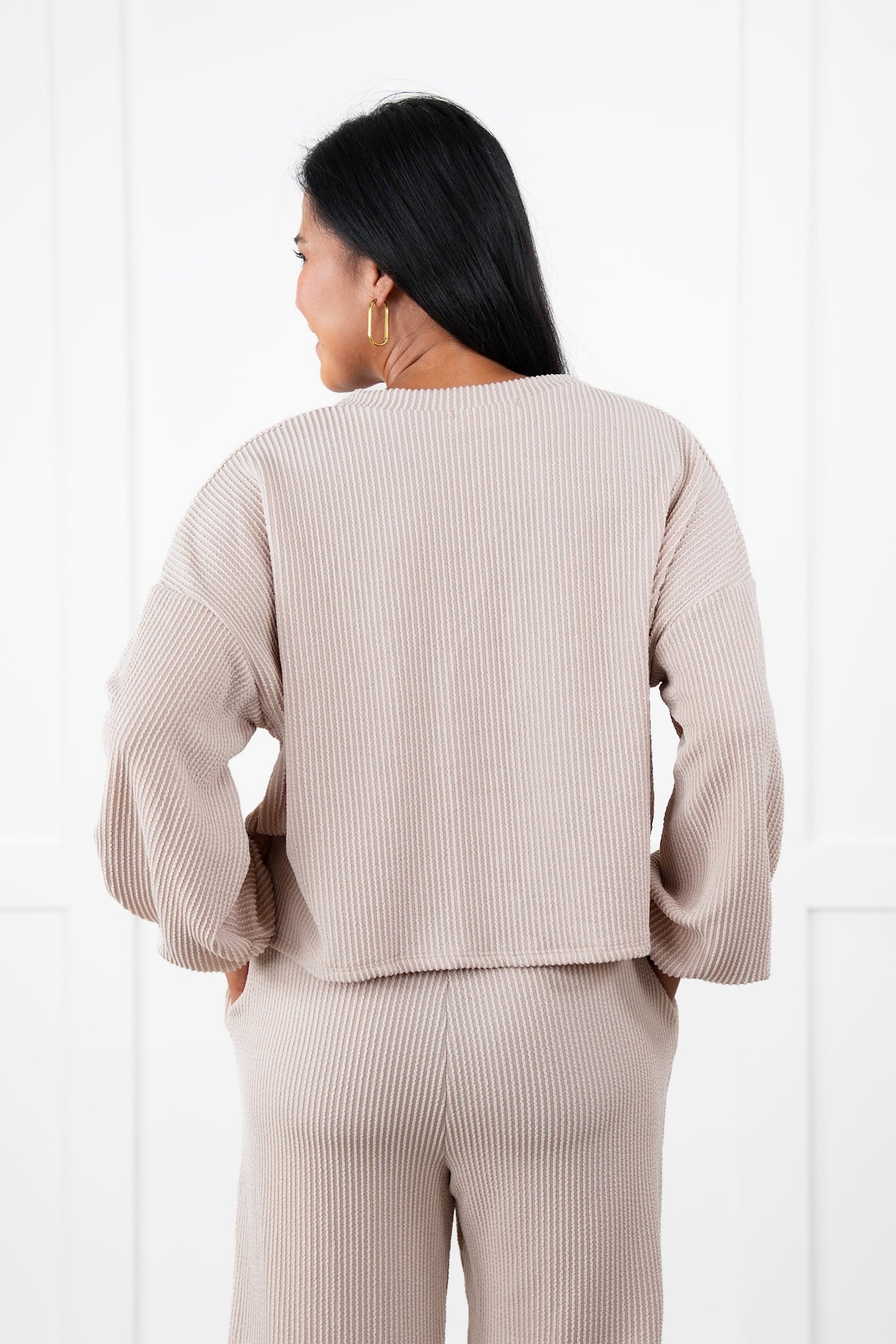 This lounge set is chic and fun! Perfect for lazy days at home or running casual errands, this set features that urban ribbing that we all love, giving it a cool vibe. The top is relaxed and roomy, with a round neck and long balloon sleeves, and the wide-leg pants have an elastic waistband to make sure you stay comfortable all day long. It is an easy choice for running errands, picking the kids up from school, or just hanging around the house.