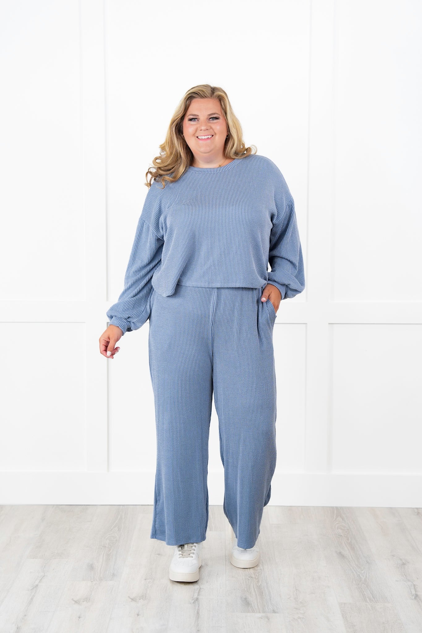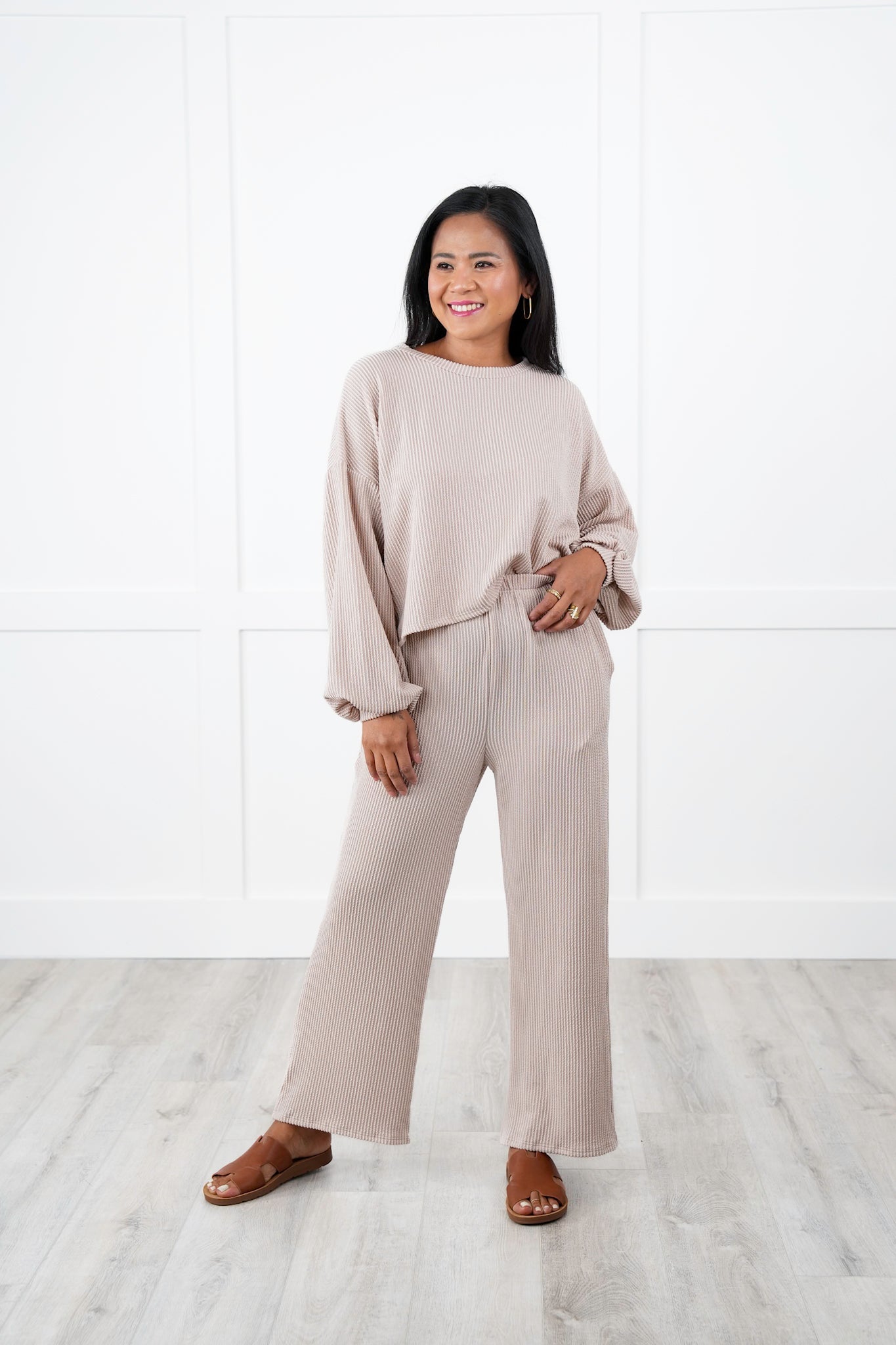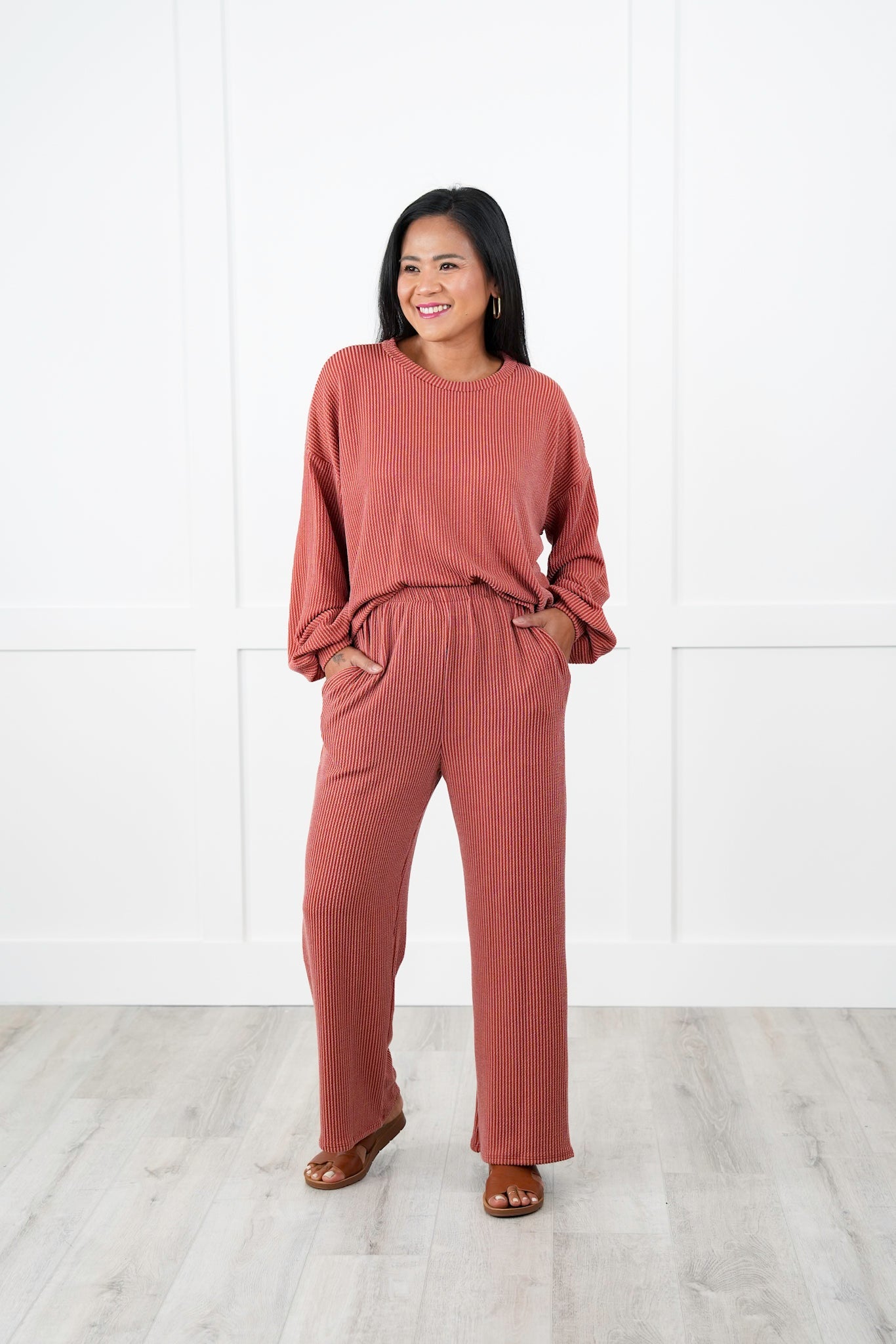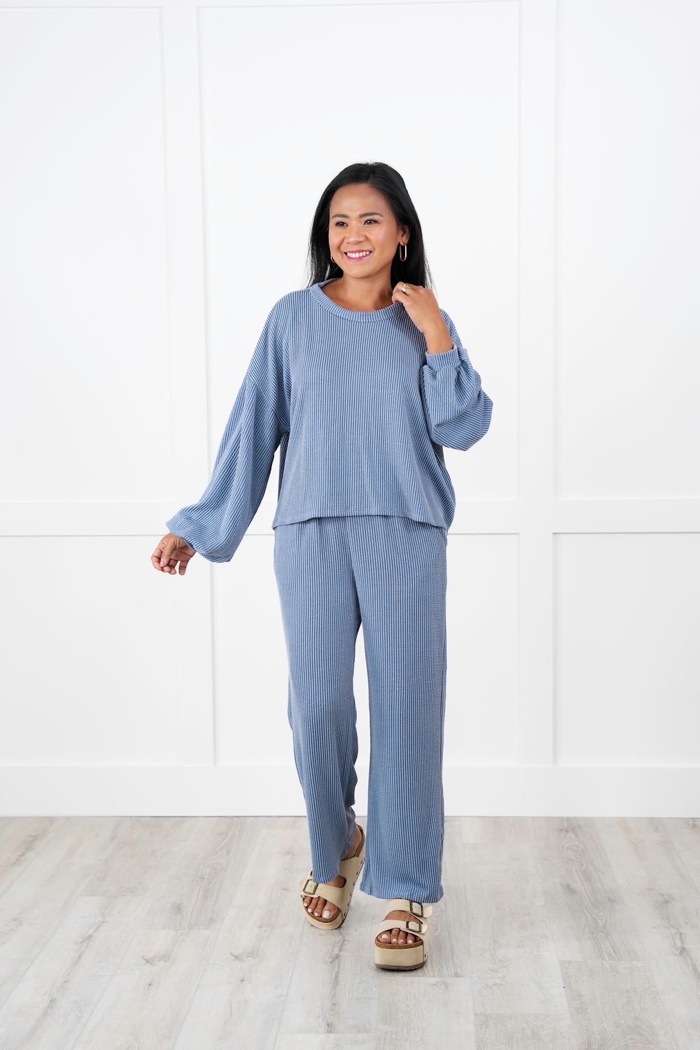 Fit: This lounge set is everything we love! The top has a round neck with long balloon sleeves, and the pants are a wide-leg style with a comfortable elastic waistband and side pockets. The urban ribbing is on trend and comfortable! This has a roomy, true-to-size fit. Follow the chart below!