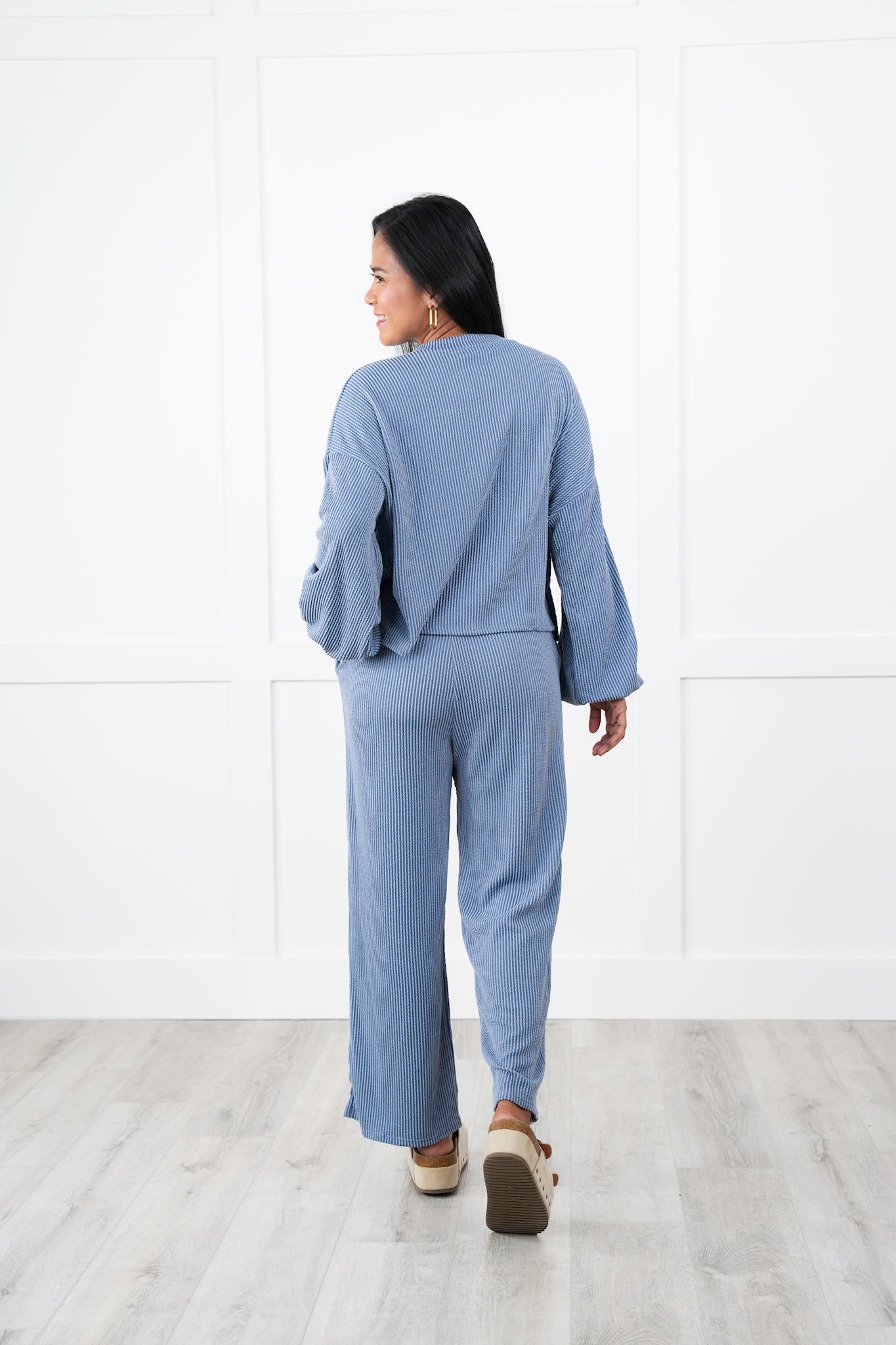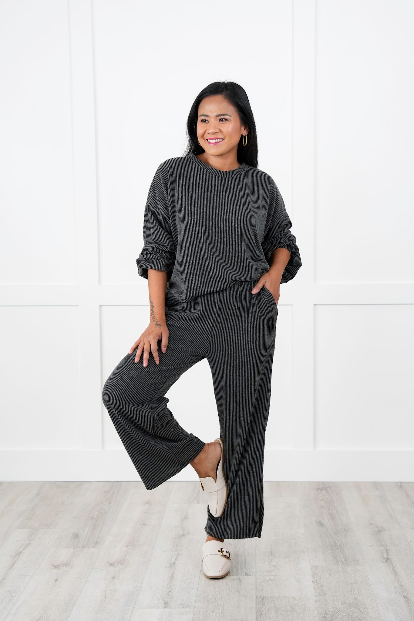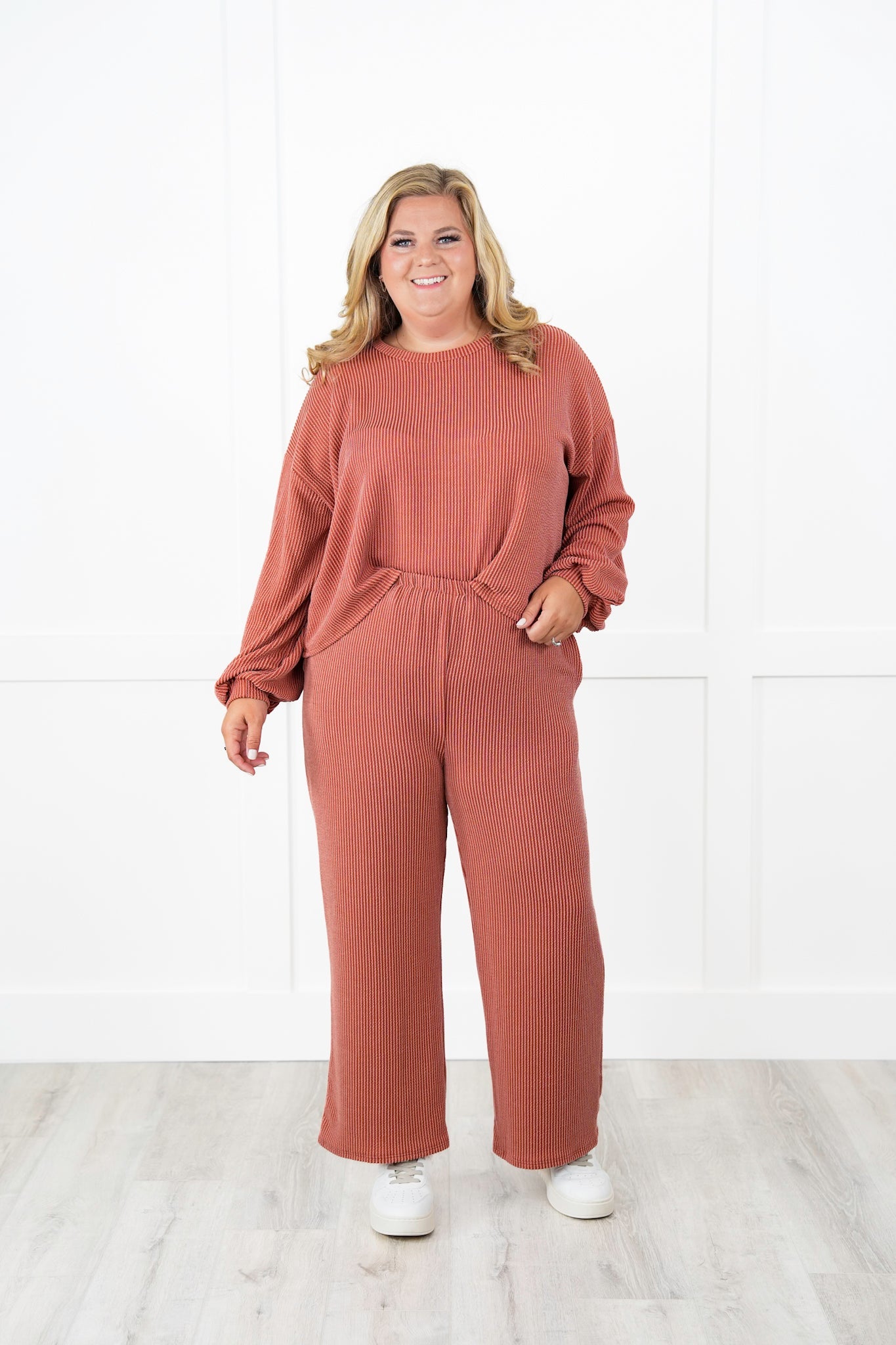 Fit: This lounge set is everything we love! The top has a round neck with long balloon sleeves, and the pants are a wide-leg style with a comfortable elastic waistband and side pockets. The urban ribbing is on trend and comfortable! This has a roomy, true-to-size fit. Follow the chart below!
