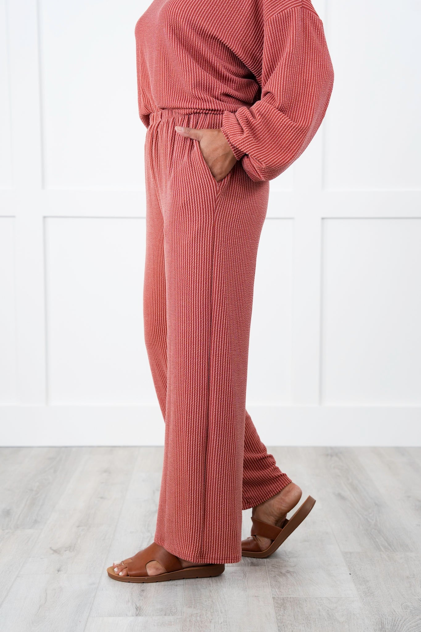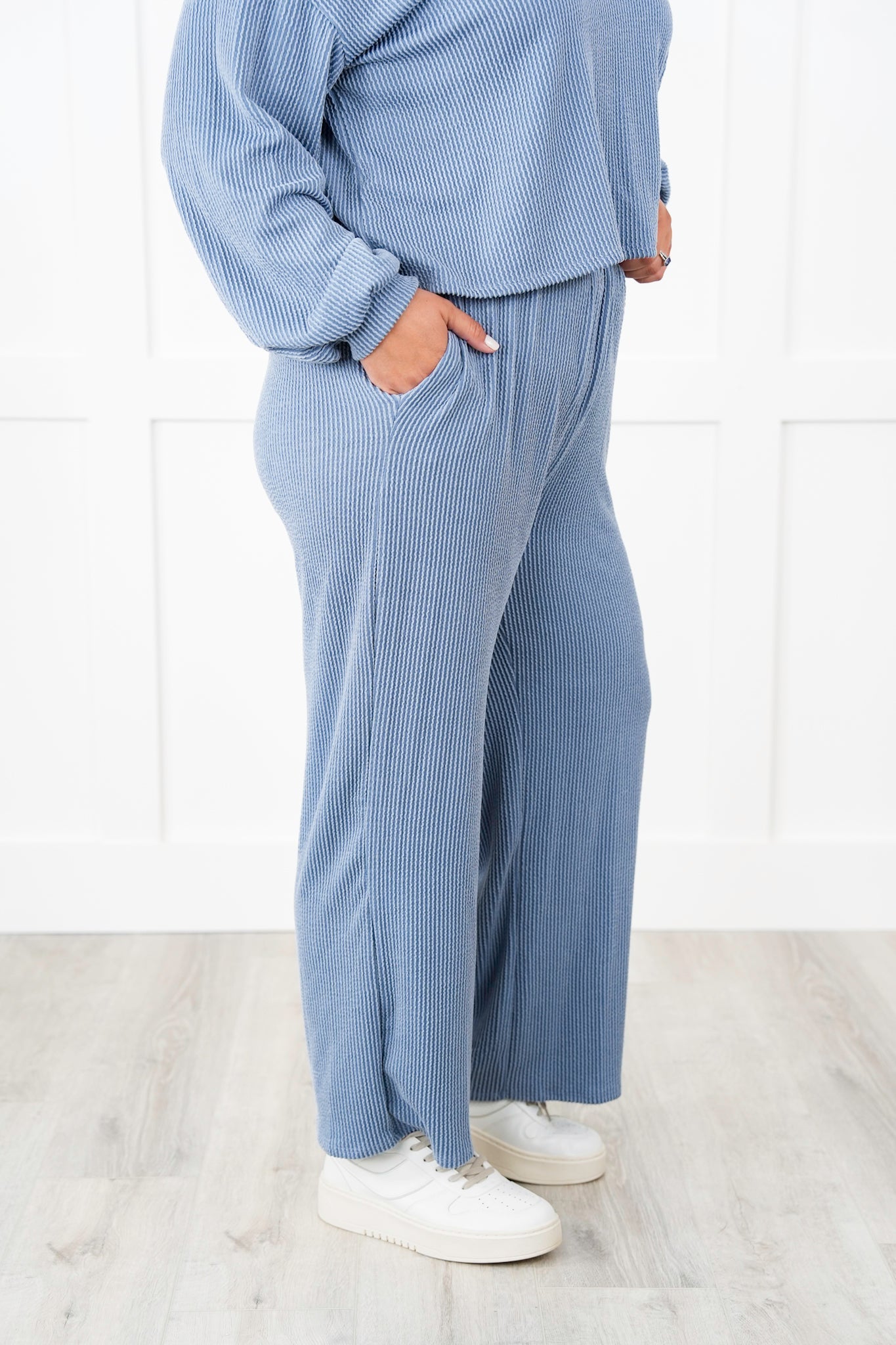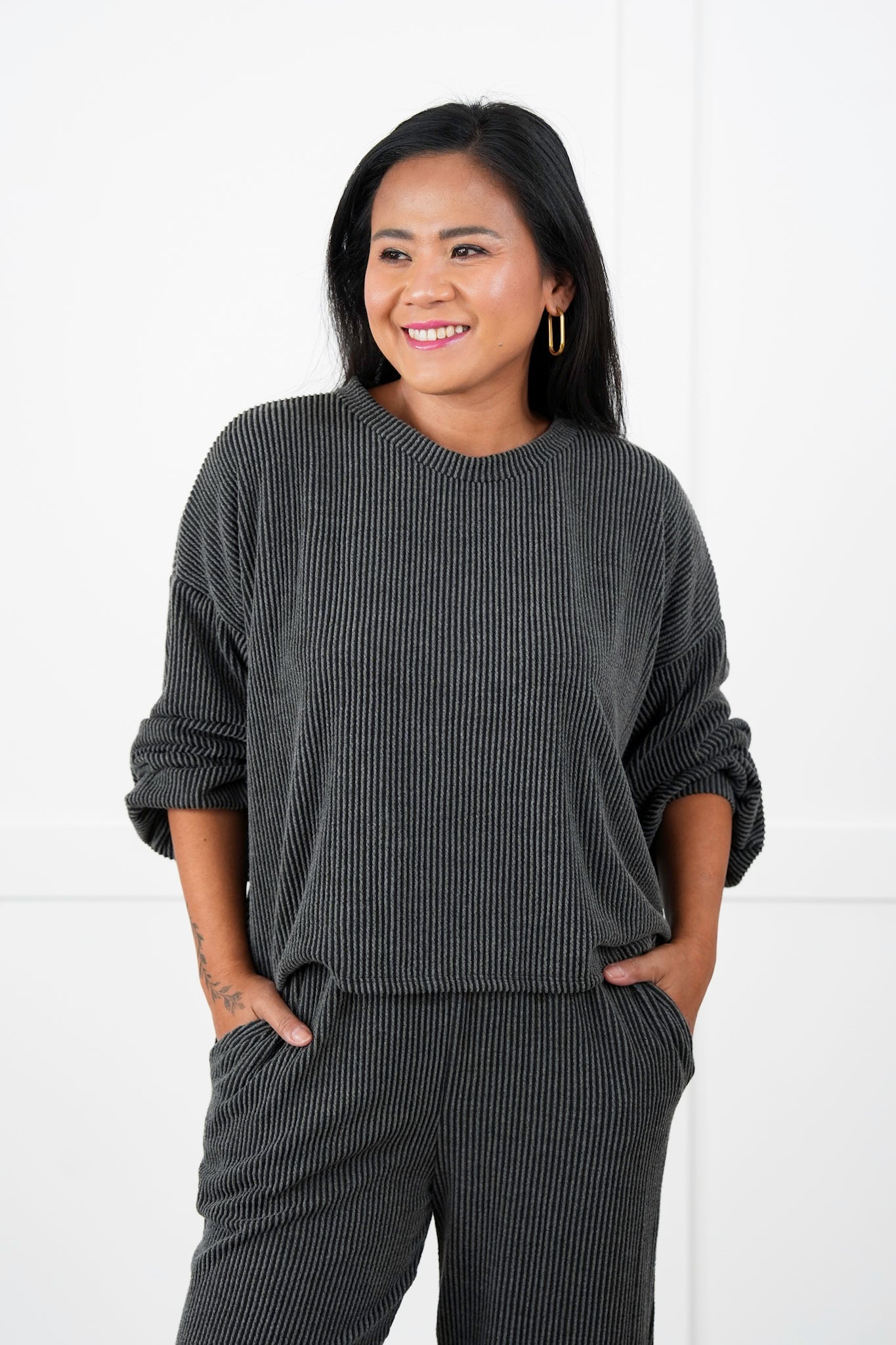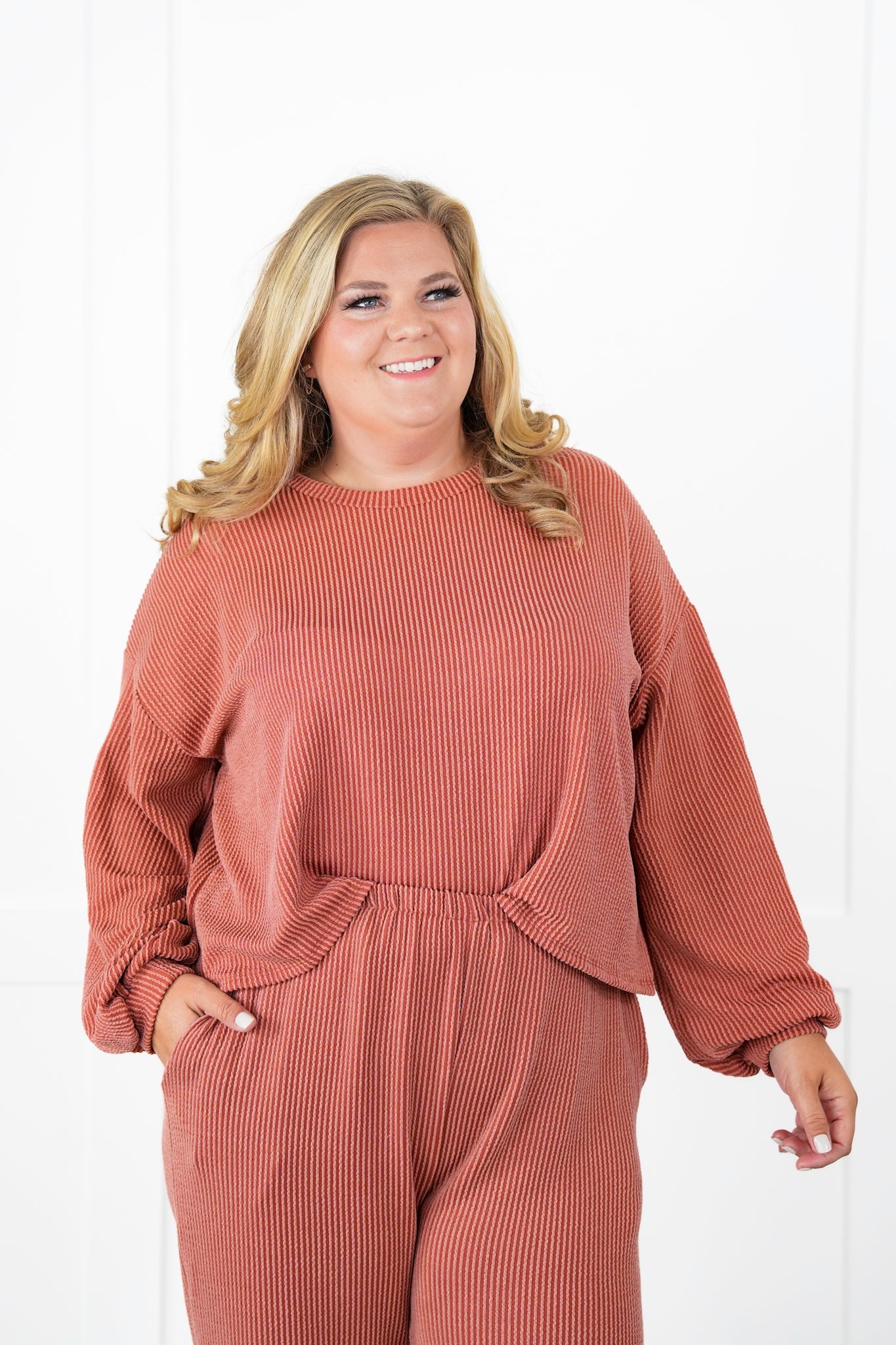 Fit: This lounge set is everything we love! The top has a round neck with long balloon sleeves, and the pants are a wide-leg style with a comfortable elastic waistband and side pockets. The urban ribbing is on trend and comfortable! This has a roomy, true-to-size fit. Follow the chart below!