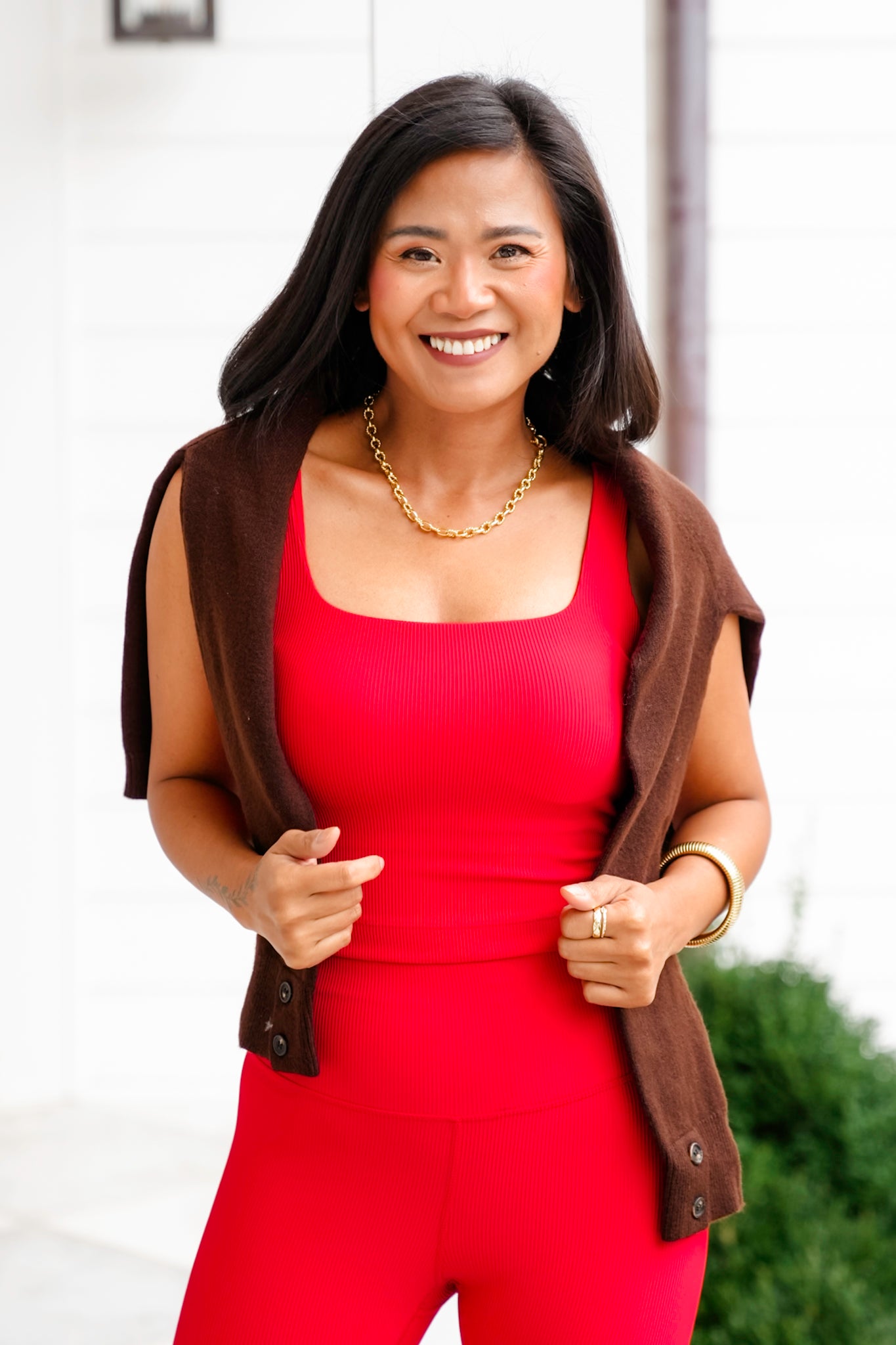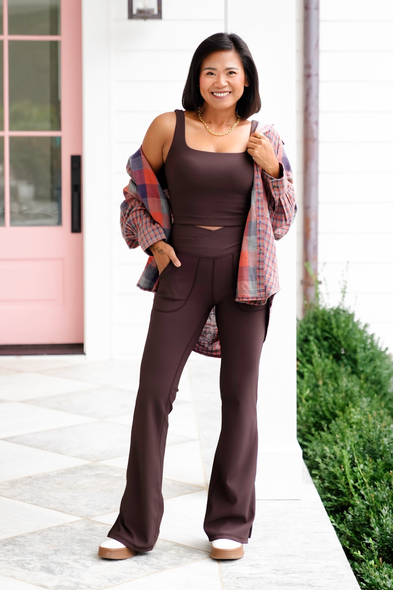 * Square neckline that creates a flattering, balanced look