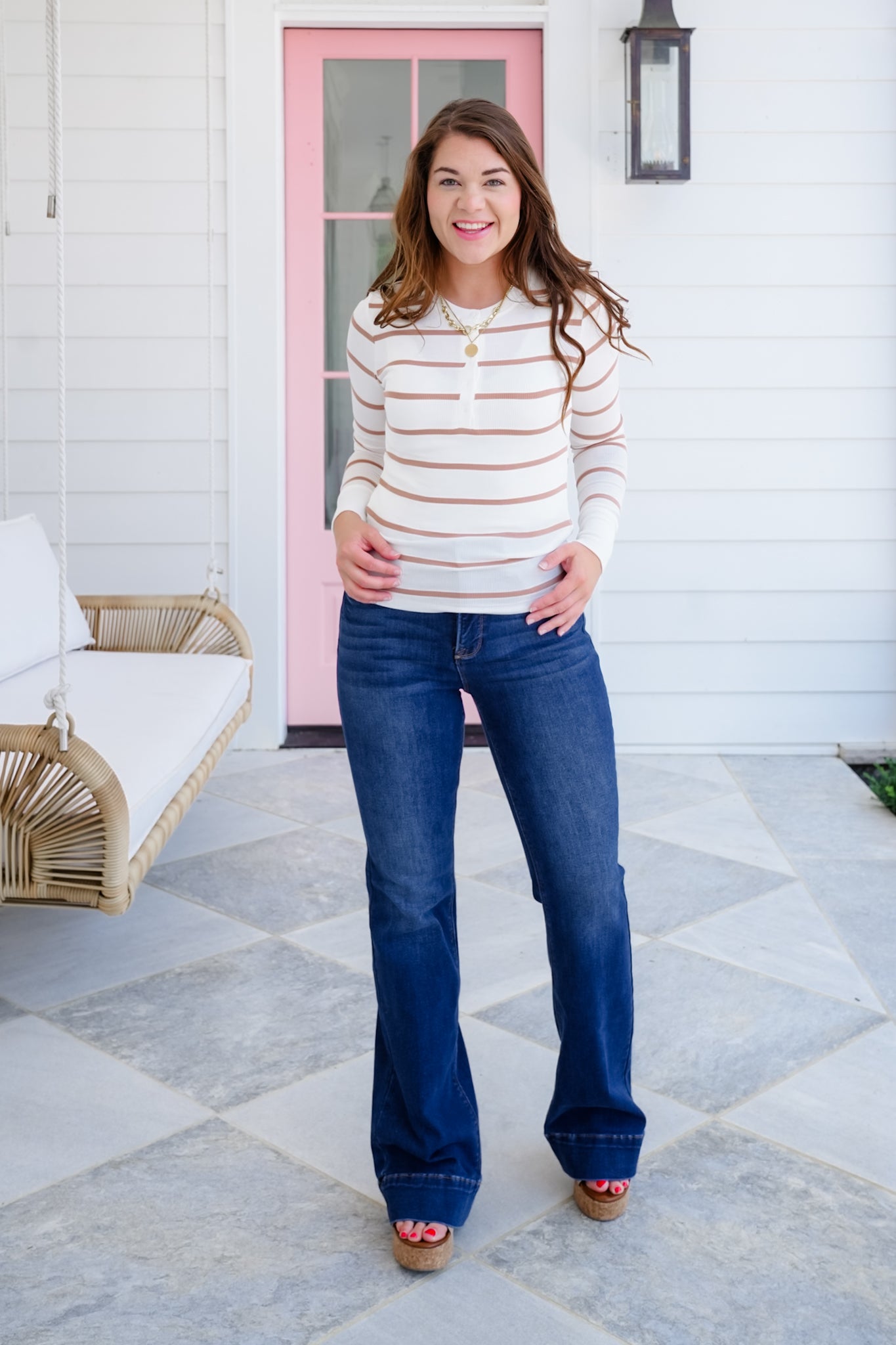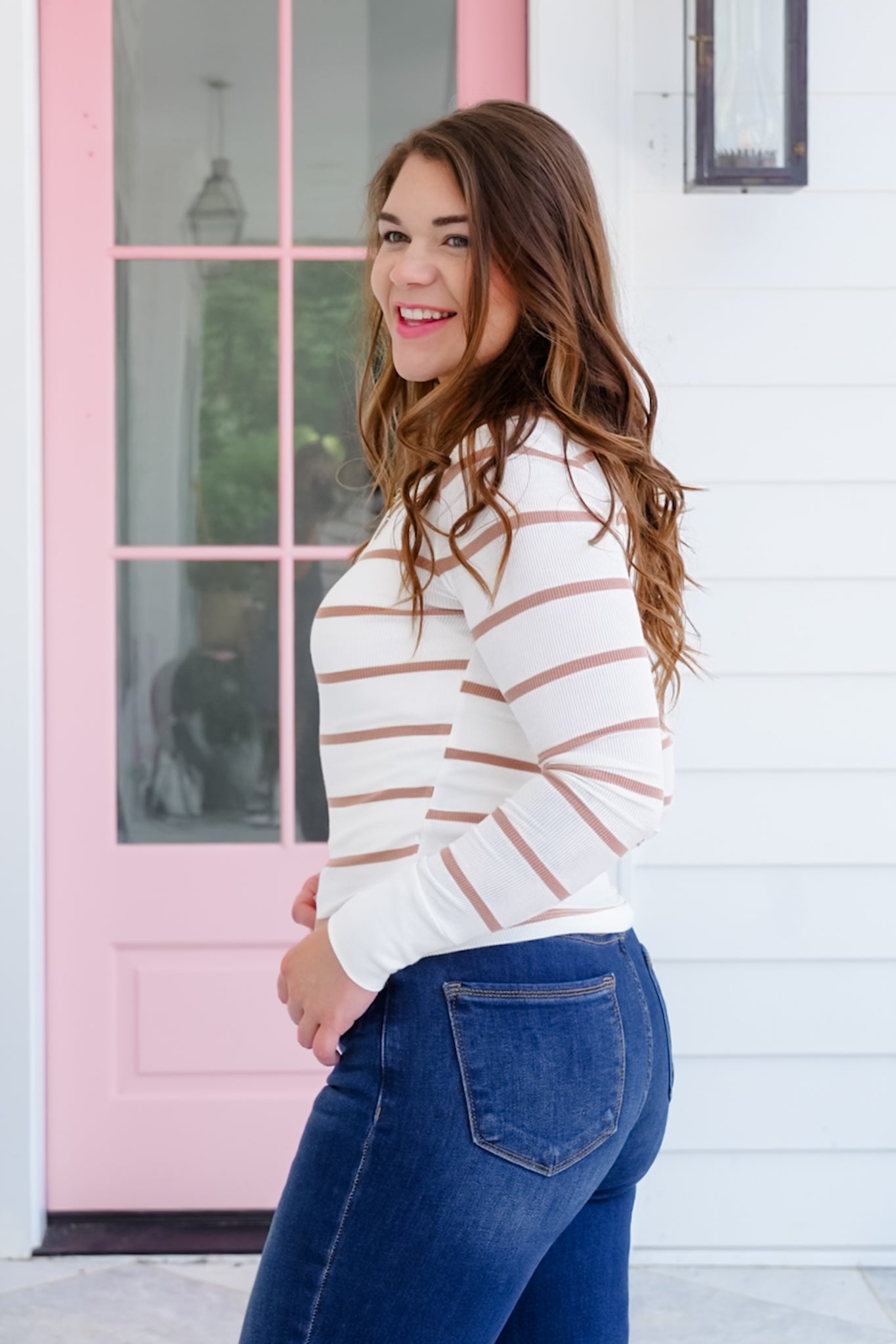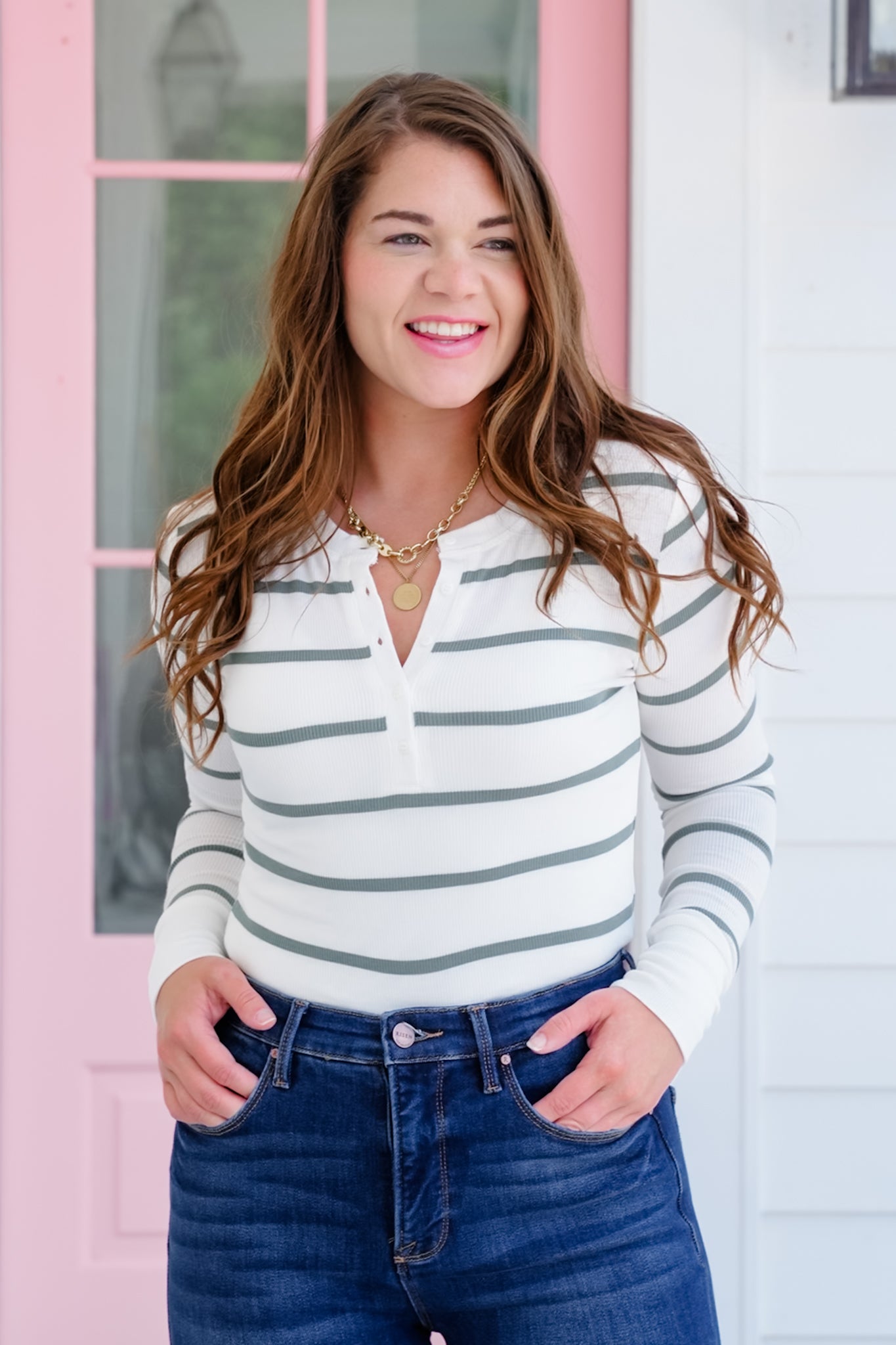 This little striped top is a layering dream! With a fitted shape and a stretchy micro-ribbed knit, it hugs just right. The quarter-button neckline adds a casual touch that’s great for pairing with jeans, shorts, or even tucked into a skirt. Whether you go for the green, caramel, or grey, this one’s an easy win for your everyday wardrobe.
