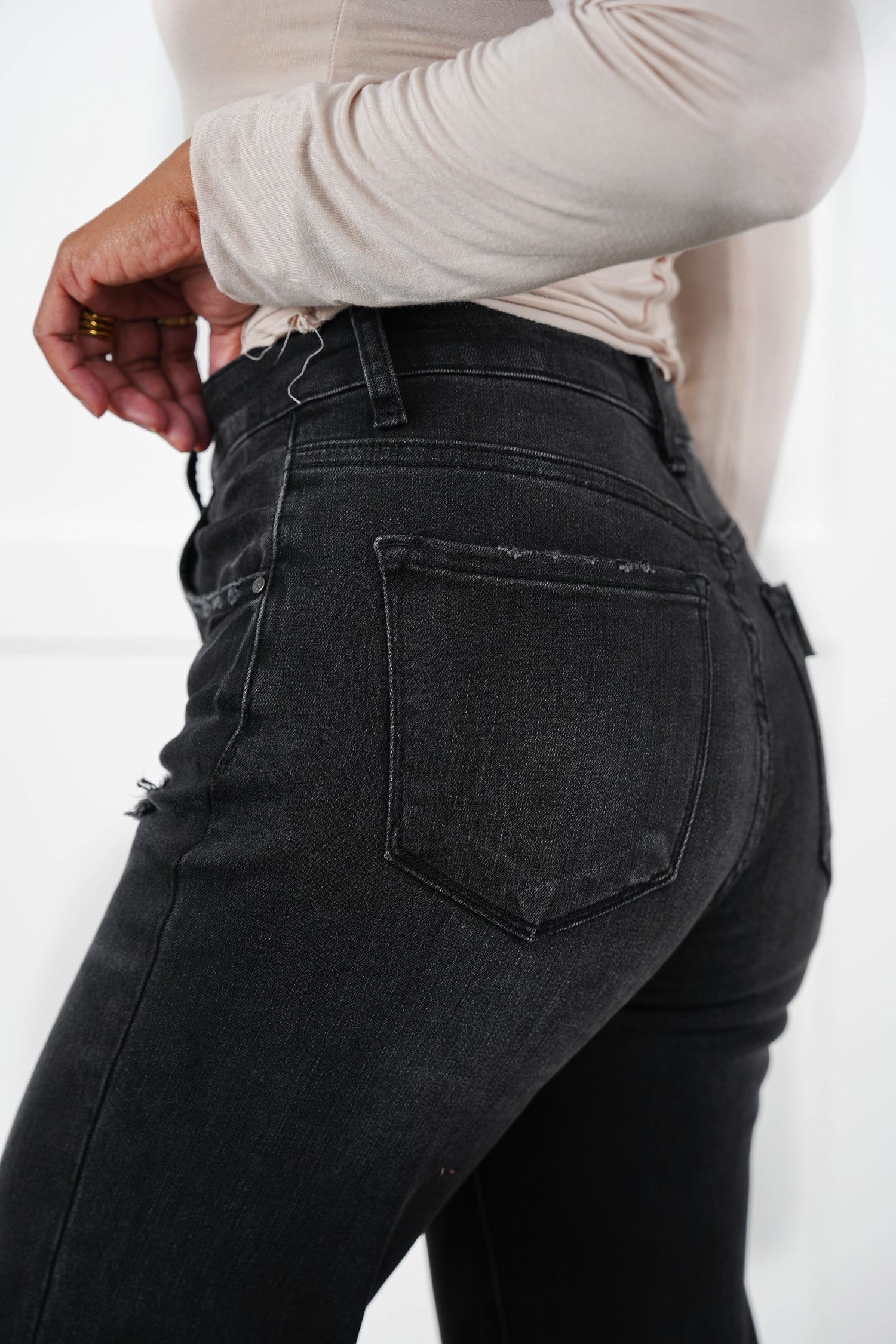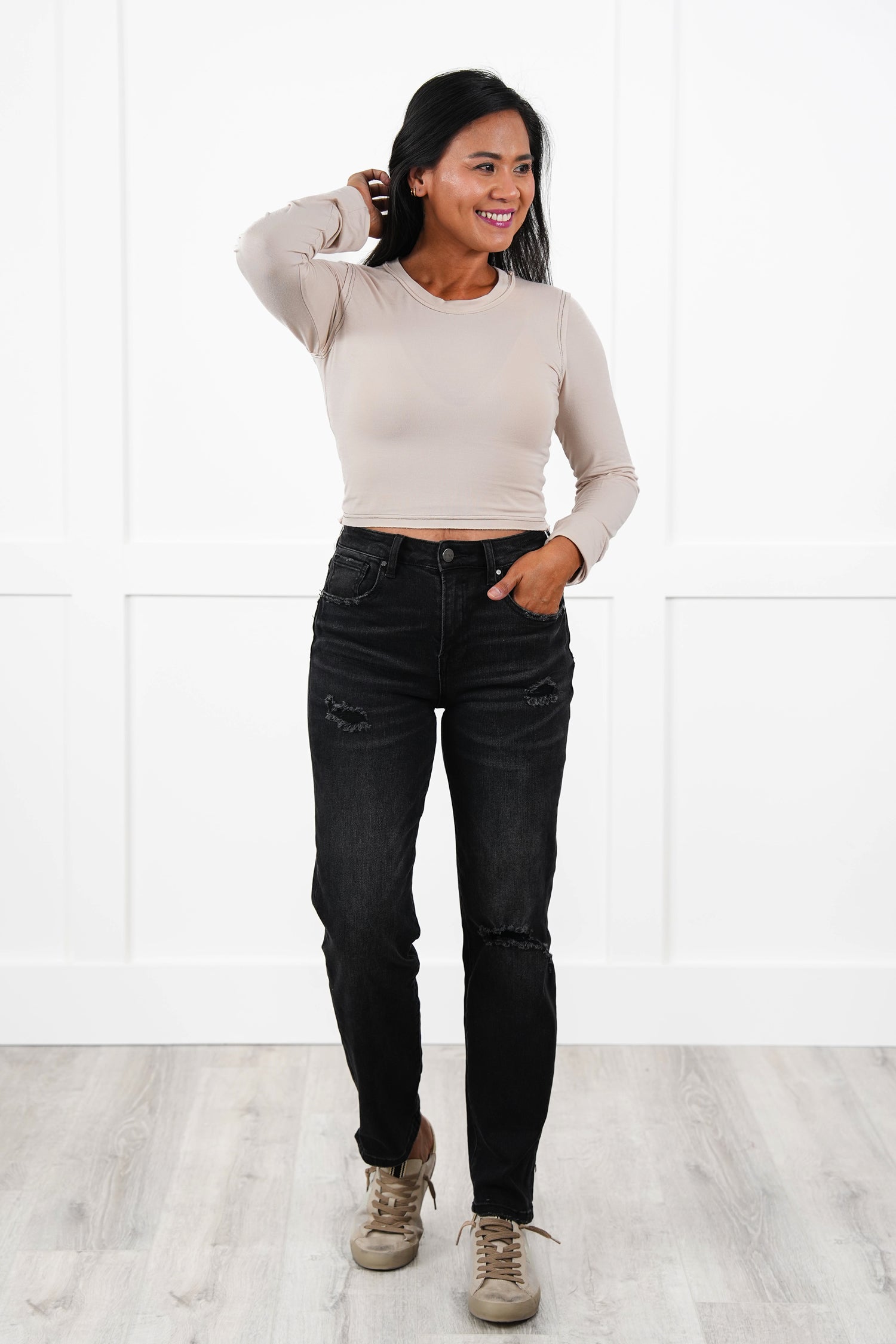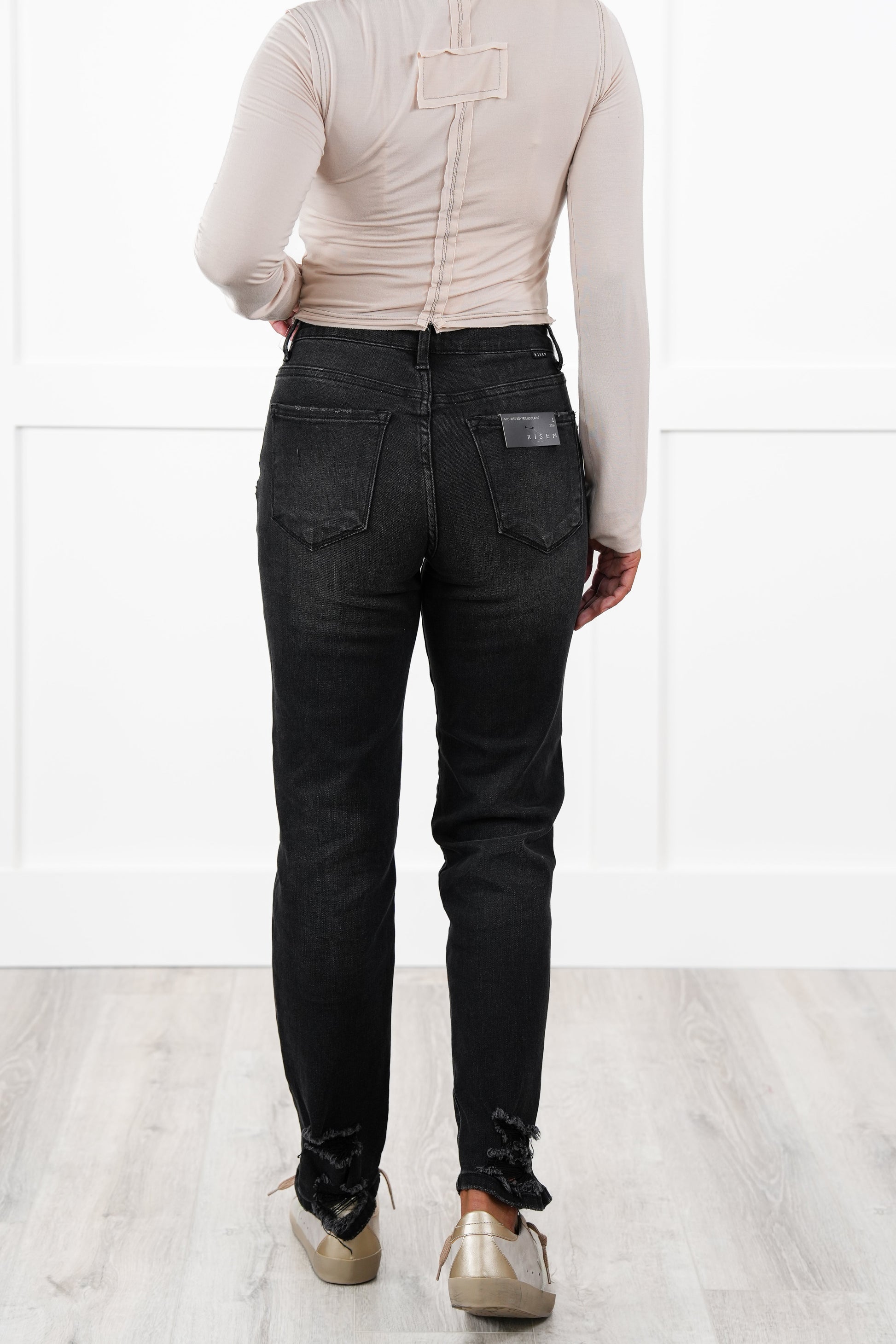These boyfriend jeans by Risen are made of black denim and are a great way to switch it up from your everyday blue pairs! They have a relaxed fit with distressing throughout and a rolled hem for an aesthetic that can go edgy or casual depending on how you style it. Go for a moody all-black vibe with a moto jacket and combat boots, or keep it classy, yet casual with a fitted v neck and Shu Shop sneakers!