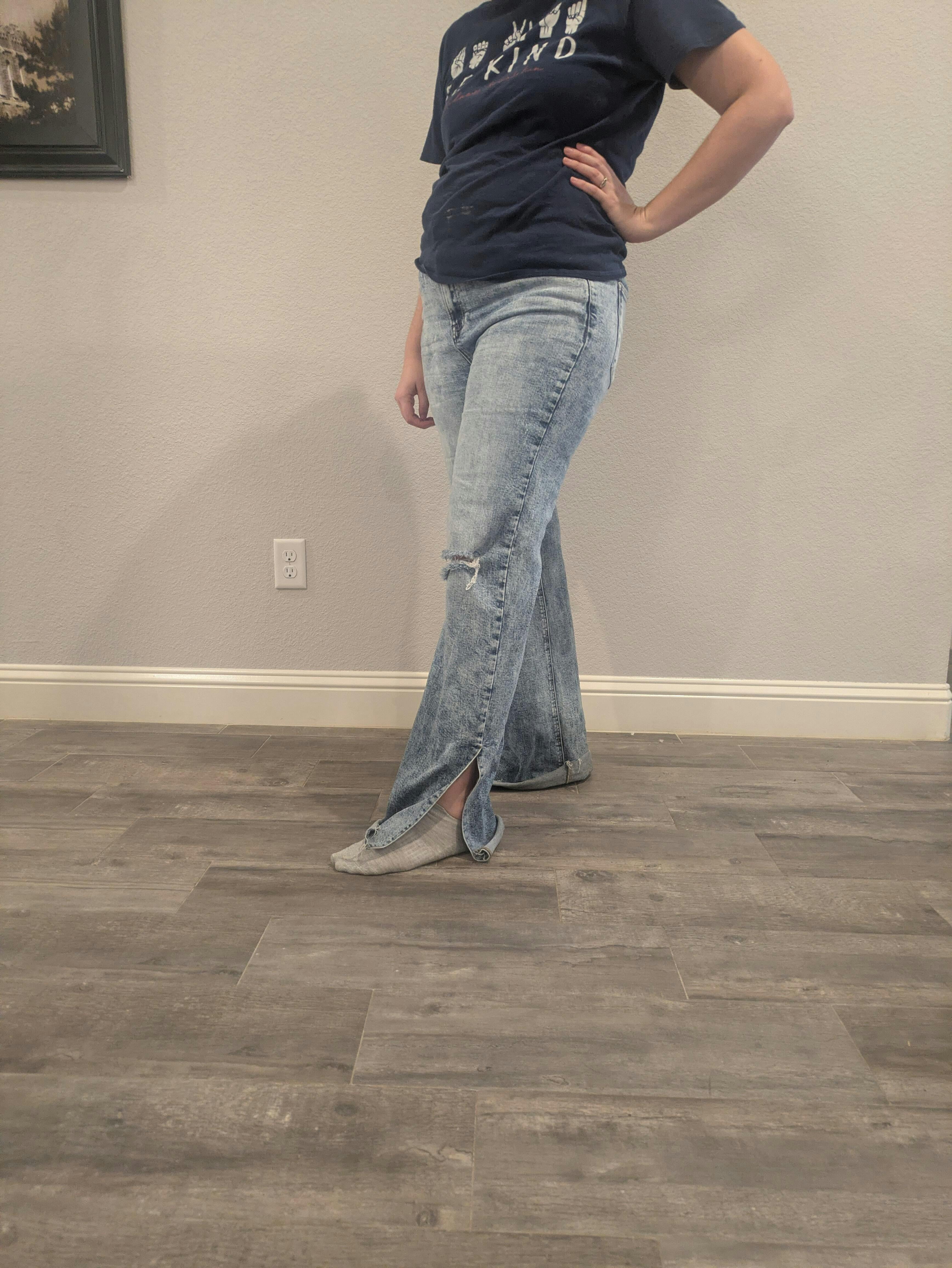 Next is fit for this pair: These jeans have a subtle high rise, a straight leg fit, amazing stretch, and that sexy side slit!