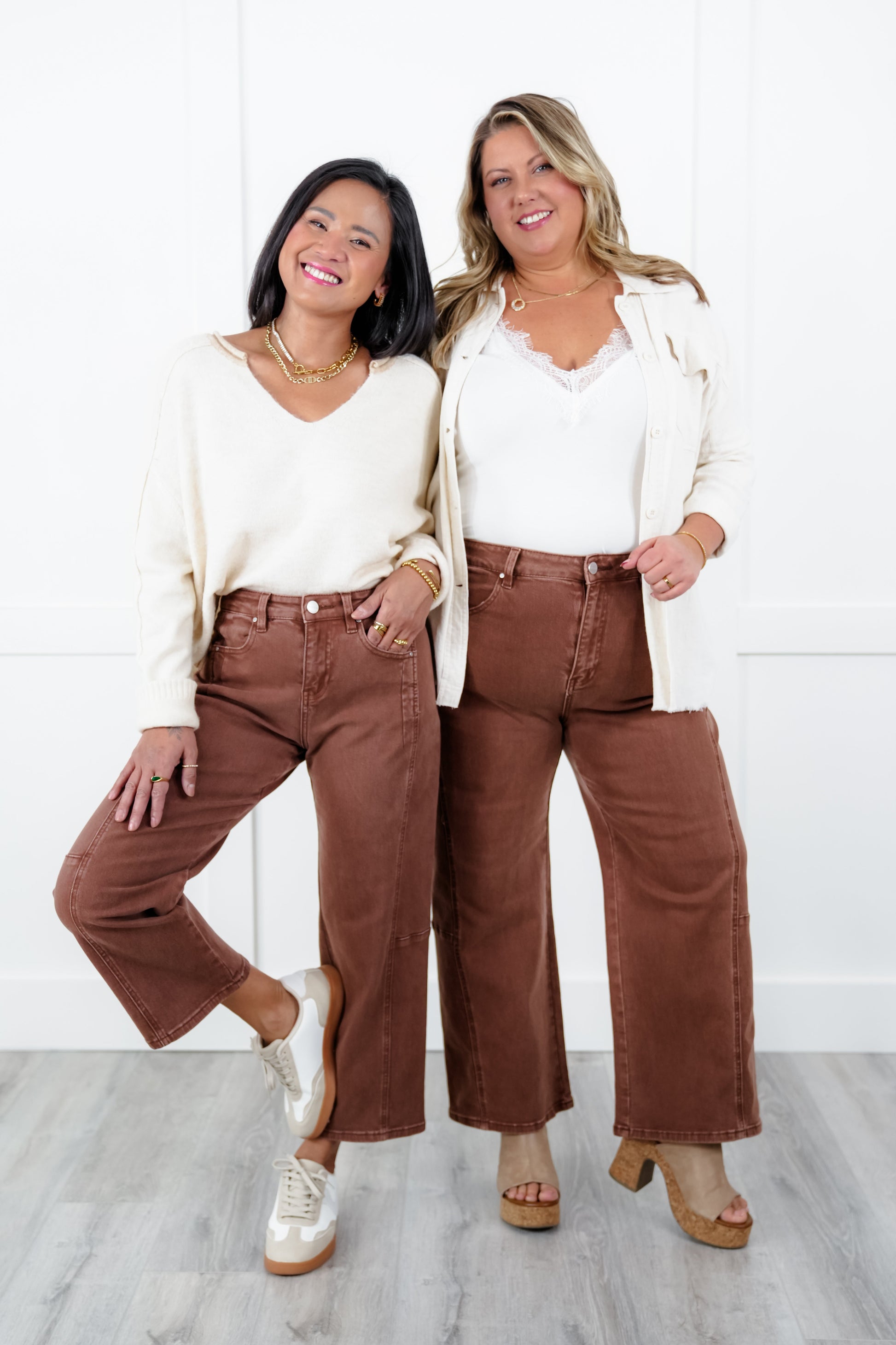 Risen High Rise Brown Cropped Wide Leg Barrel Jeans
