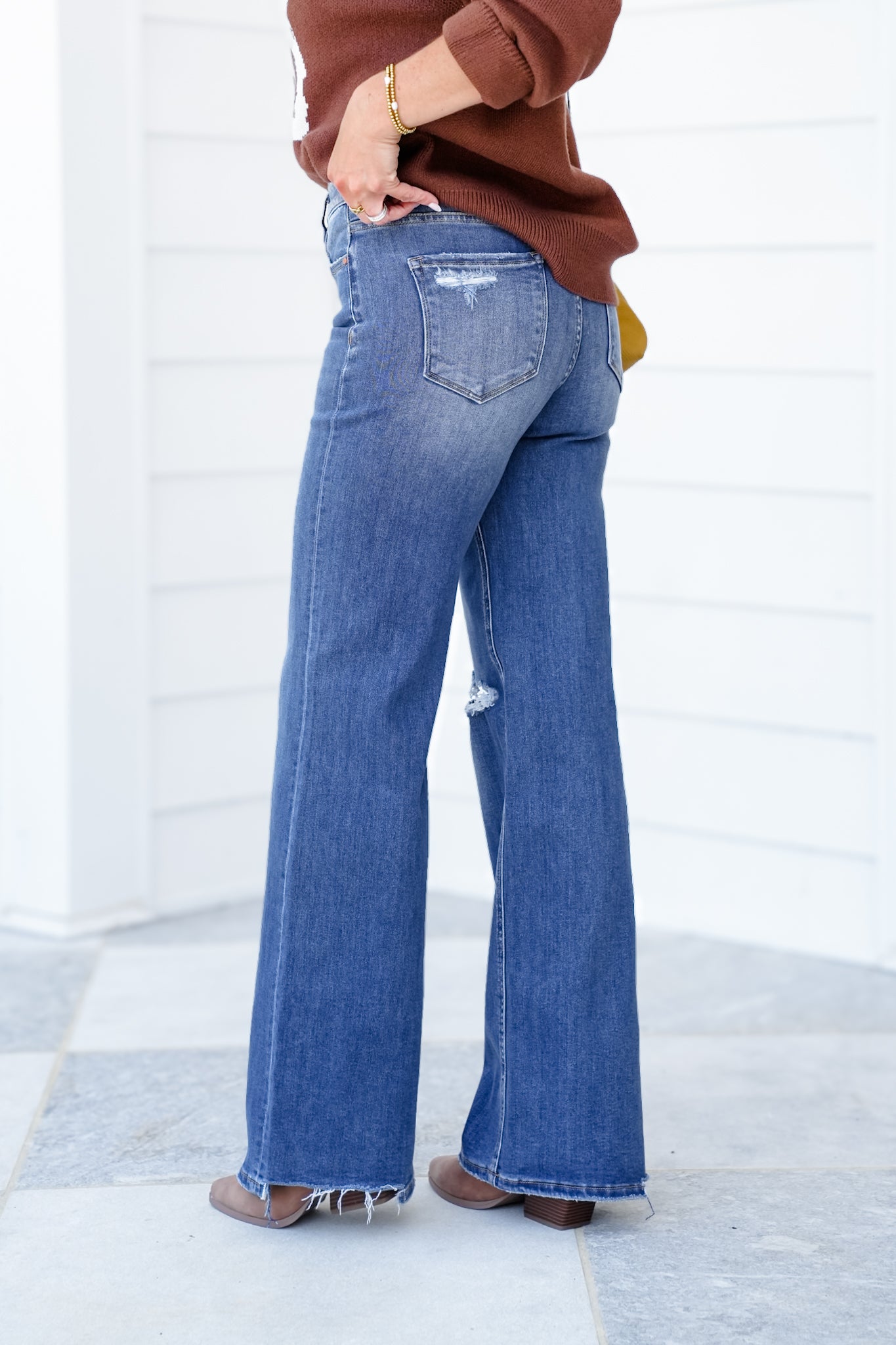 These jeans are about to become the MVP of your closet! Designed with built-in tummy control, a flattering high rise, and just the right amount of distressing at the knee, they’re a total confidence booster. The dark wash gives them a sleek, put-together feel while the wide leg silhouette adds that laid-back, trending edge.
