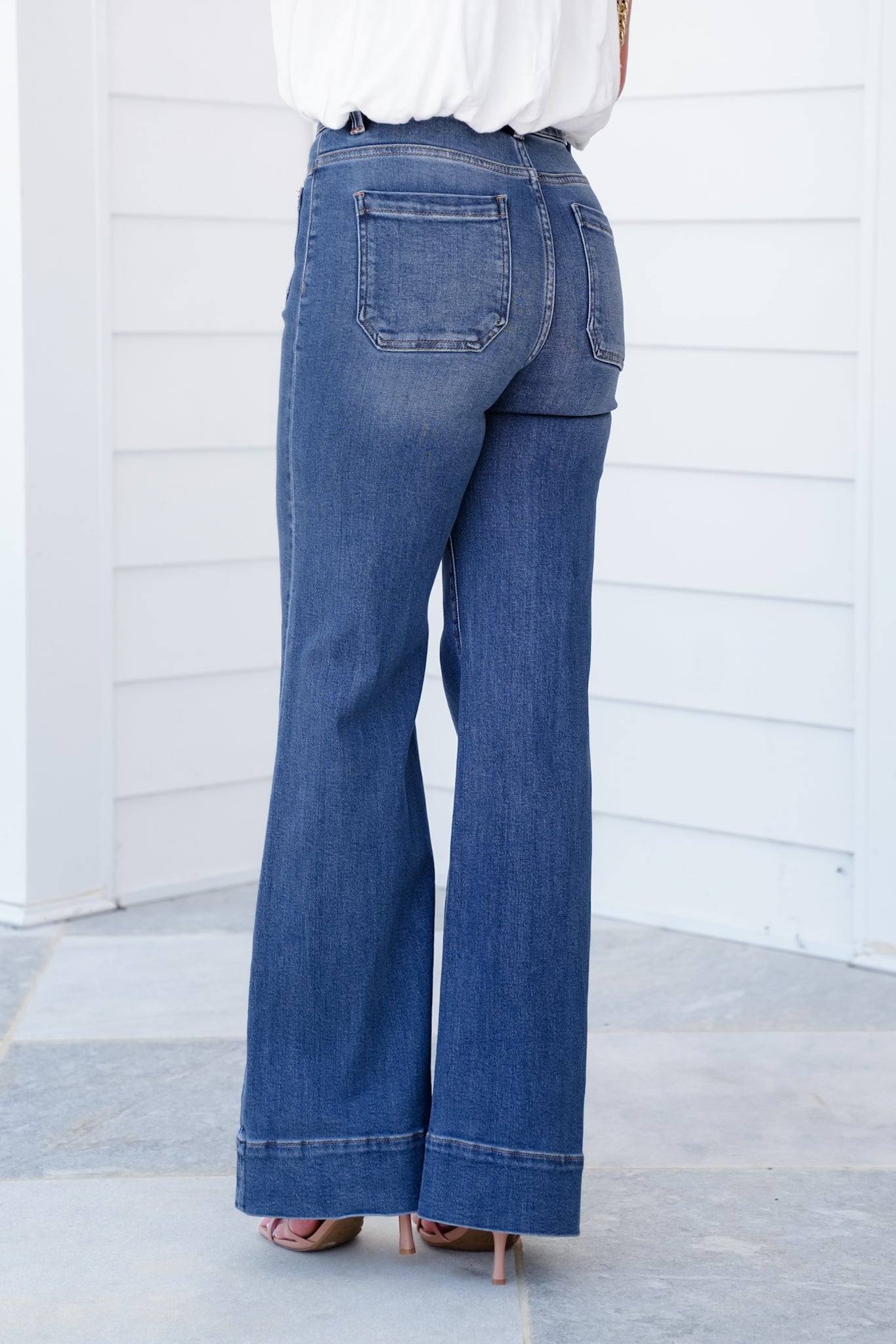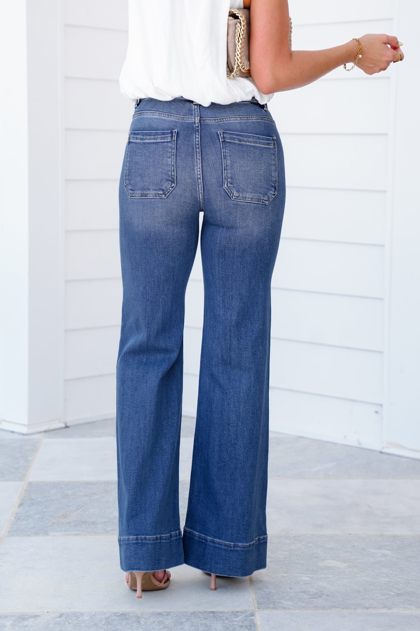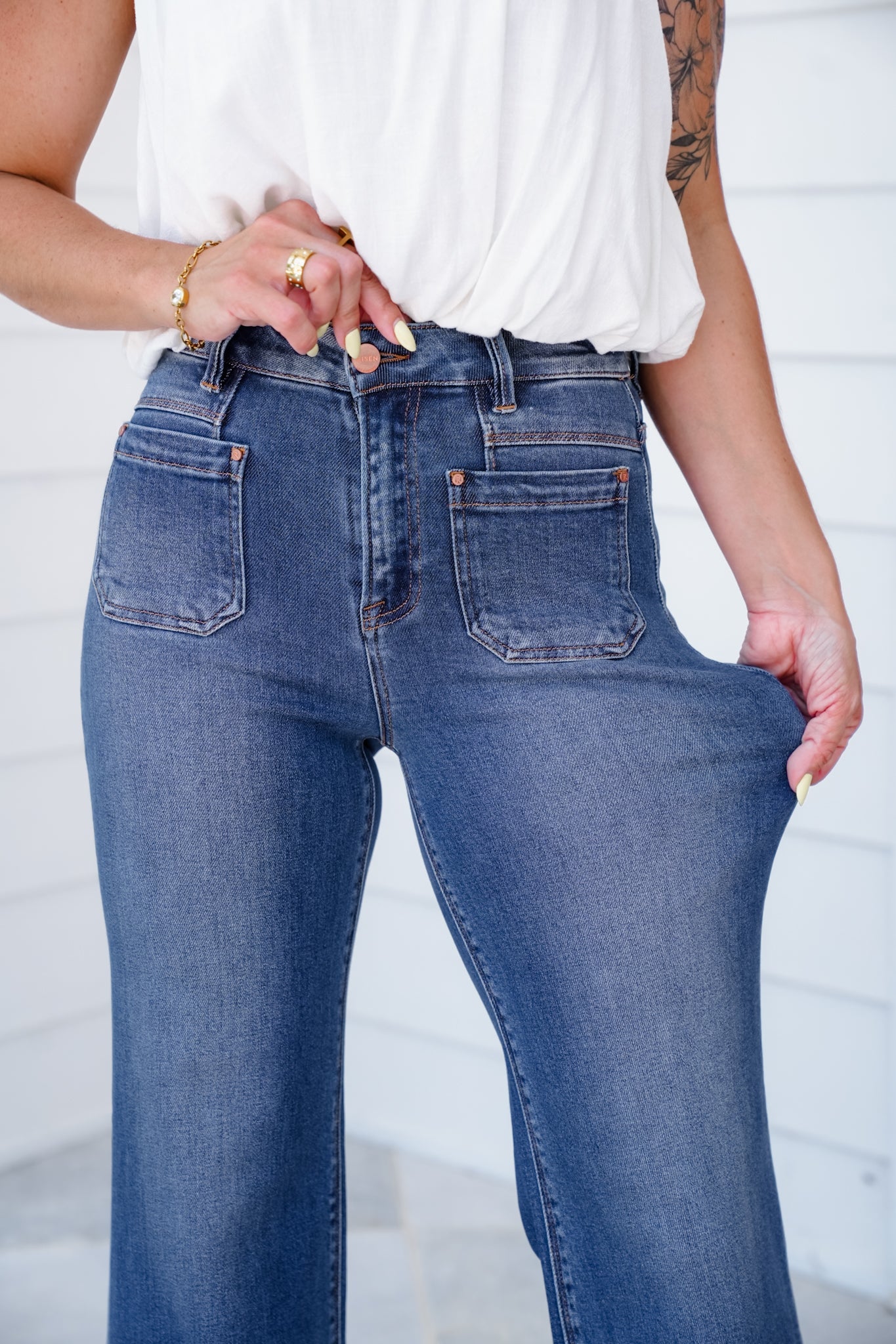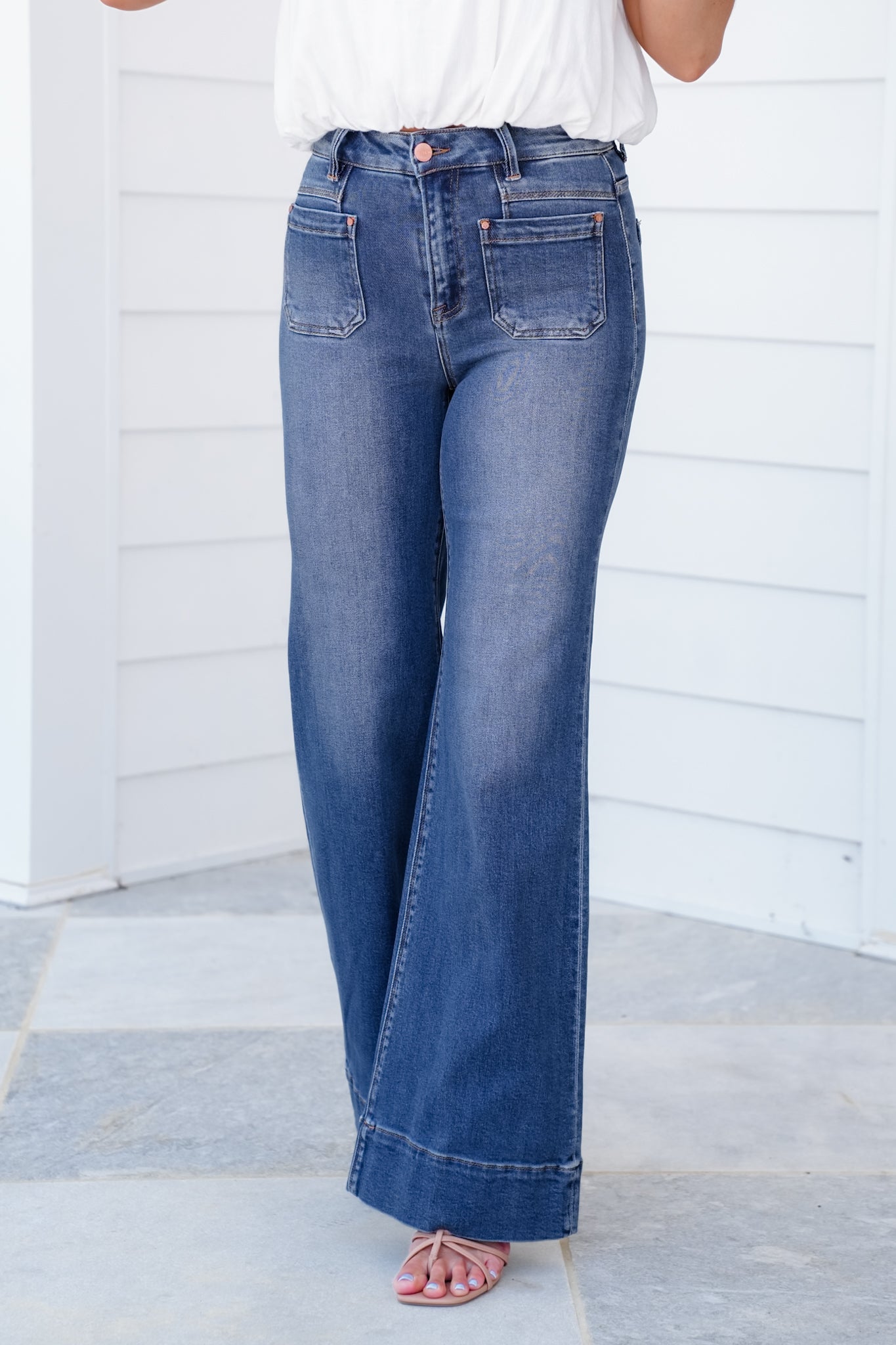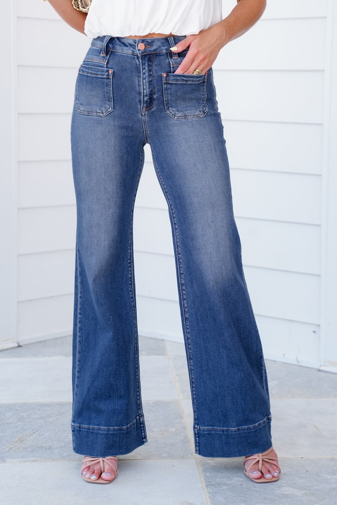 Risen High Rise Dark Wash Wide Leg Flare Jeans with Patch Pockets