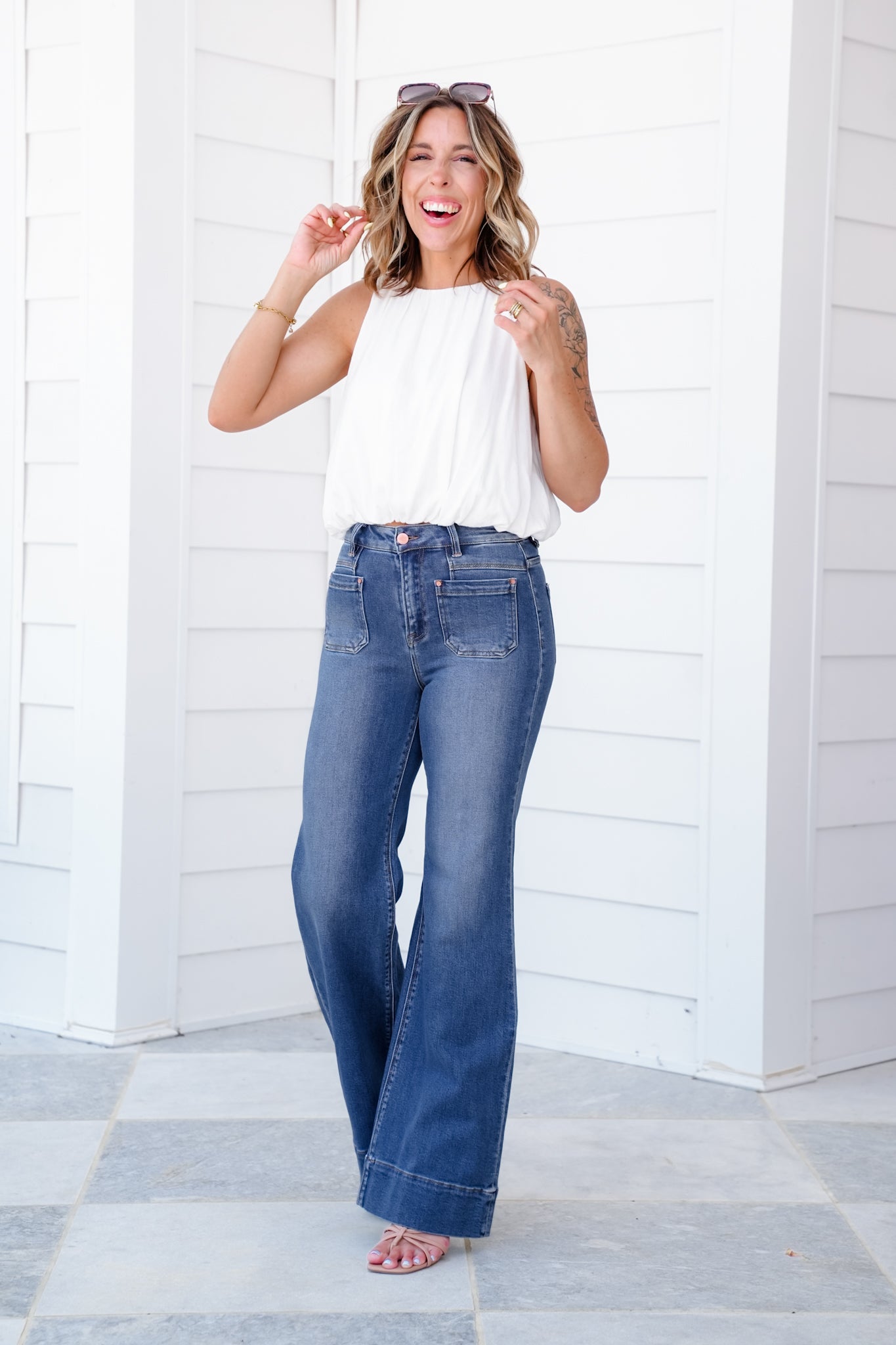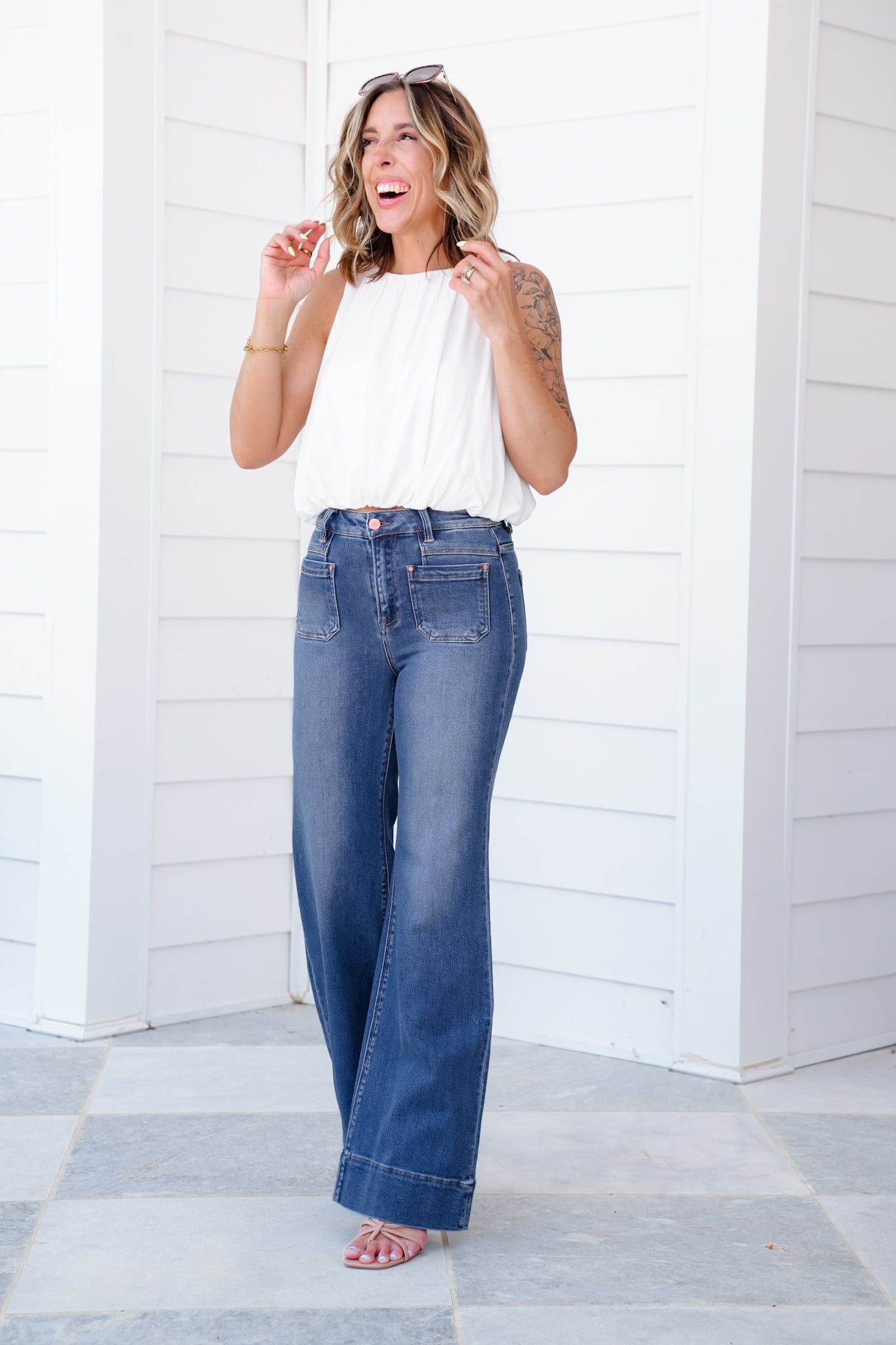 These wide leg flares are a total wardrobe game-changer. The high rise cinches in at just the right spot, while the trouser hem and clean dark wash keep the look sleek and versatile. The patch pockets give them a fun retro vibe without taking away from their polished feel.