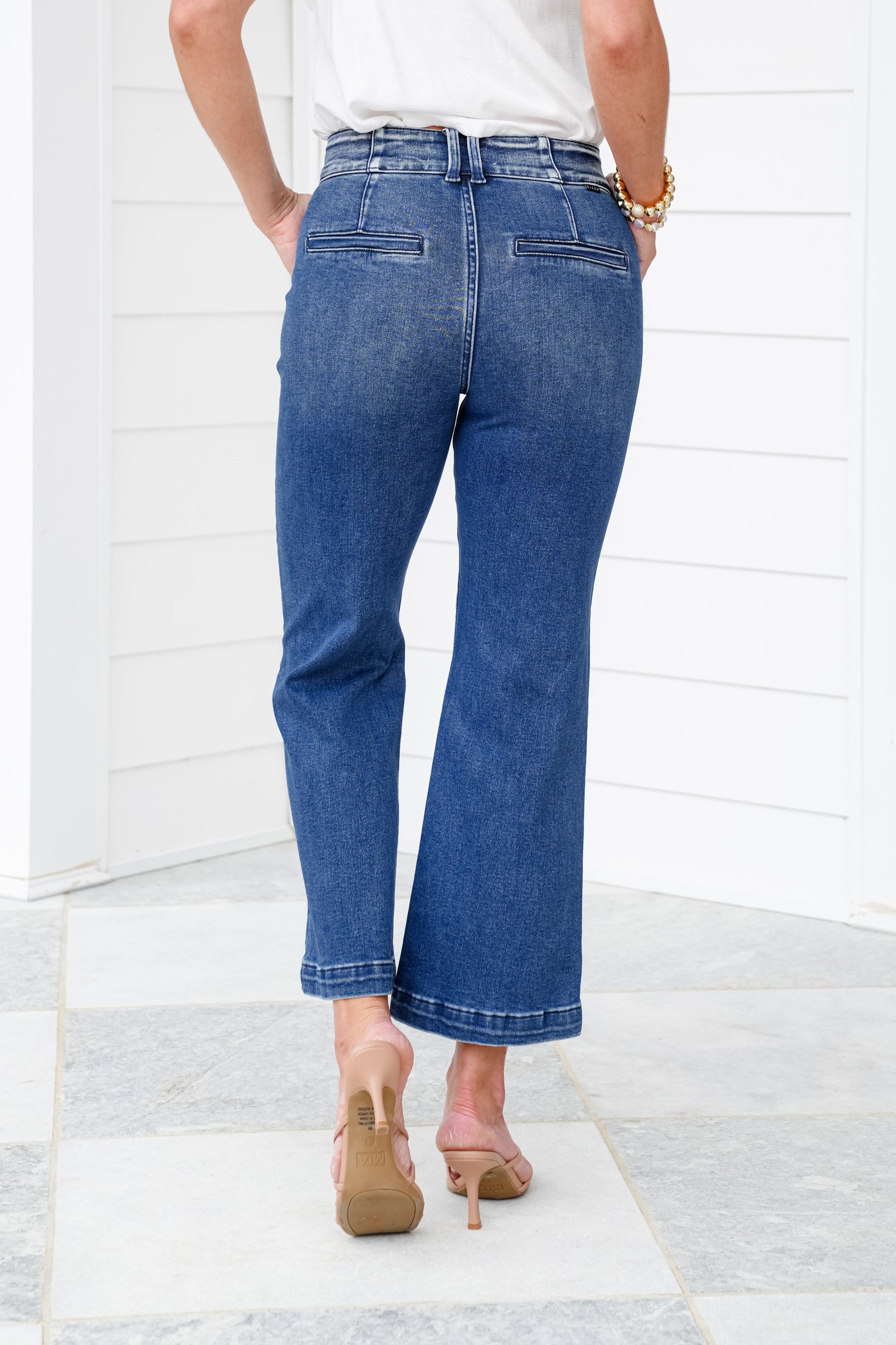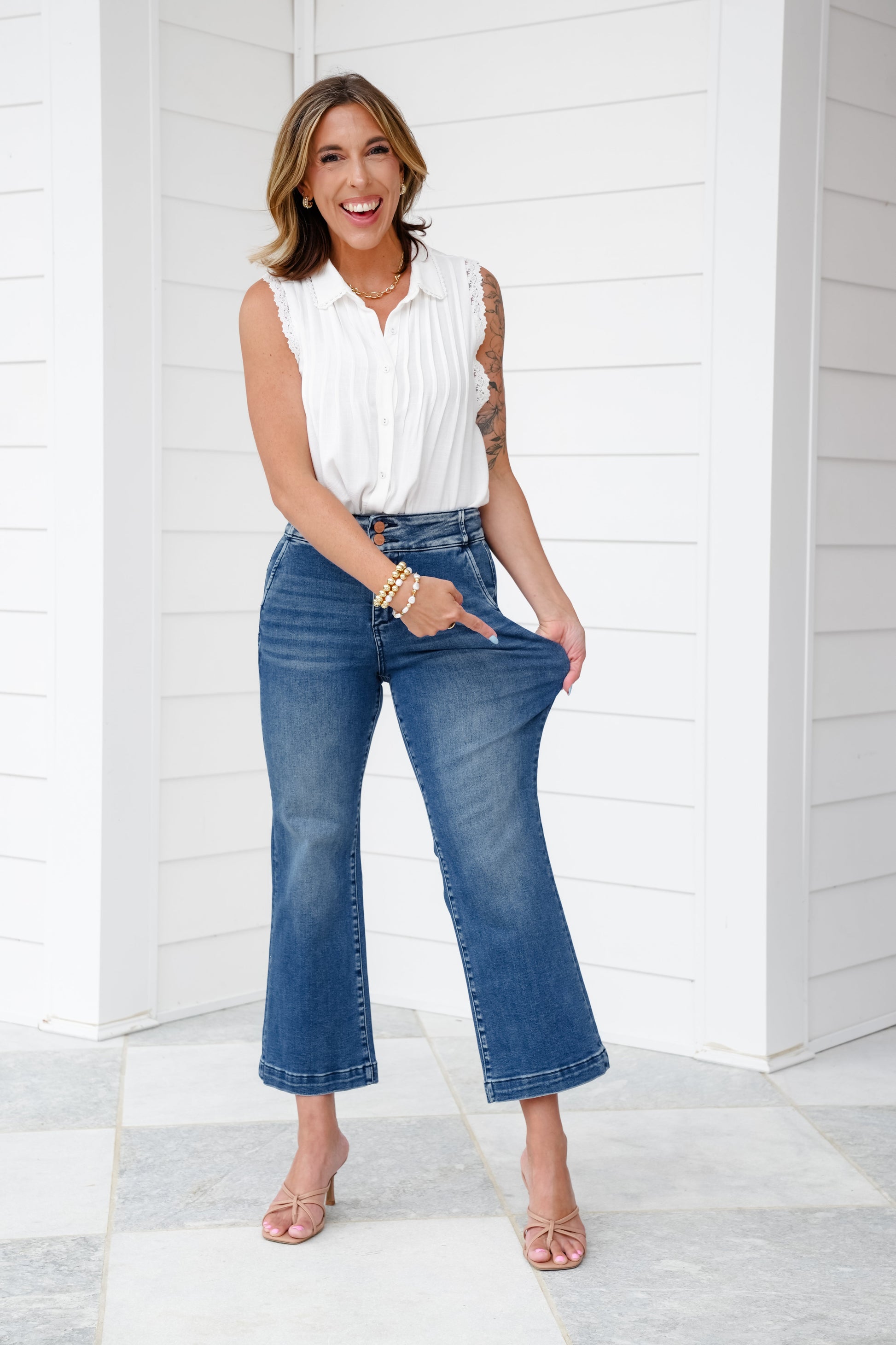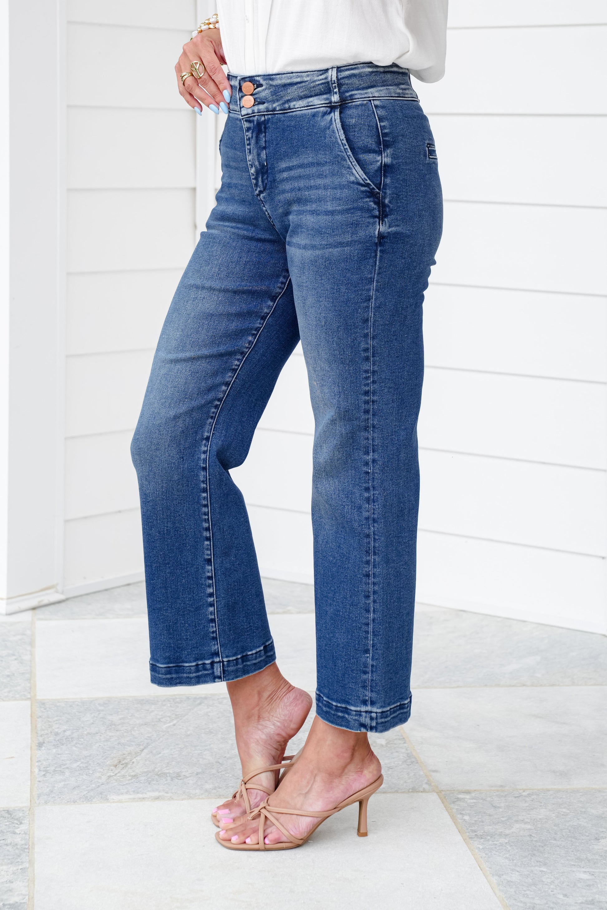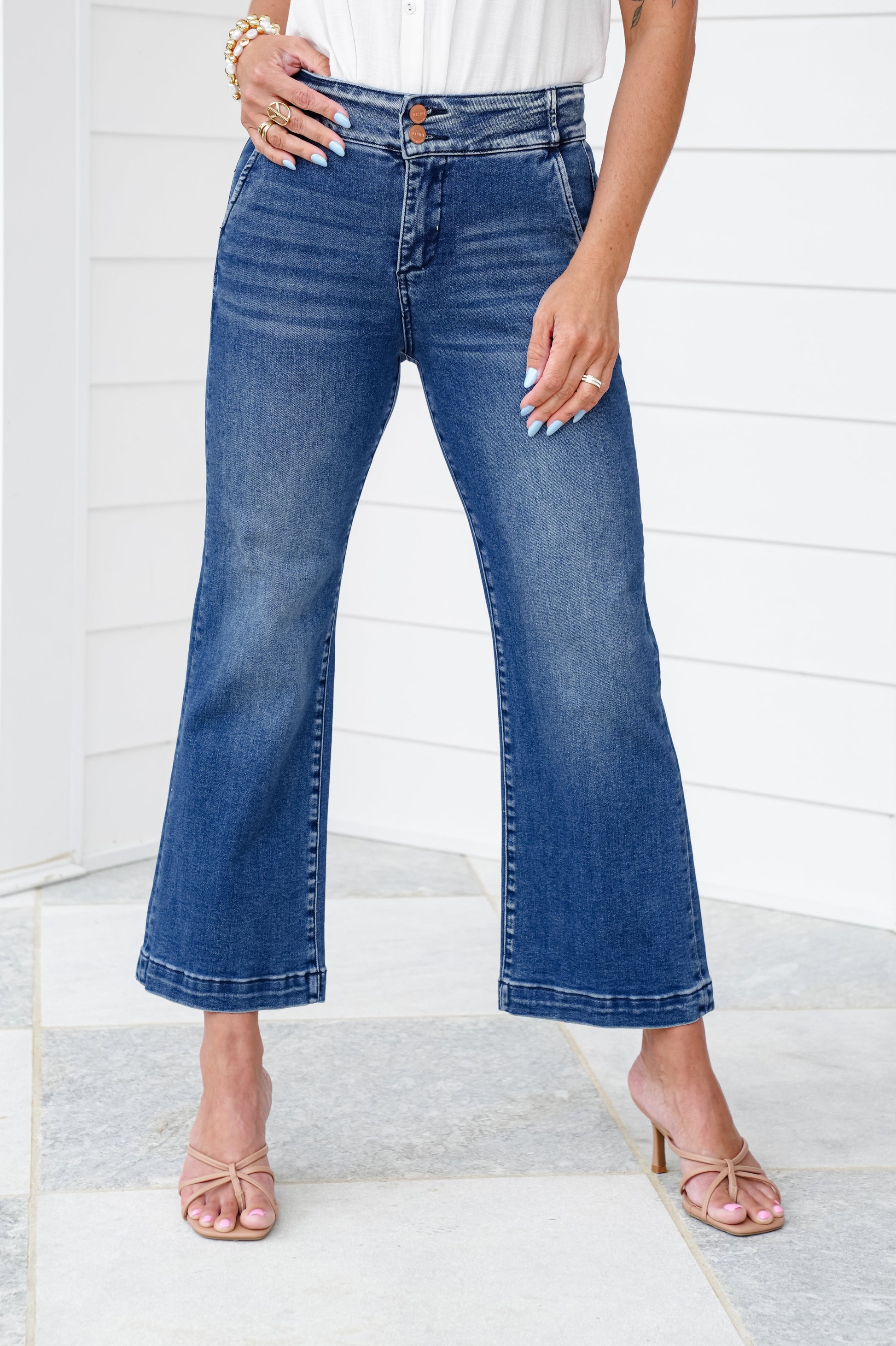 These cropped, wide leg Risen jeans are the perfect blend of comfort and style. We are obsessed with the wide waistband with double-button closure that gives these an elevated look. The high-rise and tummy control panel are magical! These have a dark wash with stunning whiskering and graining, and they are non-distressed with finished hems! The stretch of these is absolutely amazing! And the best part? They don't stretch out and keep their shape all day!