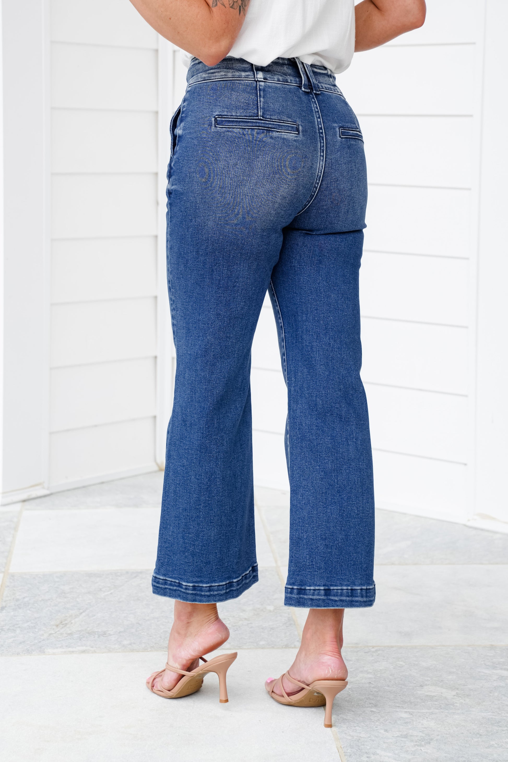 Risen High Rise Dark Wash Wide Waistband Tummy Control Cropped Wide Leg Jeans