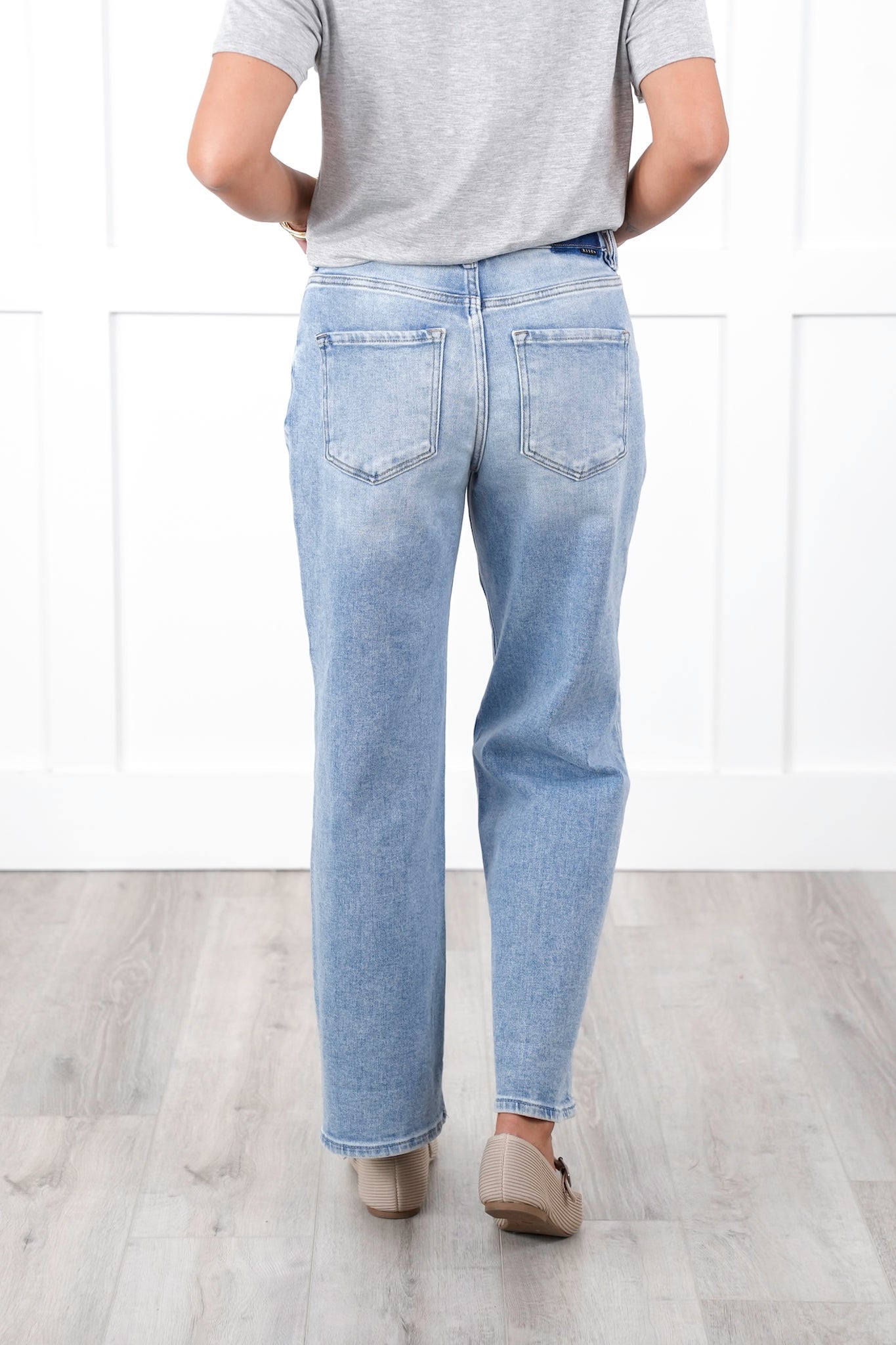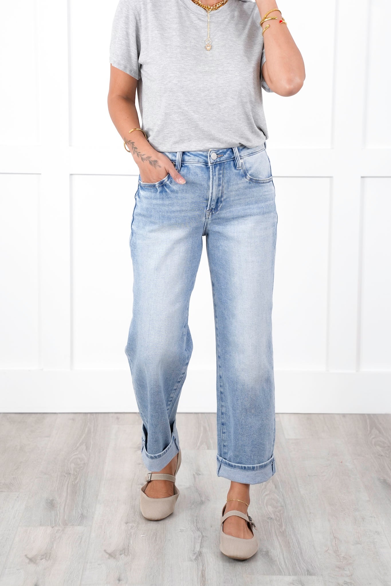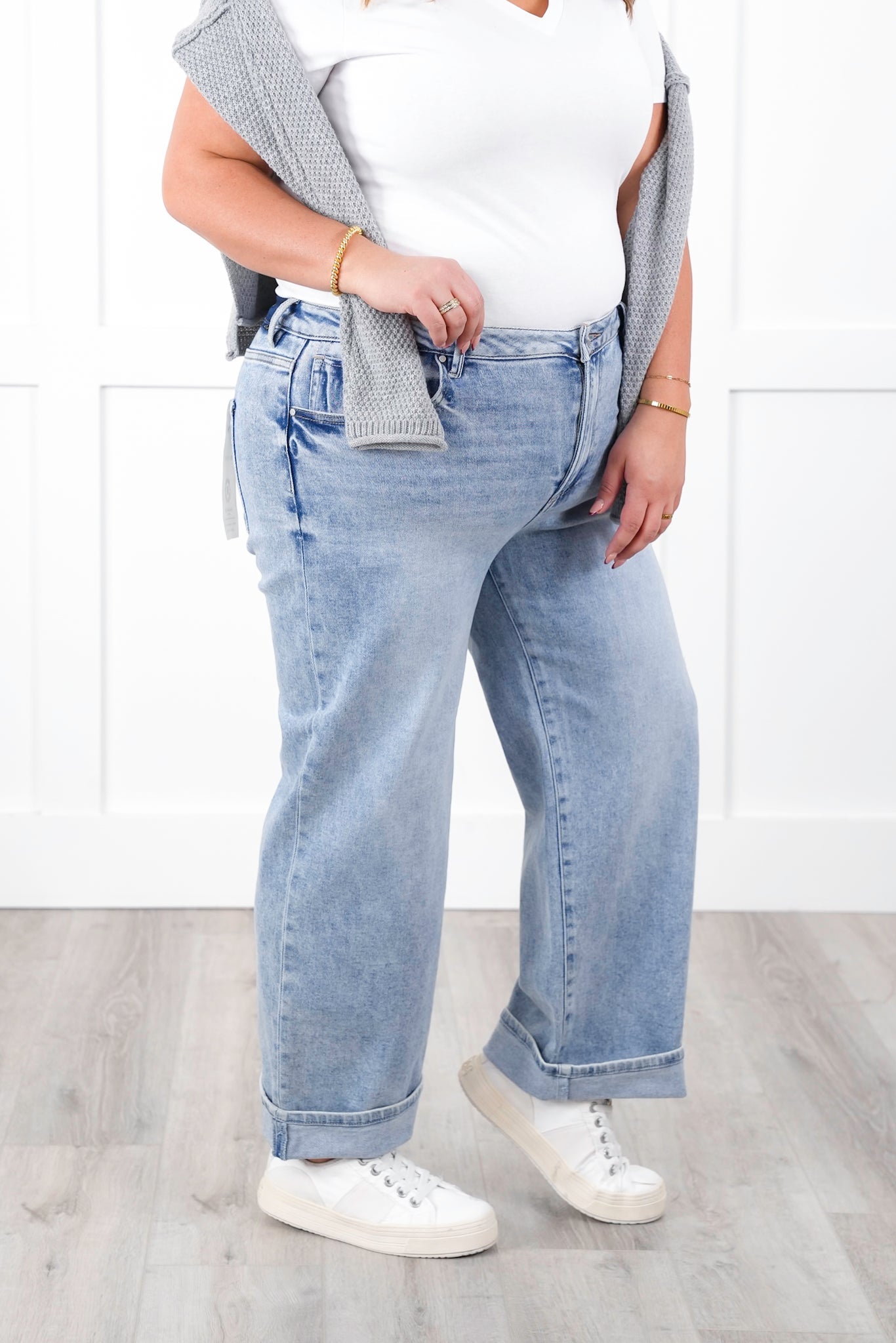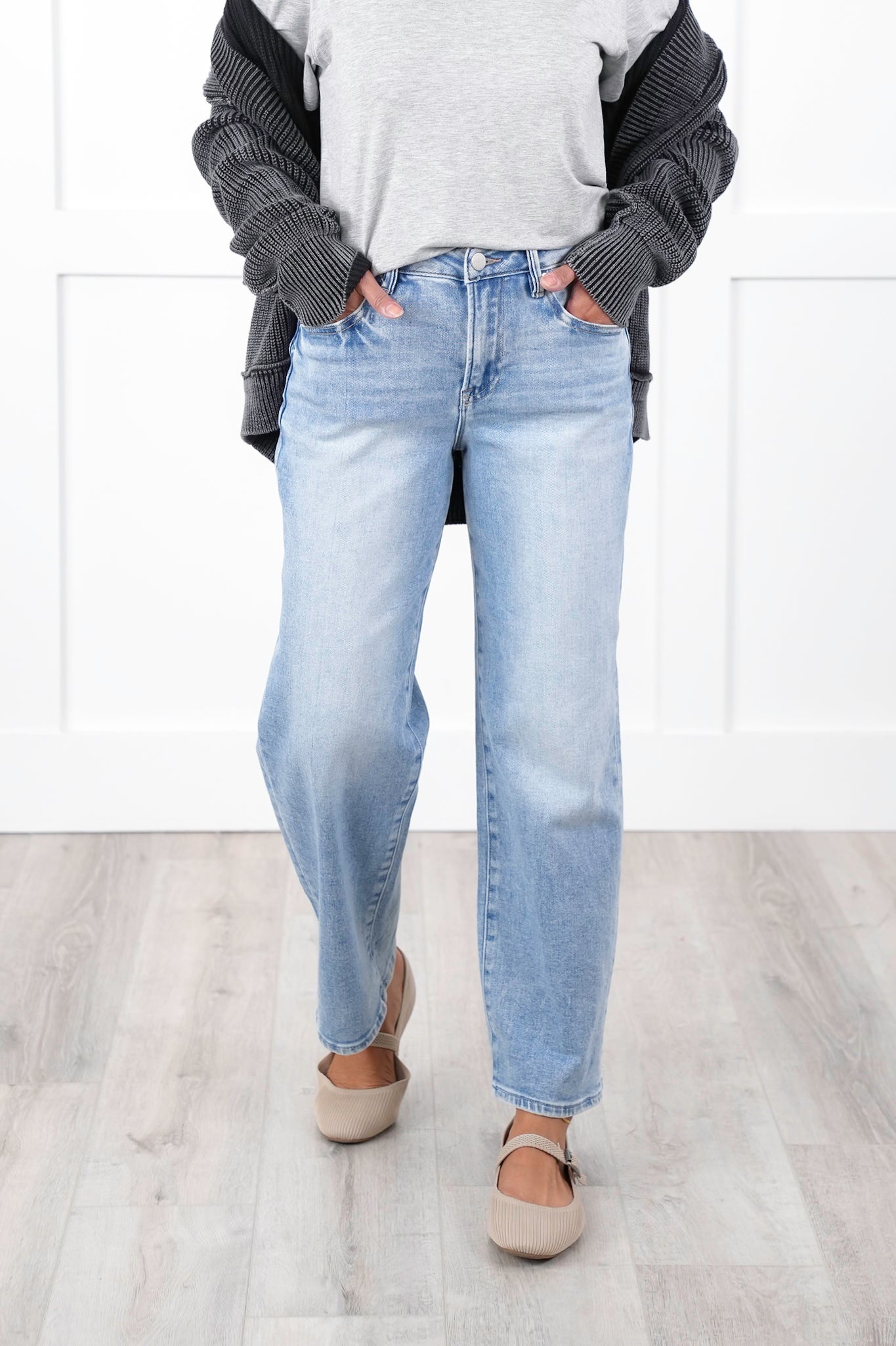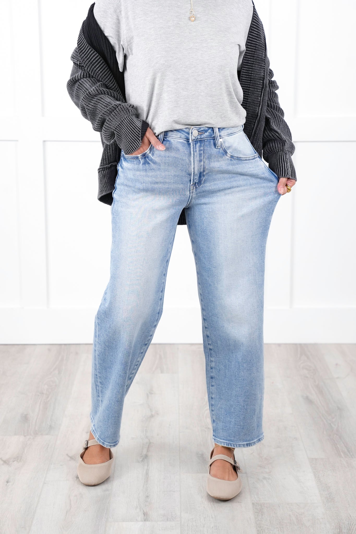 Risen High Rise Light Wash Ankle Barrel Jeans with Cuff